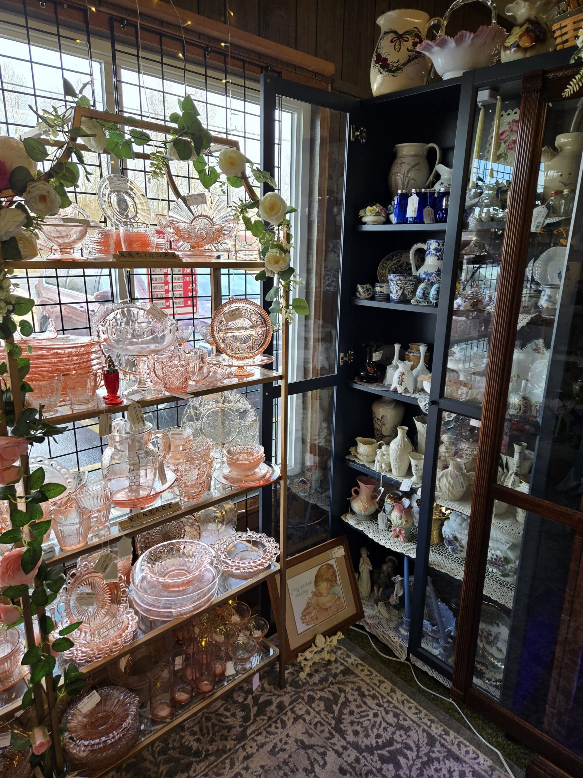 A vintage glassware and china event glows like this: shelves of pink Depression glass in hobnail and ribbed patterns, Lenox vases, blue and white transferware, cobalt bud vases, and milk glass ruffled bowls all in one place.
