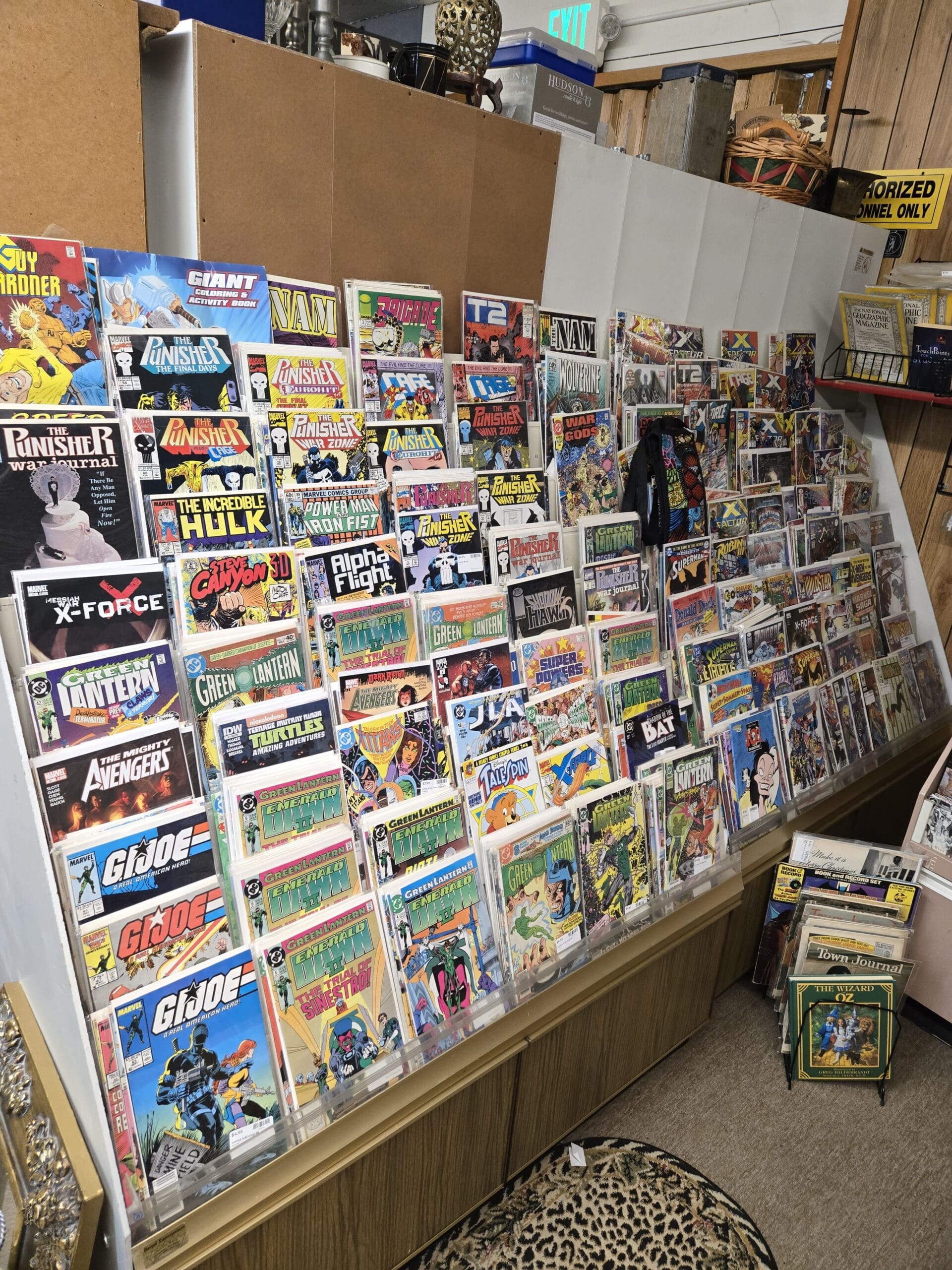 A comics event brings walls like this: bagged and boarded Punisher War Zone, Green Lantern Emerald Dawn, G.I. Joe, X-Force, Incredible Hulk, TMNT, and dozens more Marvel and DC titles ready to dig through.