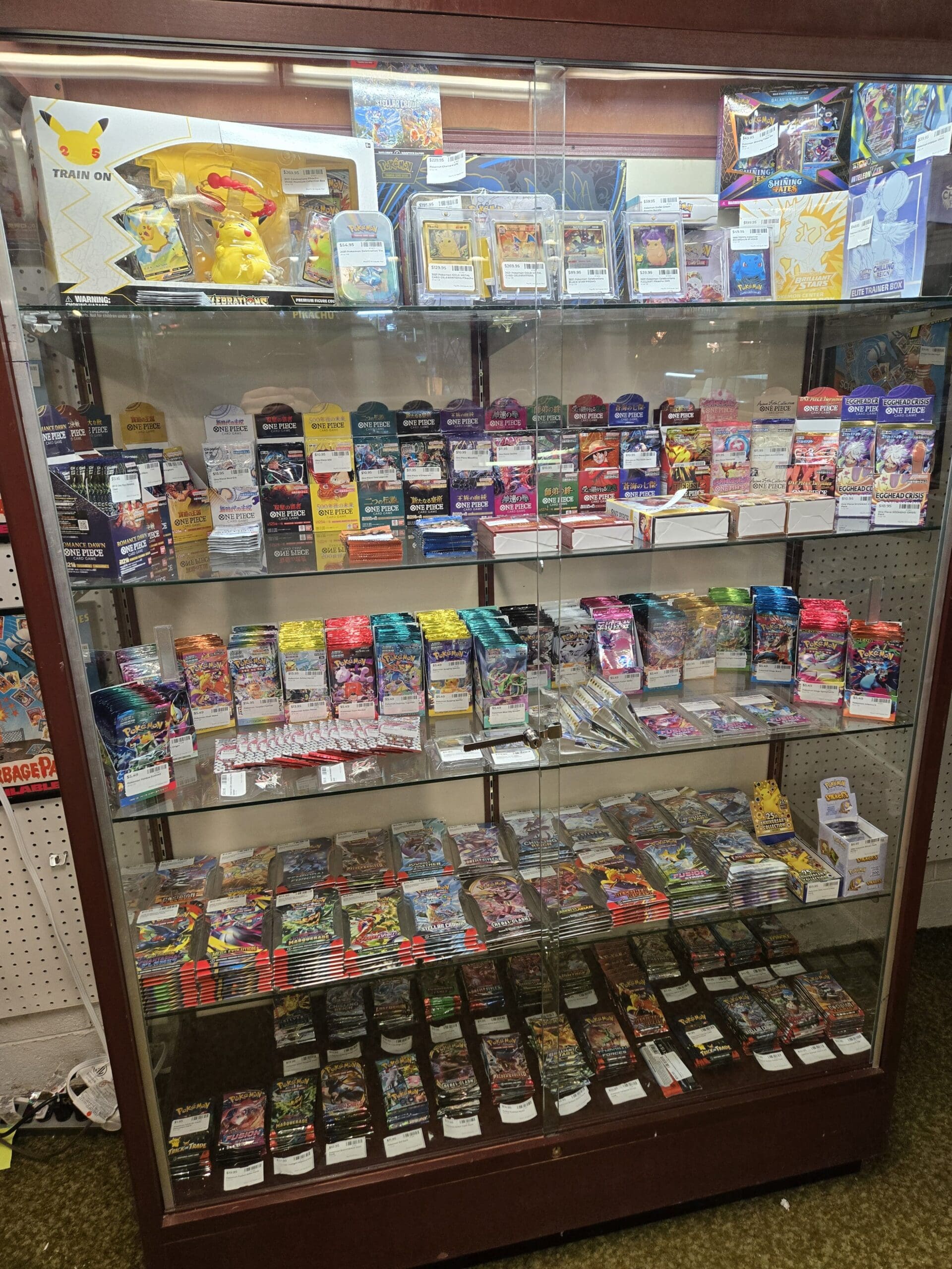 A trading card event brings out the serious collectors: Pokemon booster packs, Elite Trainer Boxes, graded card slabs, a 25th Anniversary Pikachu figure box, and One Piece TCG sets including Romance Dawn and Egghead Crisis.