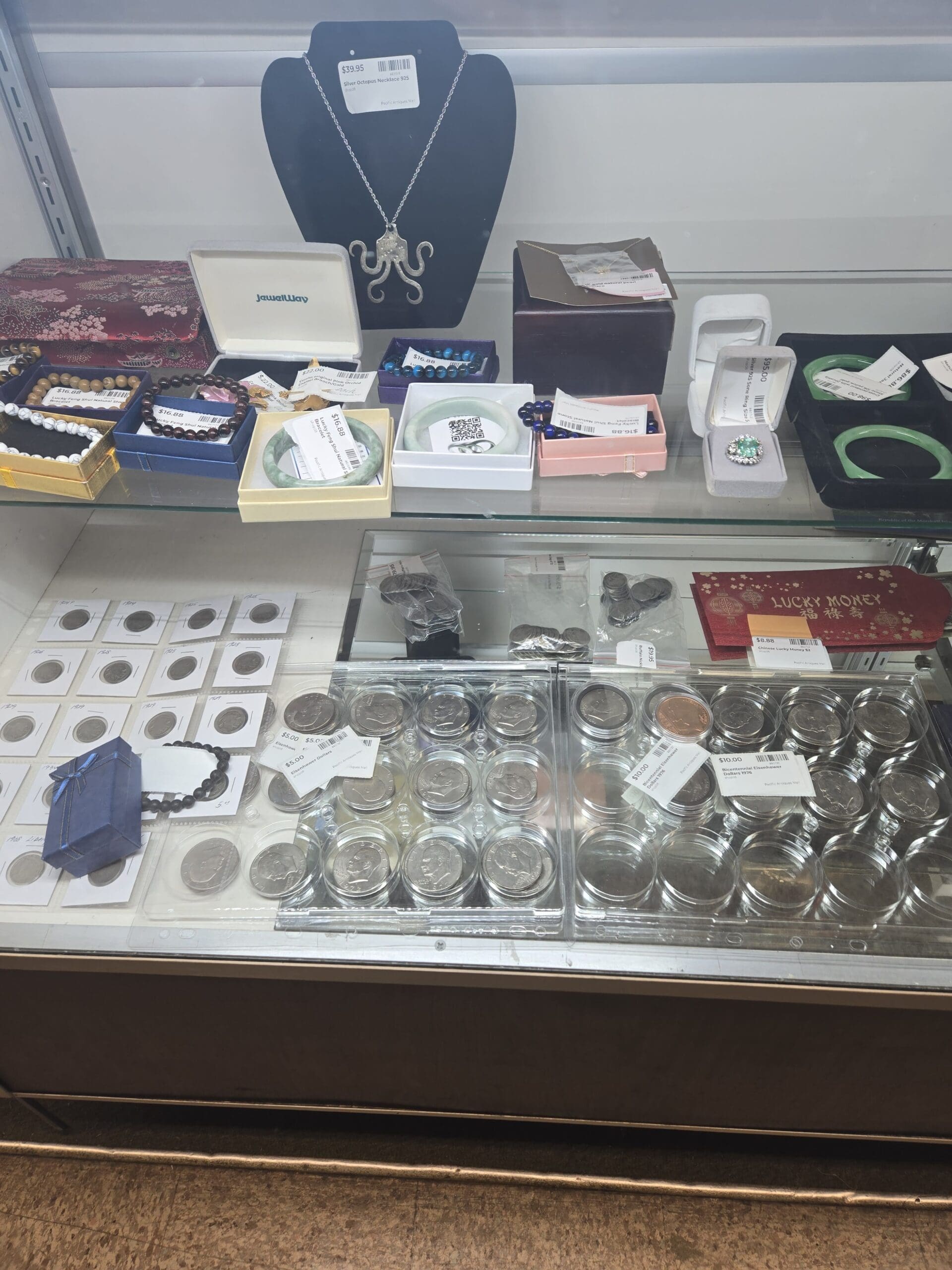 A coins and jewelry event means finds like these: jade bangles, a sterling silver octopus necklace, tiger's eye and pearl bracelets, and rows of Eisenhower silver dollars in acrylic capsules.