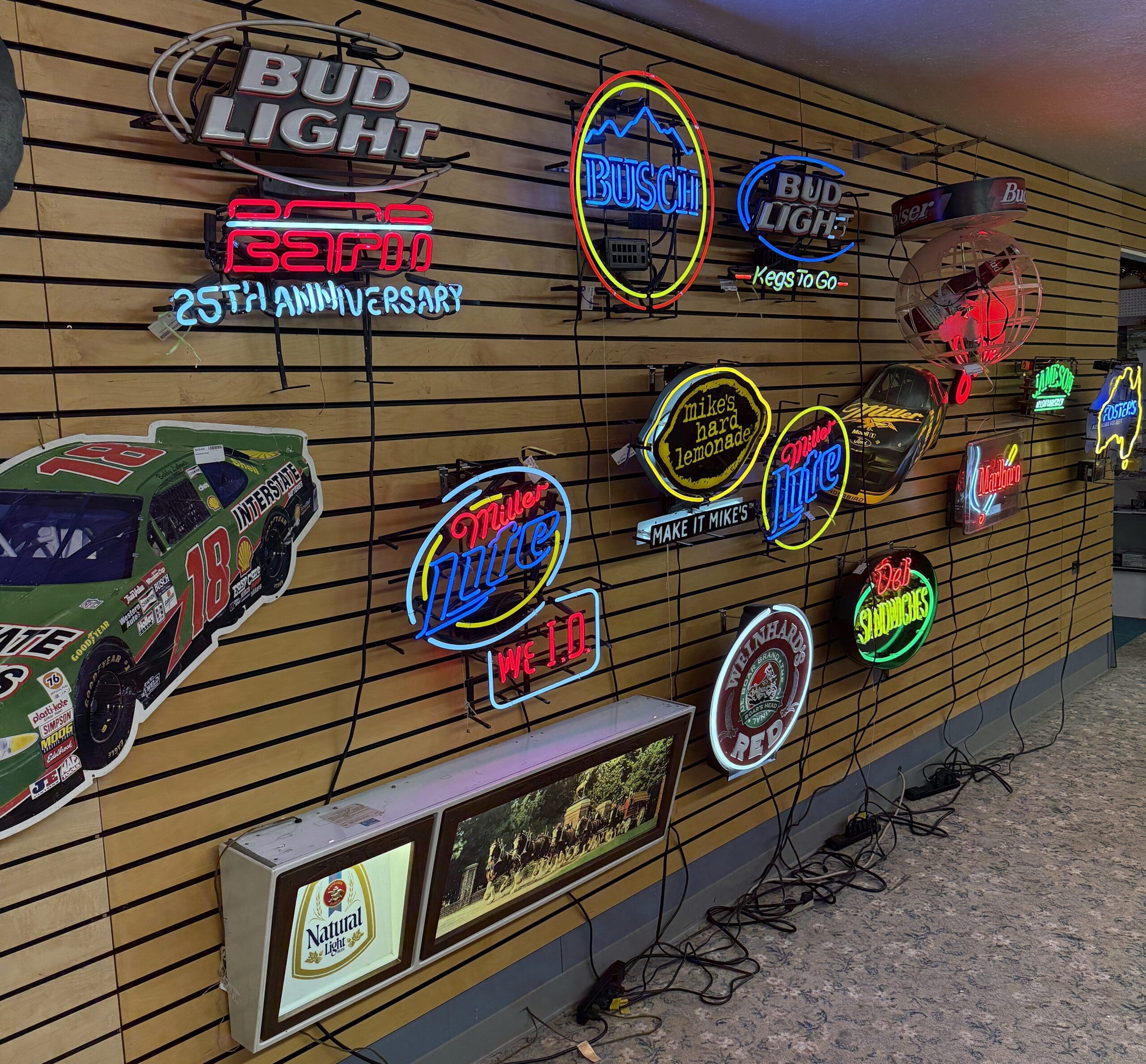 A neon signs event lights up like this: Bud Light, Busch, Miller Lite, Mike's Hard Lemonade, Weinhard's Red, Marlboro, Jameson, and a Natural Light lightbox covering the wall, with a Kyle Busch NASCAR cutout thrown in for good measure.