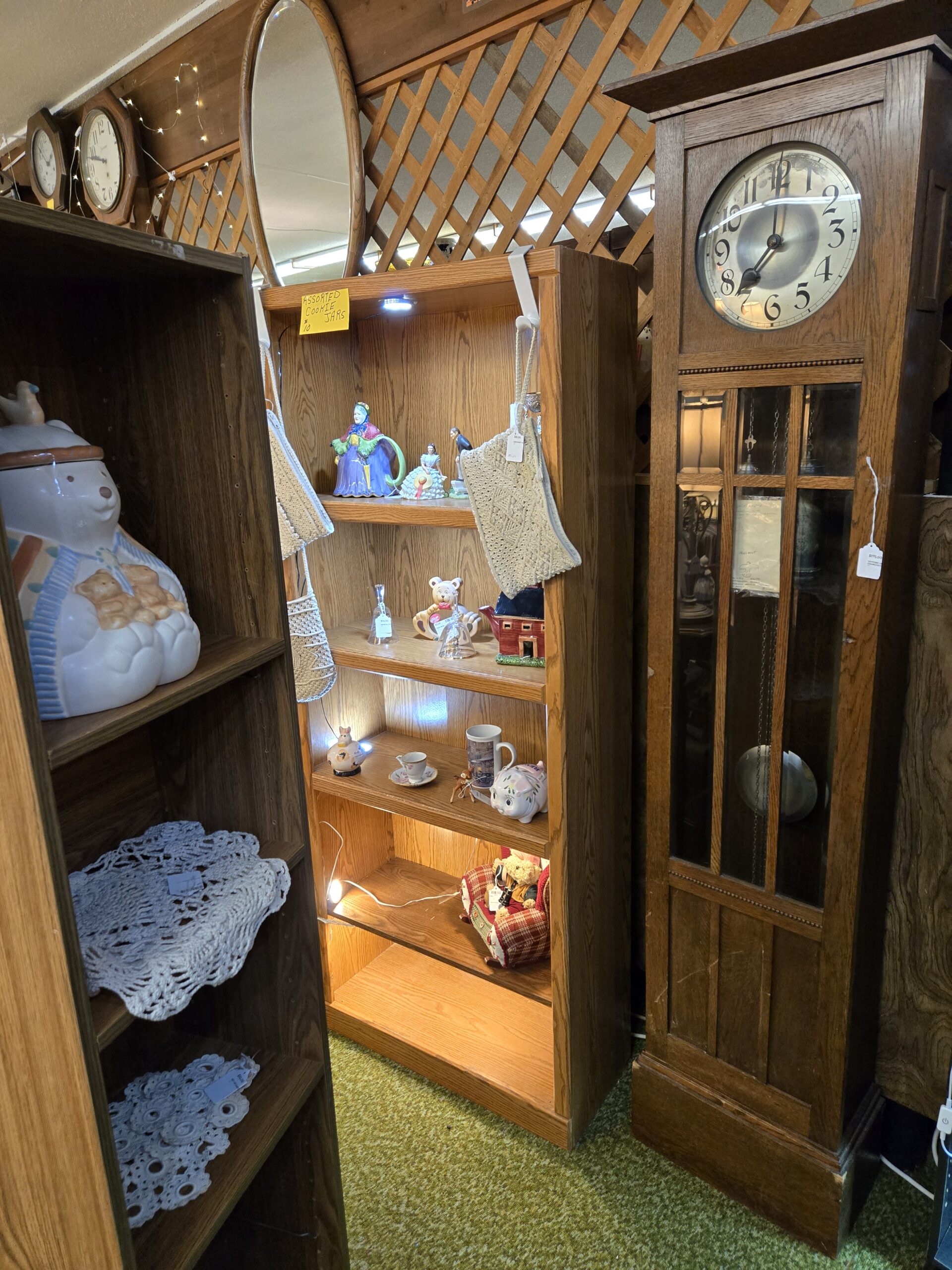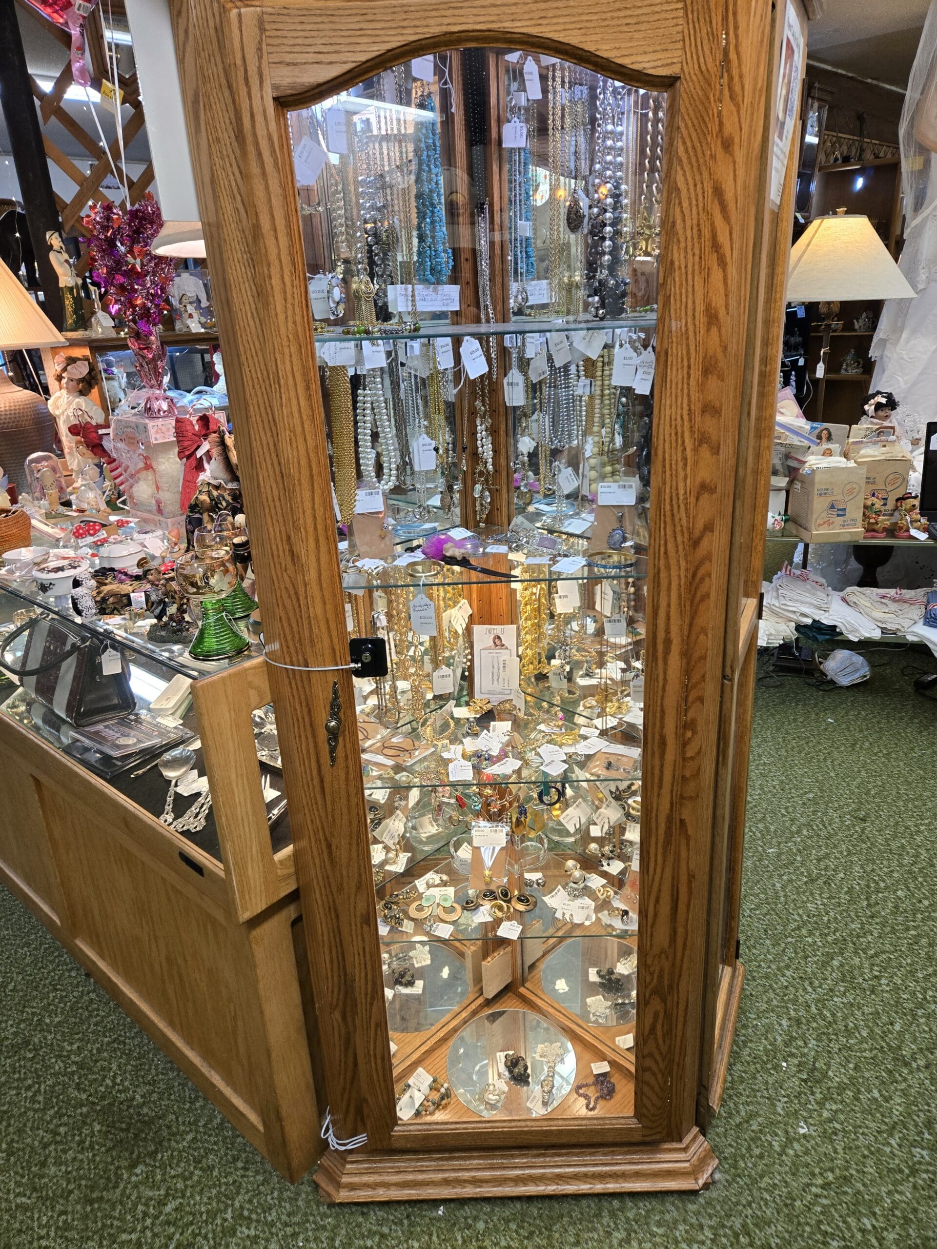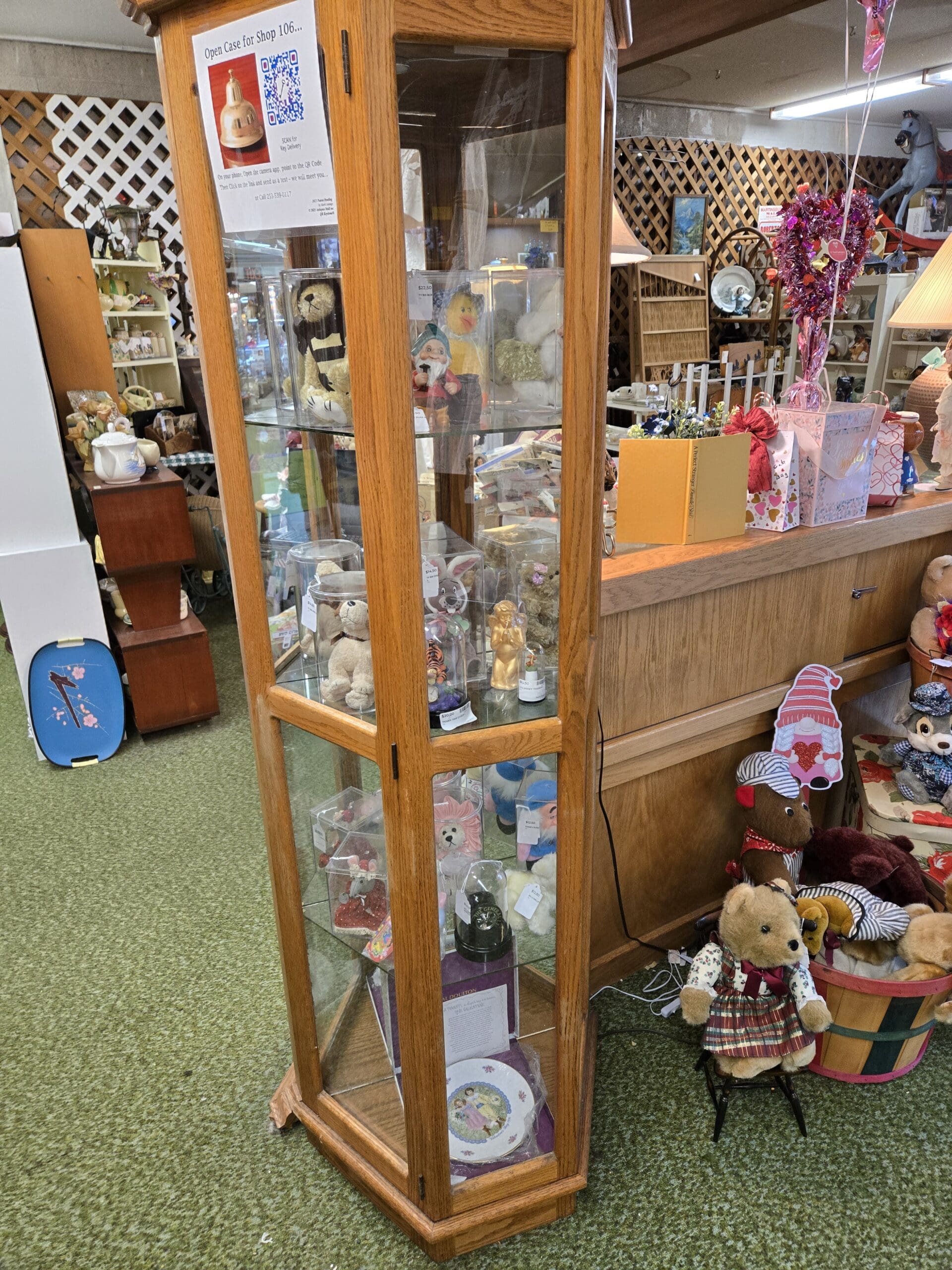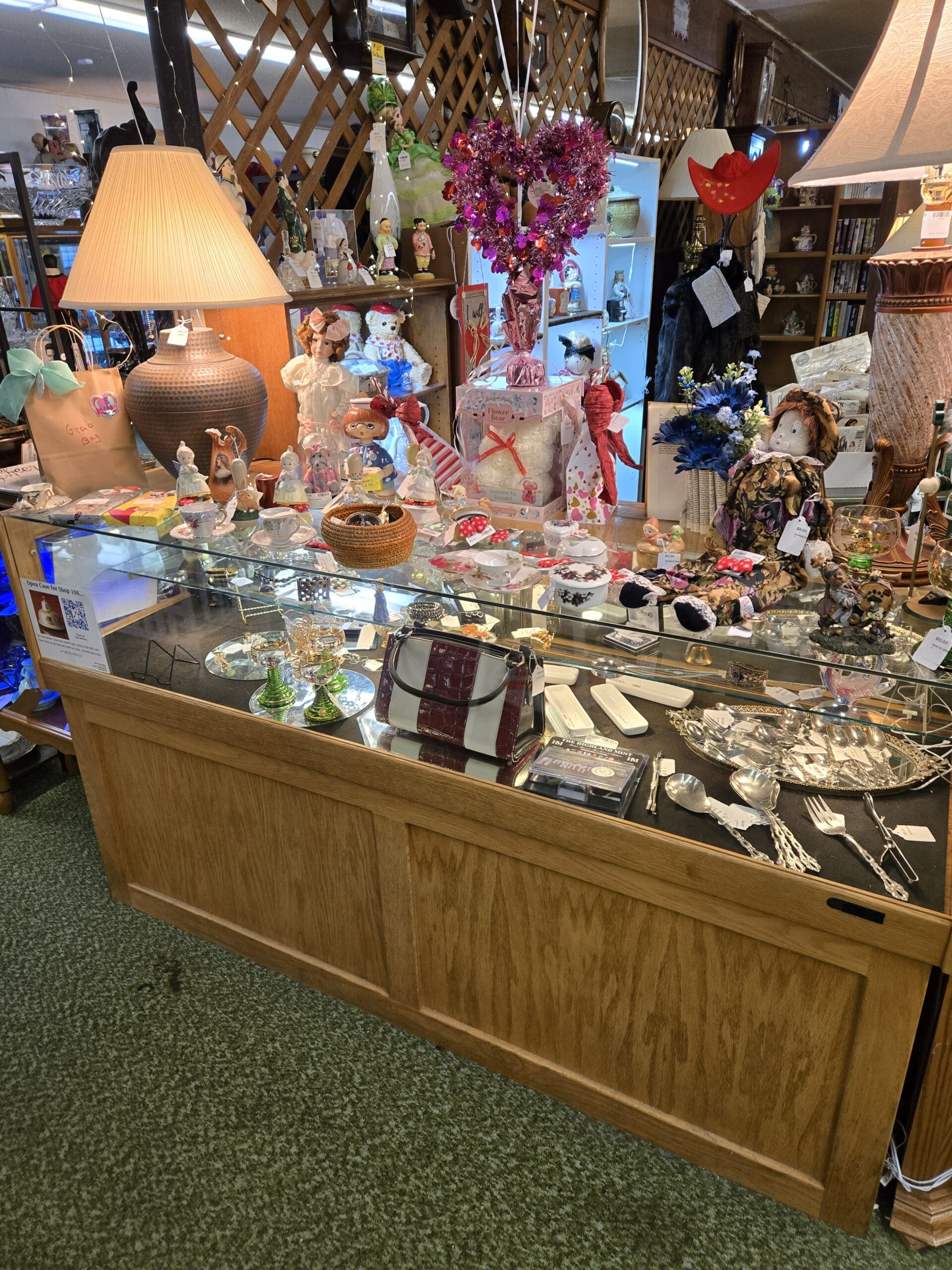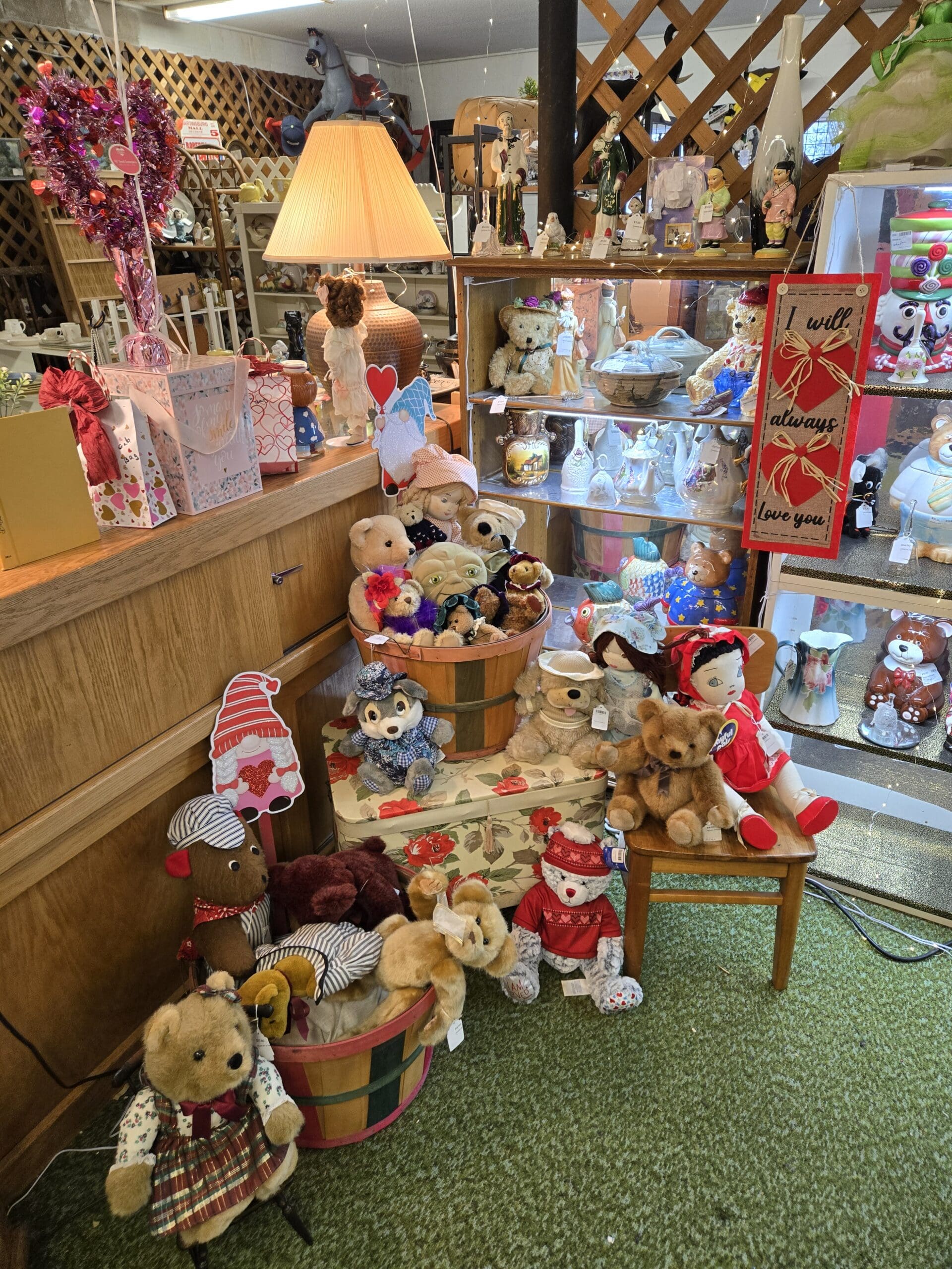 Visit Shop 106, where a love of teddy bears and all things cozy spills out from every corner. Plush bears in every size fill bushel baskets and perch on tiny chairs, many dressed in handmade outfits from plaid dresses to holiday sweaters. The bear theme carries right into the ceramics, with bear-shaped cookie jars, figurines, and teapots scattered throughout. Porcelain figurines of all kinds share the shelves too, from Hummel-style children to elegant ladies in flowing gowns, along with charming handmade cloth dolls. A tall lighted jewelry cabinet holds a lovely collection of vintage jewelry, with necklaces in turquoise, pearl, silver, and gold tones hanging on full display.