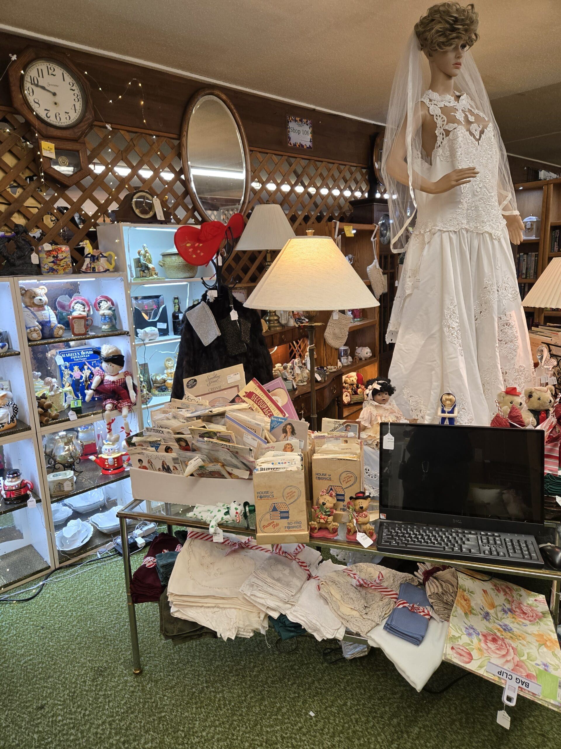 The front counter sparkles with silver-plated flatware and serving pieces, delicate glass candleholders, and a vintage handbag with a crocodile-embossed finish. Religious figurines stand alongside whimsical cookie jars and novelty ceramics, while a striking vintage wedding gown on a full mannequin catches the eye from across the aisle. Beneath it, you'll find stacks of vintage sewing patterns from Butterick, McCall's, and Vogue, plus crocheted doilies and vintage linens in white and soft pastels.