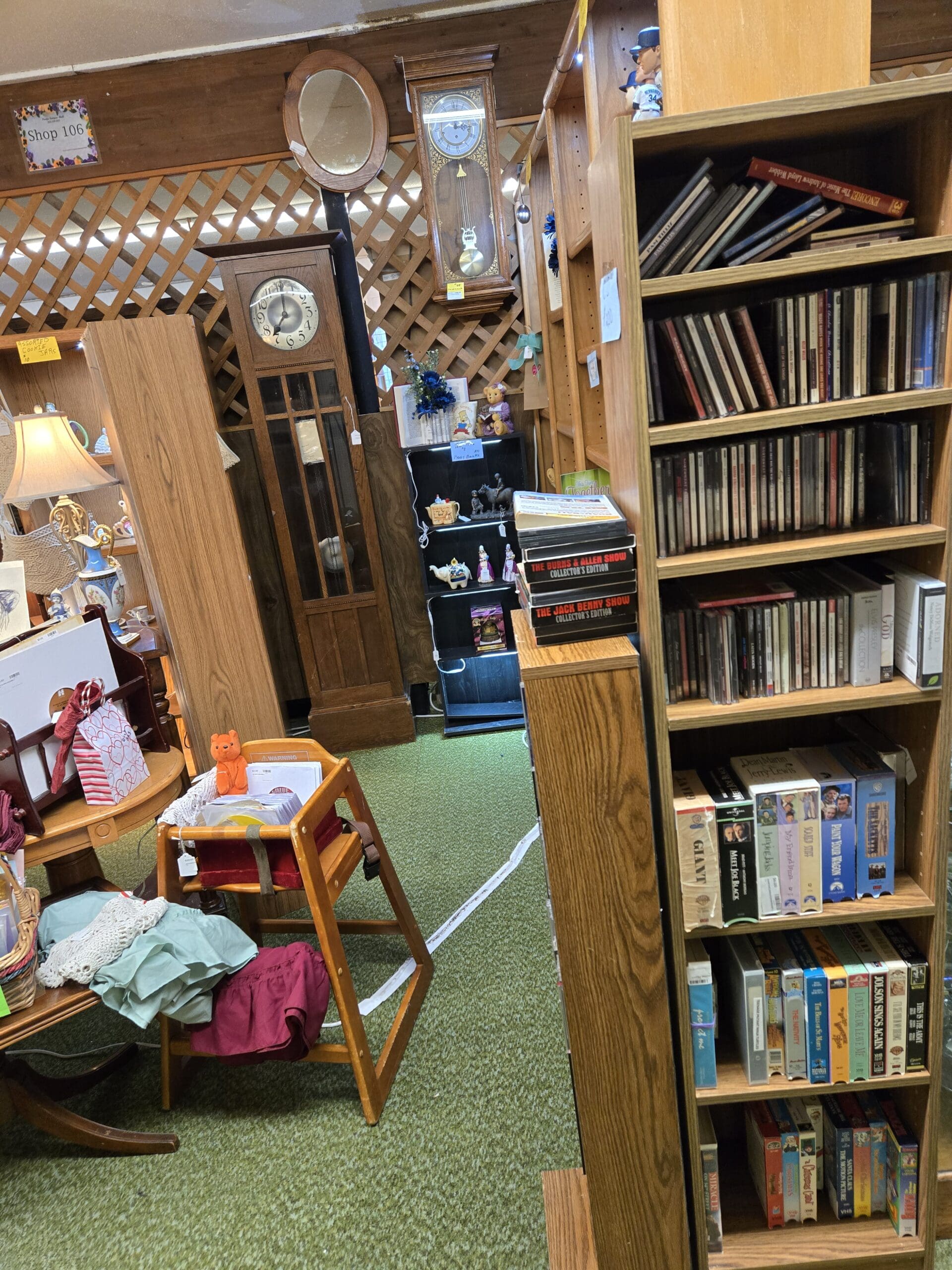 Toward the back, floor-to-ceiling bookshelves hold a deep selection of books, DVDs, VHS tapes, and classic TV collector's editions like The Burns & Allen Show and The Jack Benny Show. Baseball bobbleheads top the shelves, and a handsome pendulum wall clock and a tall Arts and Crafts style grandfather clock with leaded glass panels anchor the back wall. Vinyl records, greeting cards, and a vintage wooden high chair round out a shop that feels like browsing through a favorite grandmother's home.