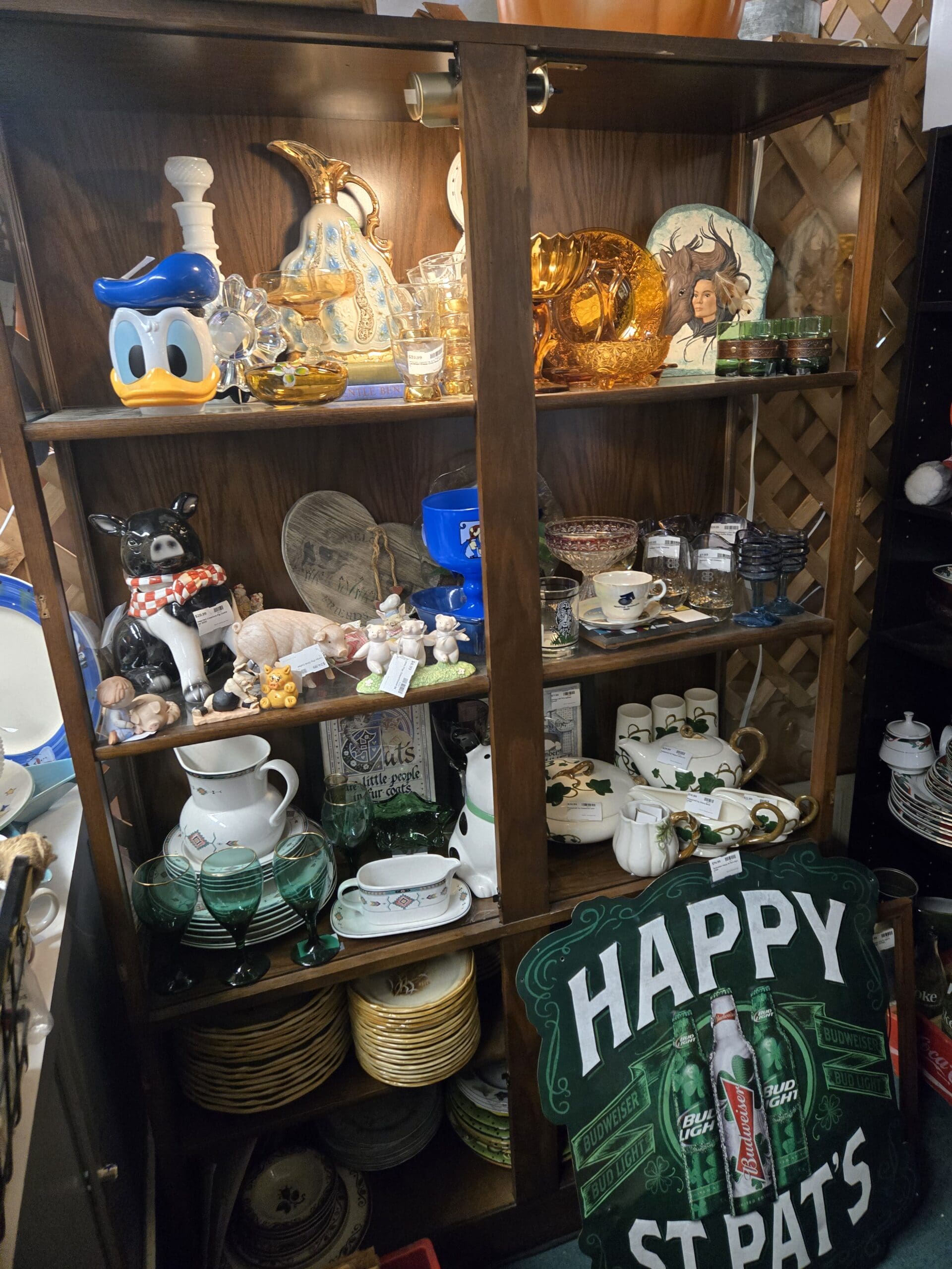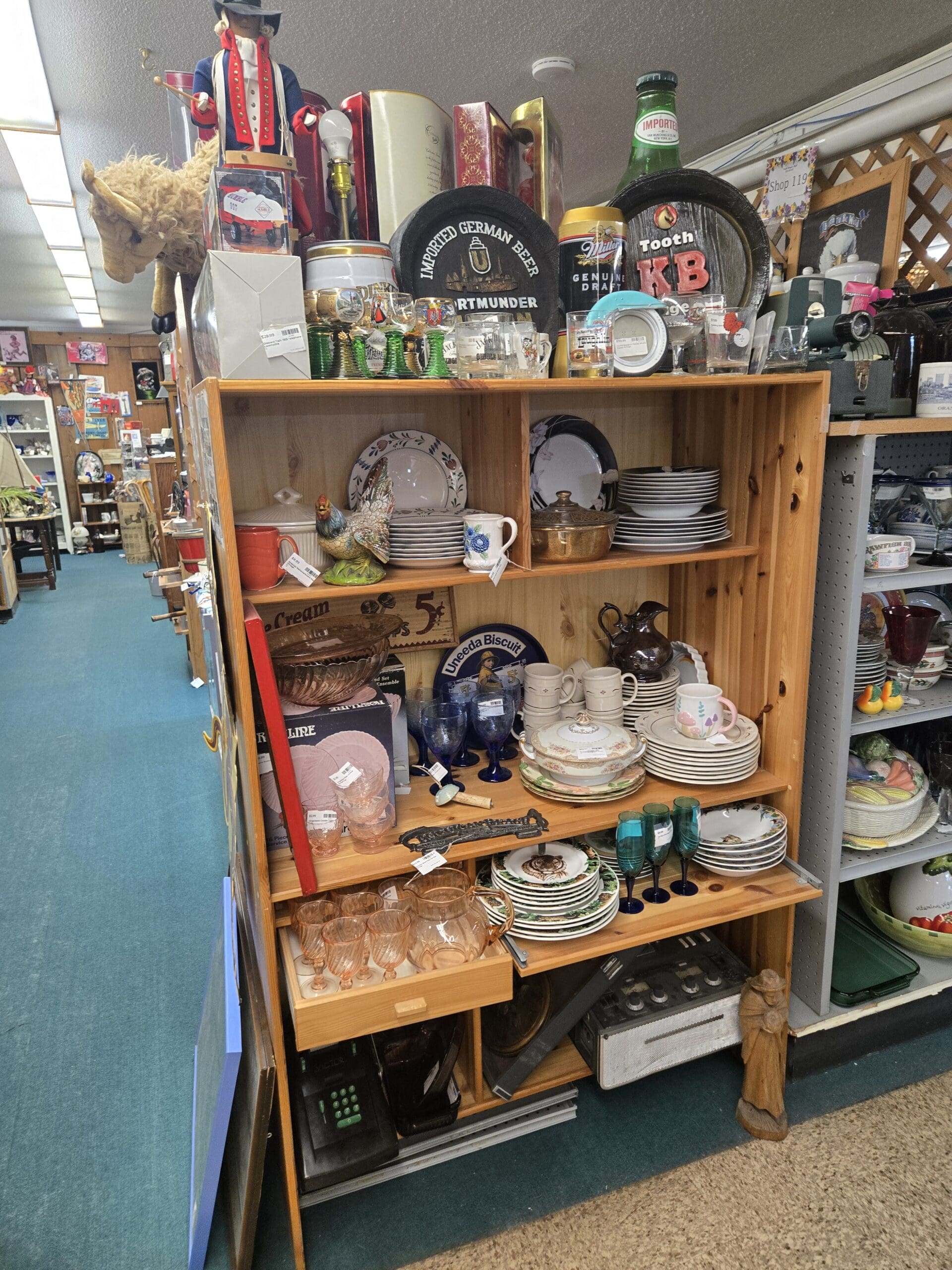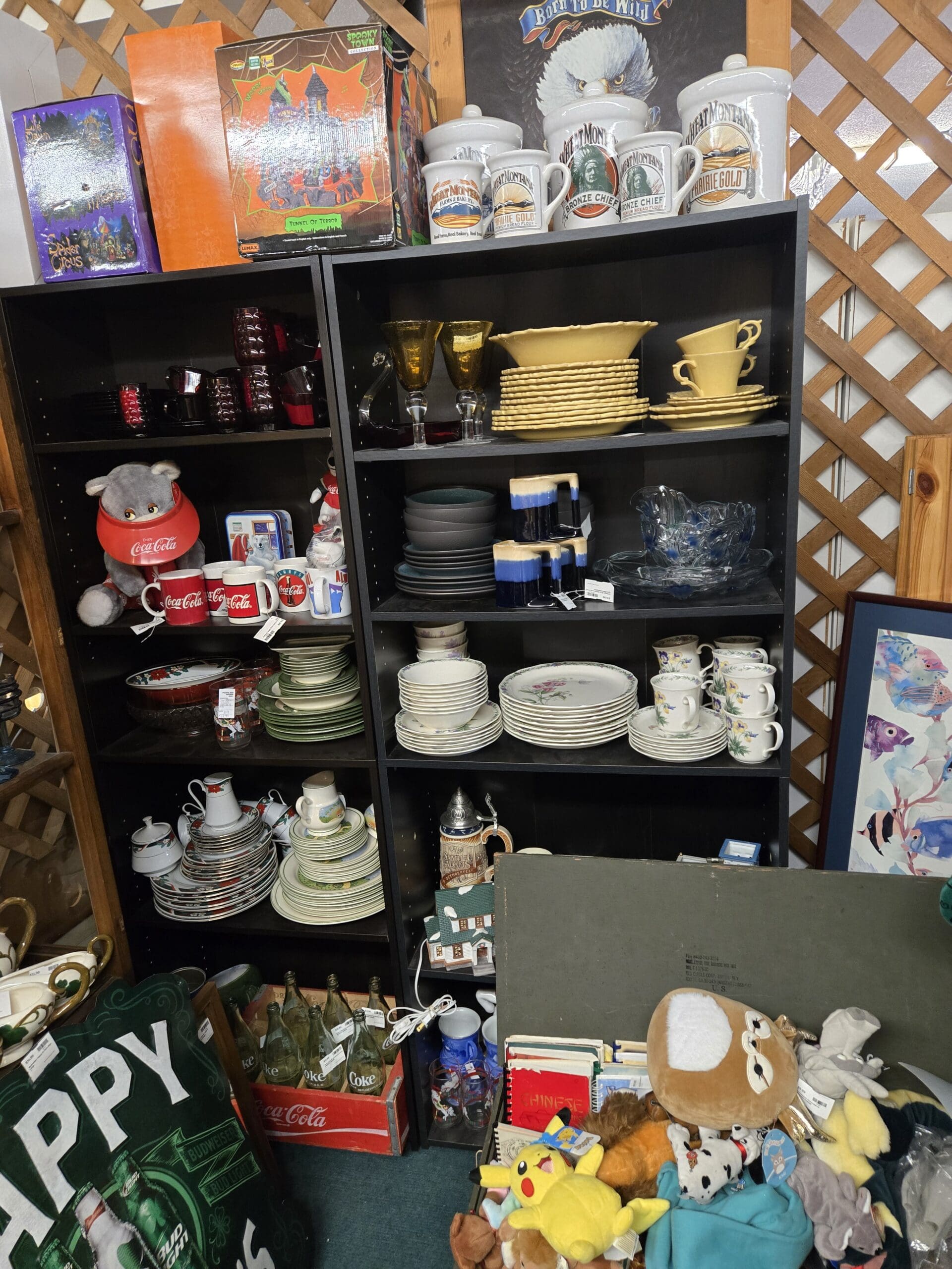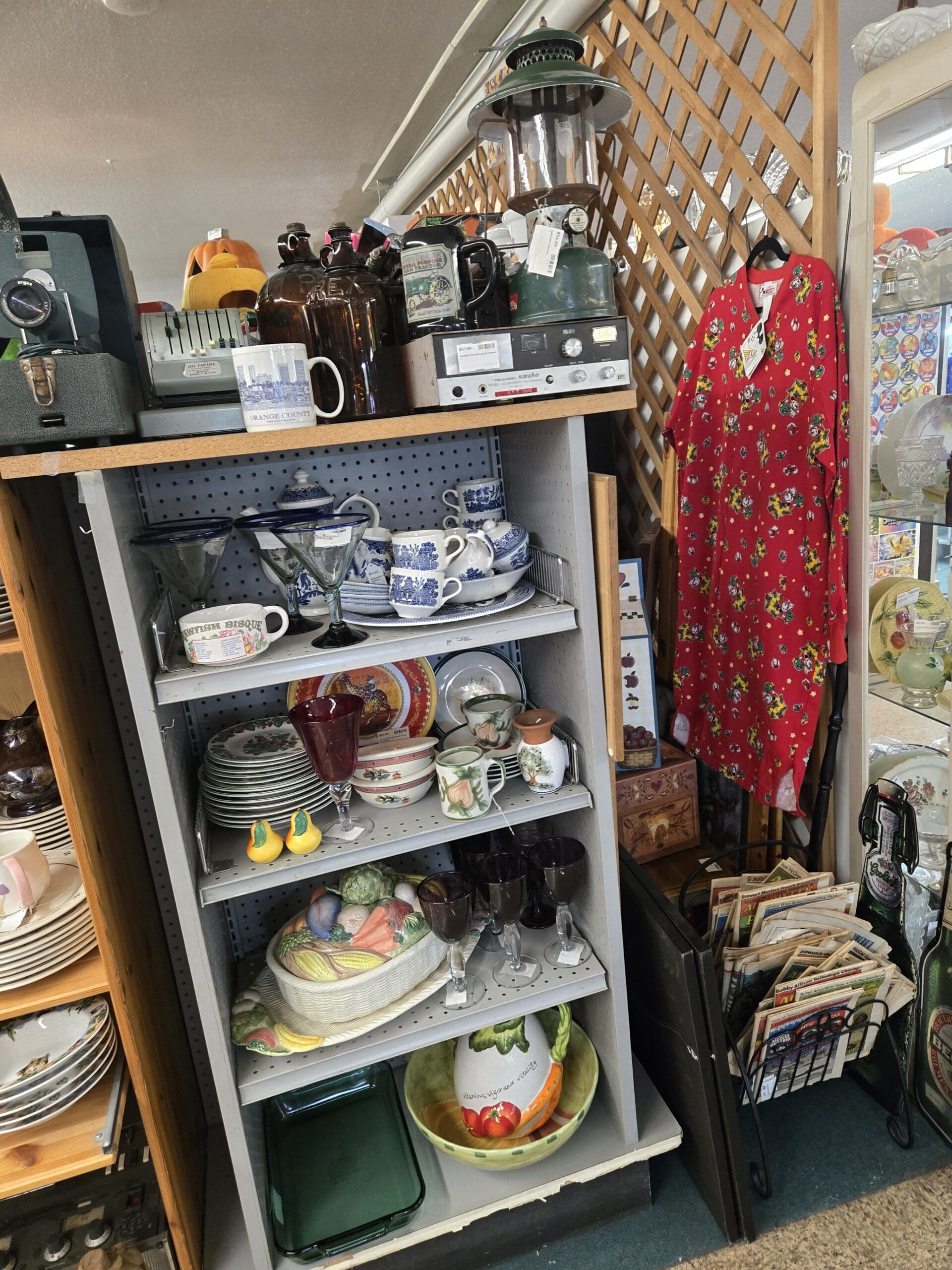 Visit Shop 119, where shelves packed with vintage dinnerware sets create a collector's paradise for anyone looking to build or complete a set. You'll find stacks of china and stoneware in all styles, from delicate floral patterns and gold-rimmed formal sets to cheerful yellow pottery and blue willow pieces. Spode Christmas Tree cups and saucers, ivy-patterned teapots, and pink Depression-era glass goblets add seasonal and vintage charm. A whole shelf of ruby red glassware and cobalt stemware catches the light beautifully alongside amber glass bowls and a gold-trimmed decanter set with matching glasses.