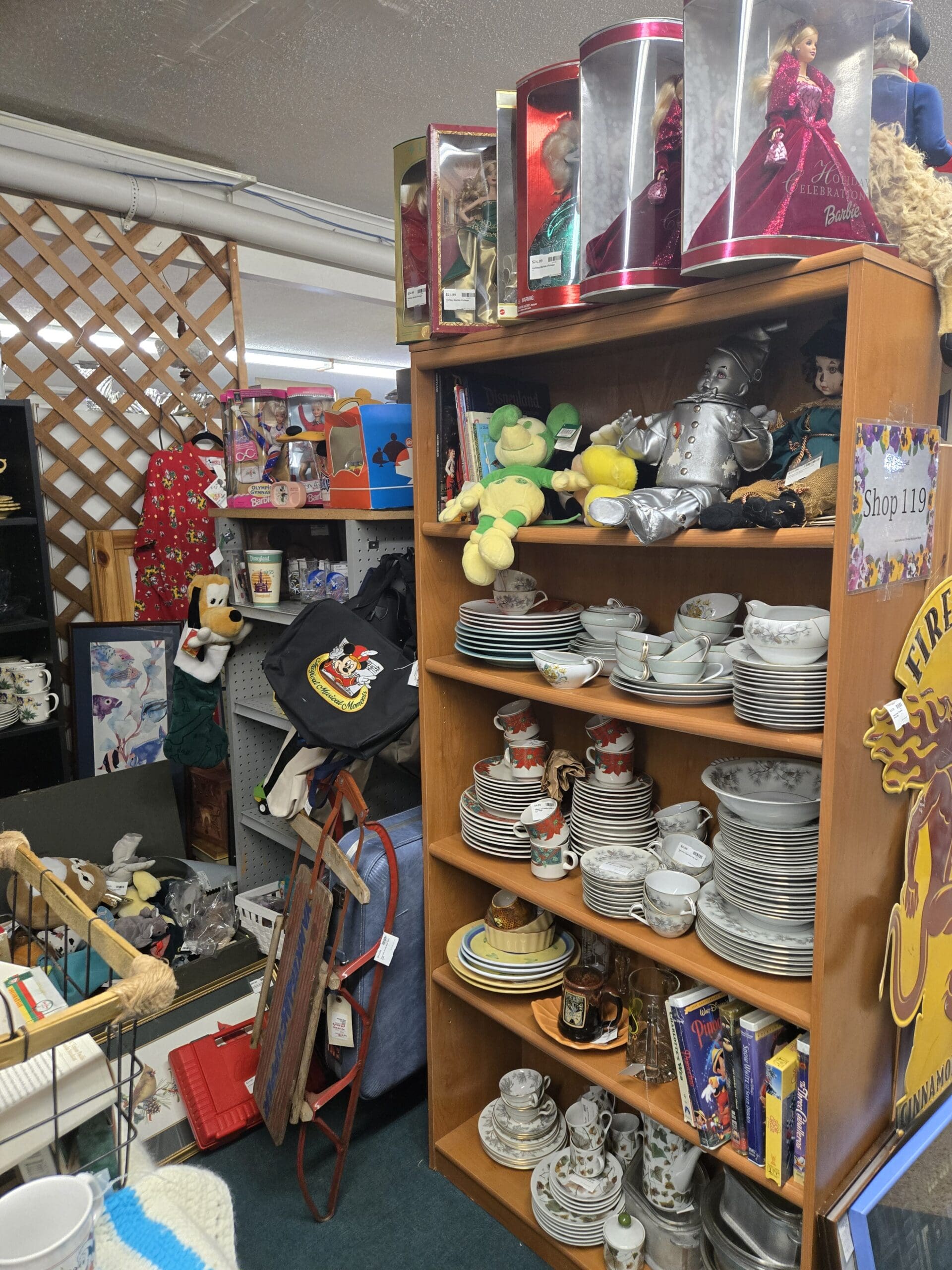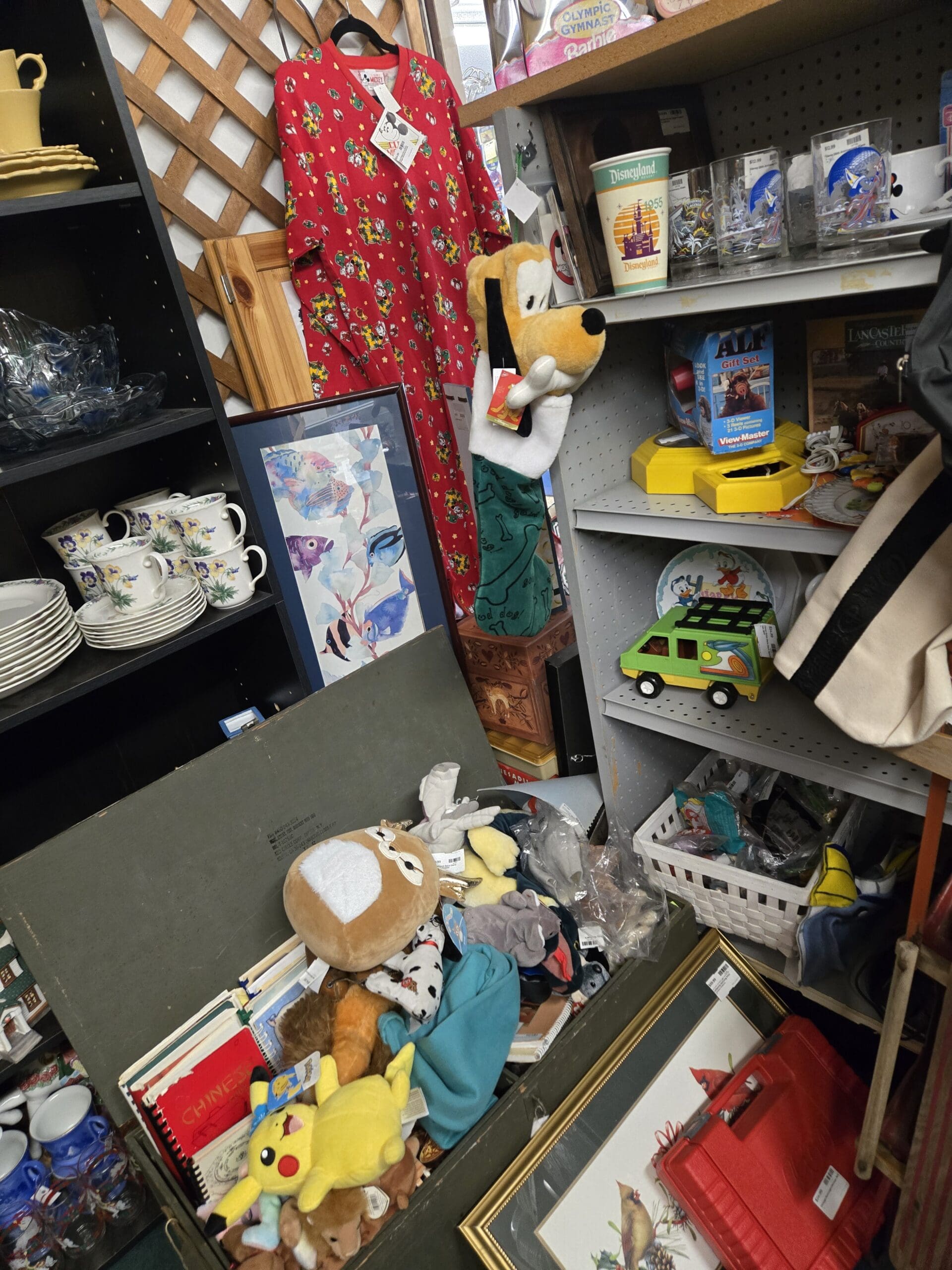 Disney fans will spot a Pluto plush, a Mickey Mouse print nightgown, Disneyland cups, and collectible glasses tucked into one corner, alongside an ALF gift set, a View-Master, and a Scooby-Doo Mystery Machine toy. Holiday Celebration Barbie dolls still in their boxes line the top shelf nearby, and a bin of plush toys including Pokémon and Beanie Babies rounds out the toy selection. A vintage red runner sled, framed watercolor prints, and a lighted village house complete a shop that rewards patient browsing from every angle.