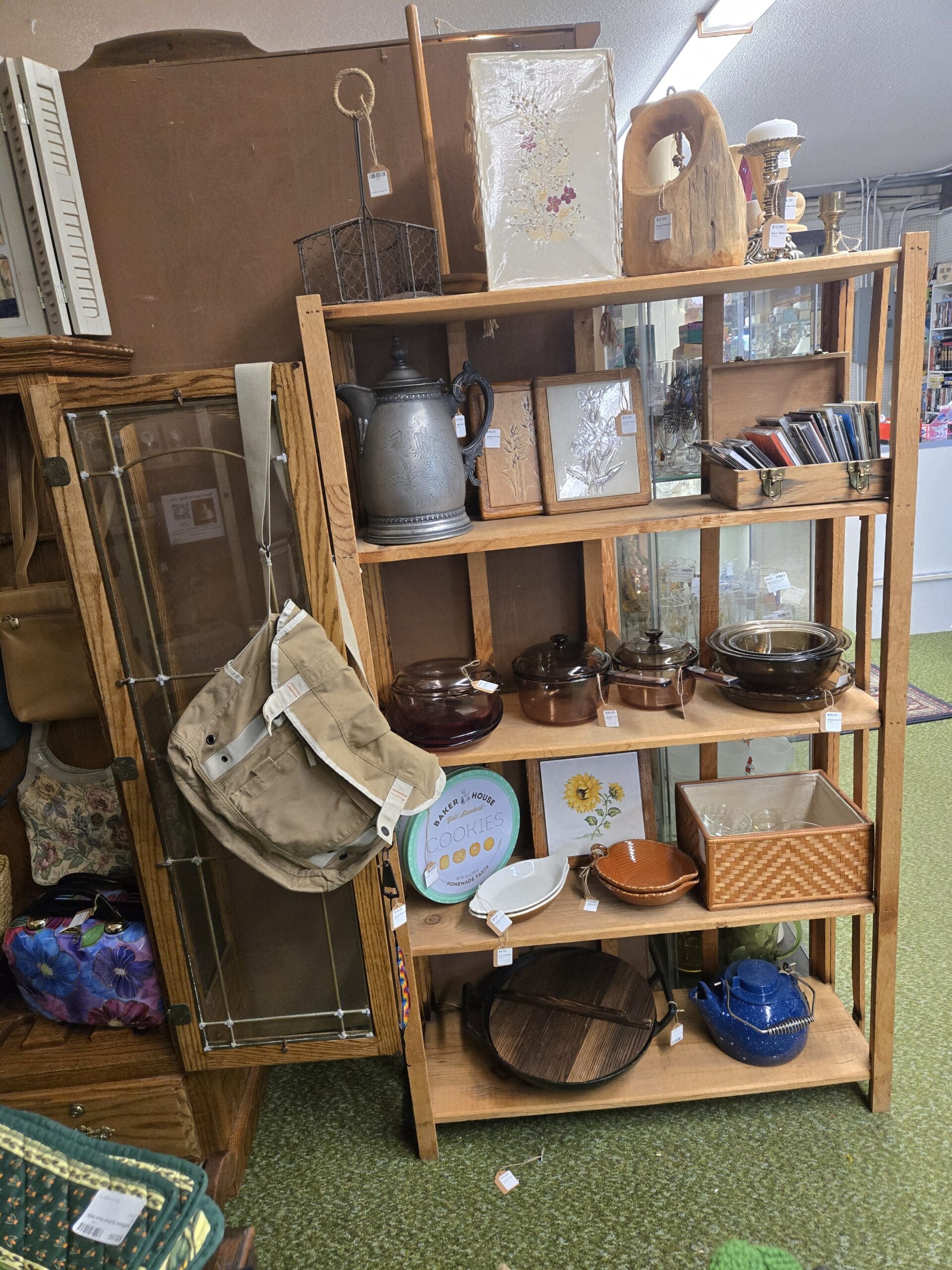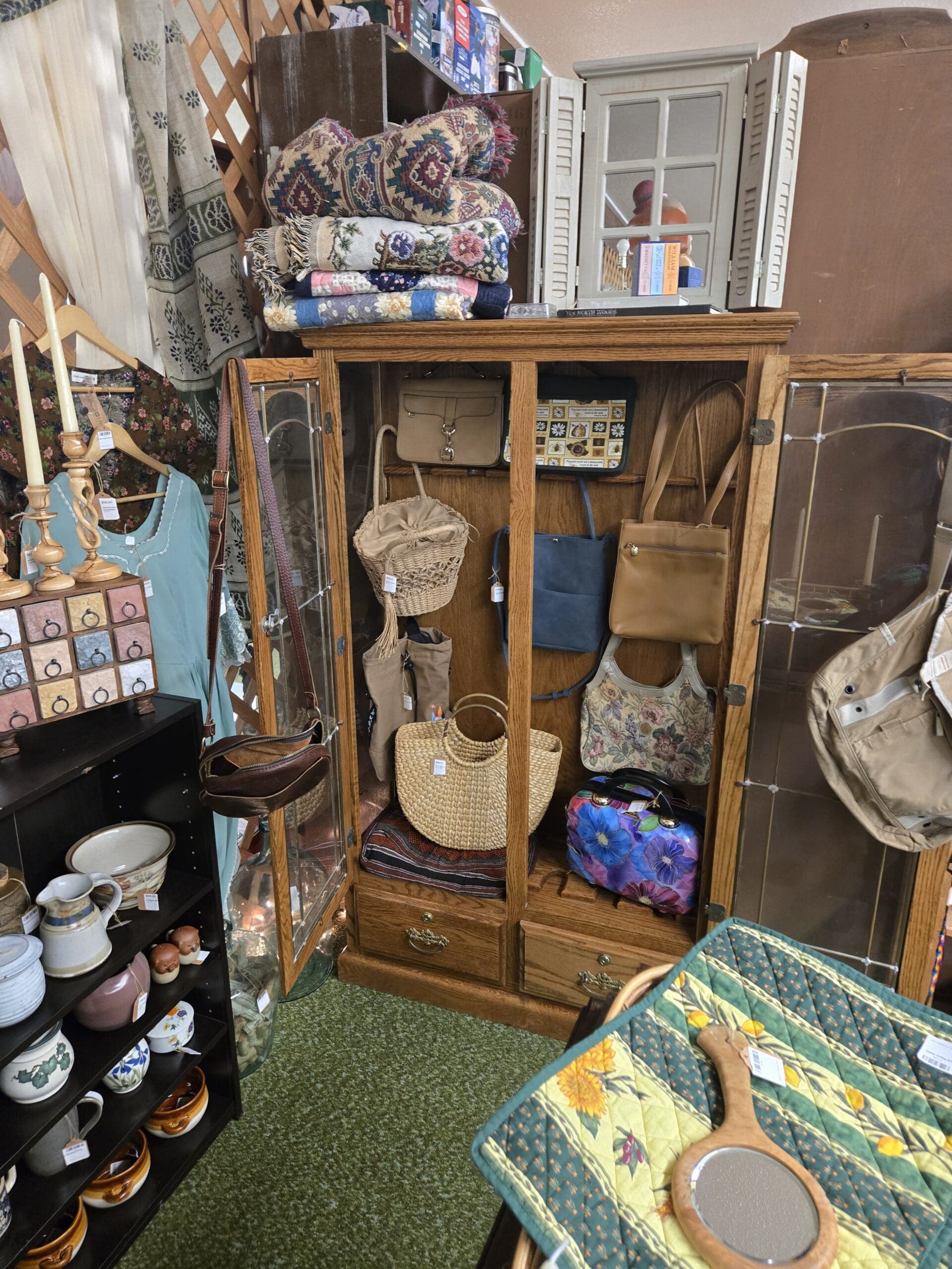 An oak armoire filled with vintage handbags offers everything from structured leather crossbodies to woven straw totes and floral tapestry bags. Nearby, a shelf holds amber Corning Vision cookware, copper-toned pressed floral frames, a blue enamelware kettle, and a wire chicken basket. Handmade quilted placemats in a sunflower pattern, colorful crocheted afghans, and Southwest-style tapestry throw pillows pile high, making this a wonderful stop for anyone who appreciates the warmth of handmade and the charm of well-chosen vintage.
