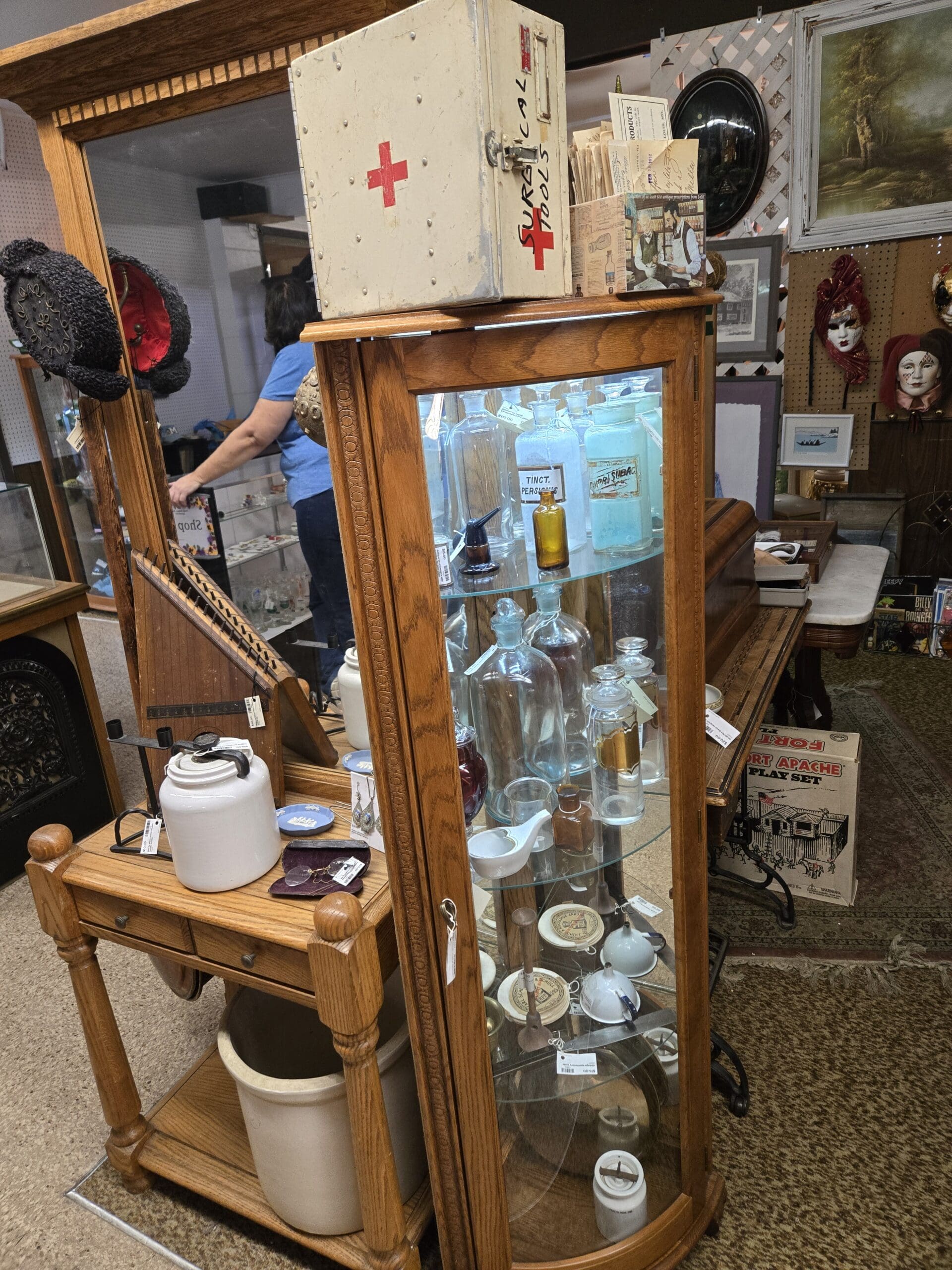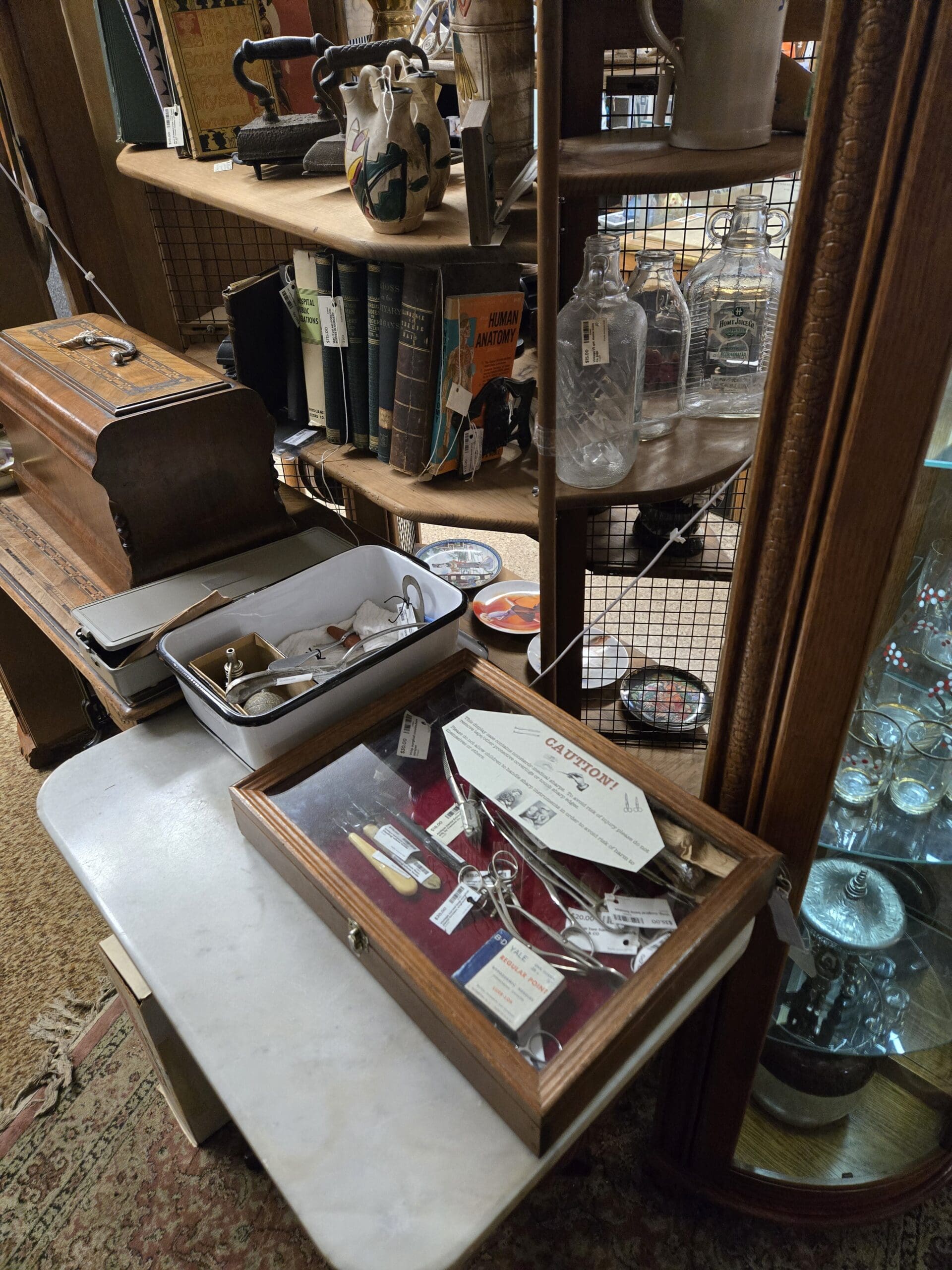 Visit Shop 13, where collectors with a taste for the extraordinary will feel right at home. Medical history enthusiasts will be captivated by the impressive collection of antique apothecary bottles-clear glass vessels with hand-labeled tinctures, amber medicine bottles, and vintage pharmacy jars. There's even a white metal surgical tools case marked with a red cross, along with enamelware medical trays and fascinating vintage surgical instruments. A human anatomy textbook and antique medical reference books round out this unique niche.