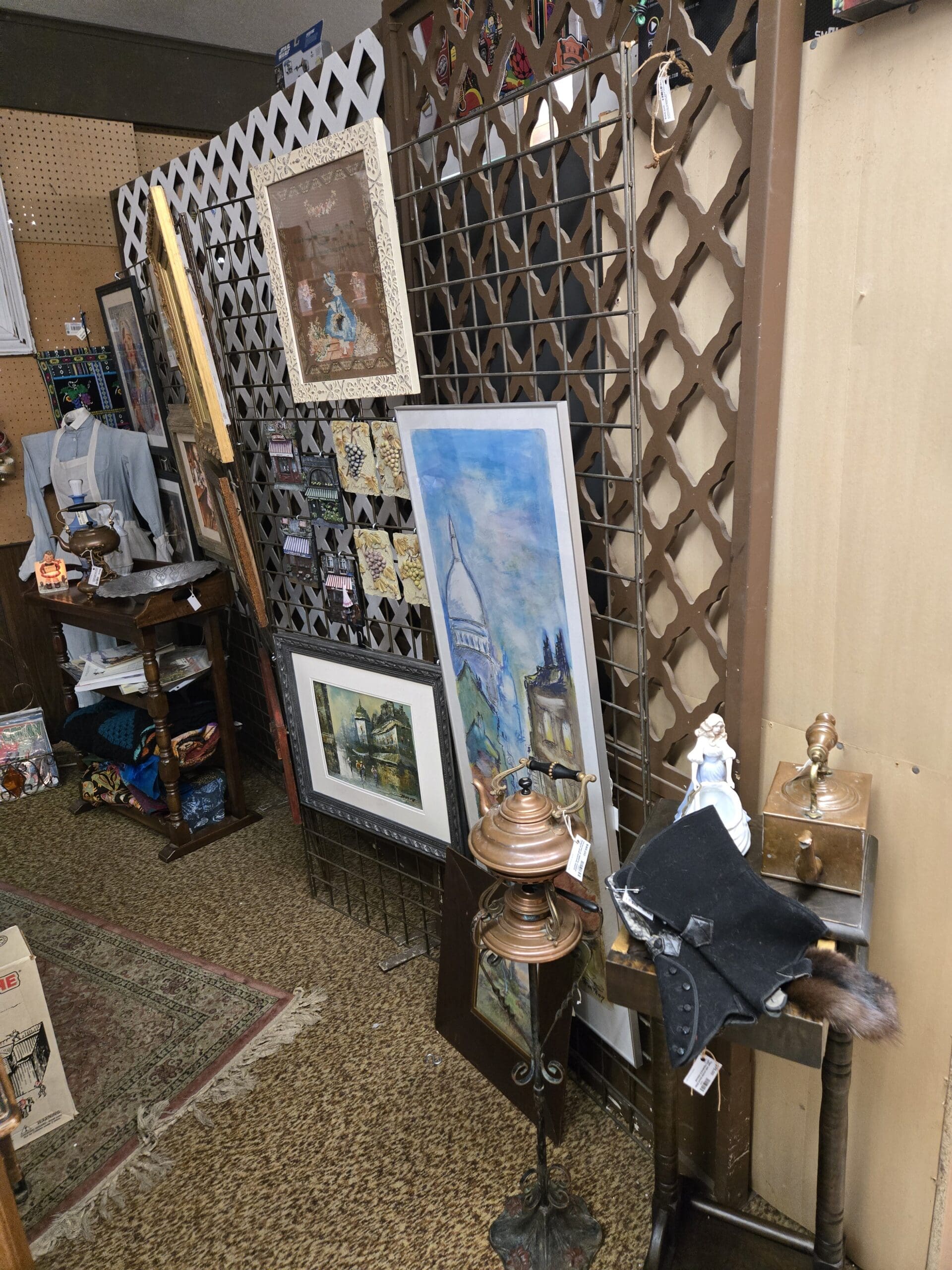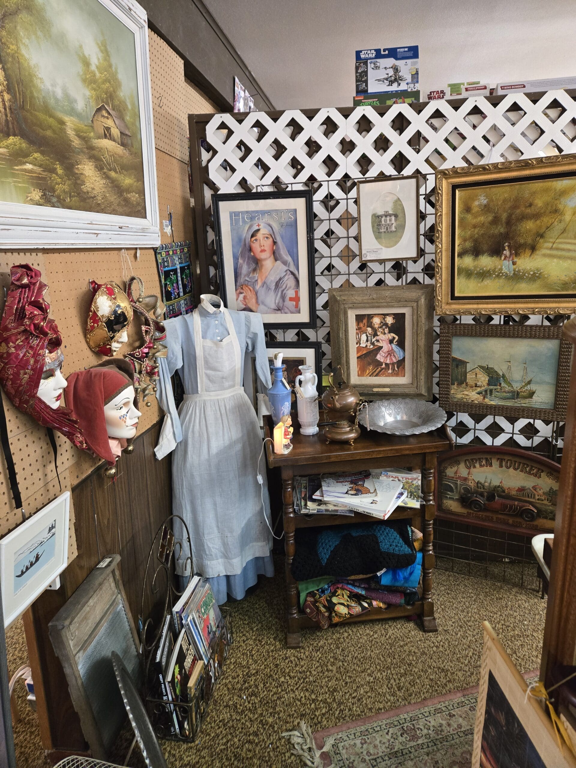 Art lovers will discover walls adorned with beautiful original paintings-dreamy pastoral landscapes with rustic barns, impressionistic Parisian cityscapes featuring Sacré-Cœur, and striking Native American portrait art. Elegant Venetian carnival masks in crimson and gold add a touch of theatrical drama, while a vintage Hearst's magazine cover print featuring a Red Cross nurse speaks to the shop's medical theme. You'll also find a lovely vintage nurse's uniform with apron, perfect for collectors of historical clothing or theatrical costumers.