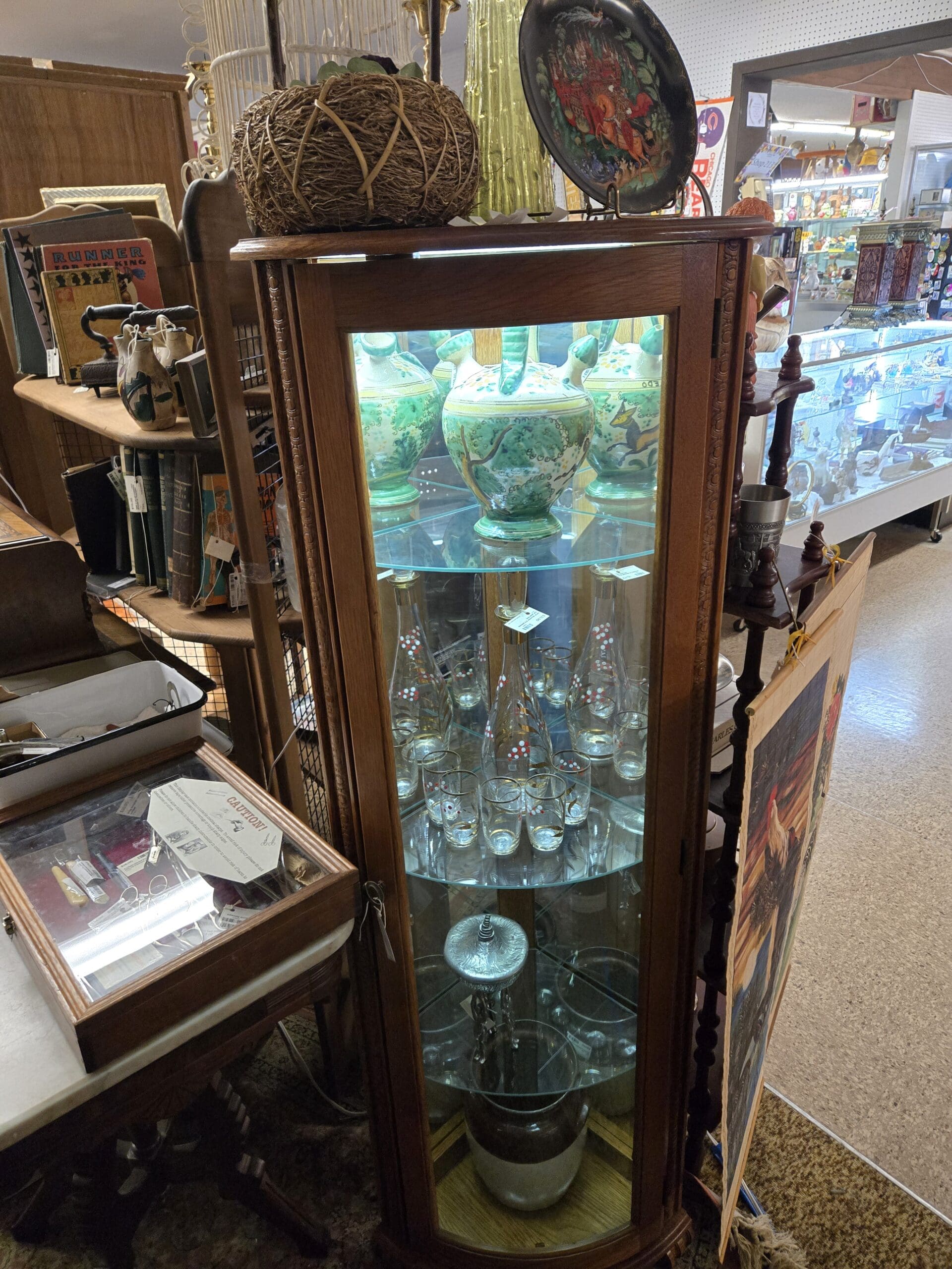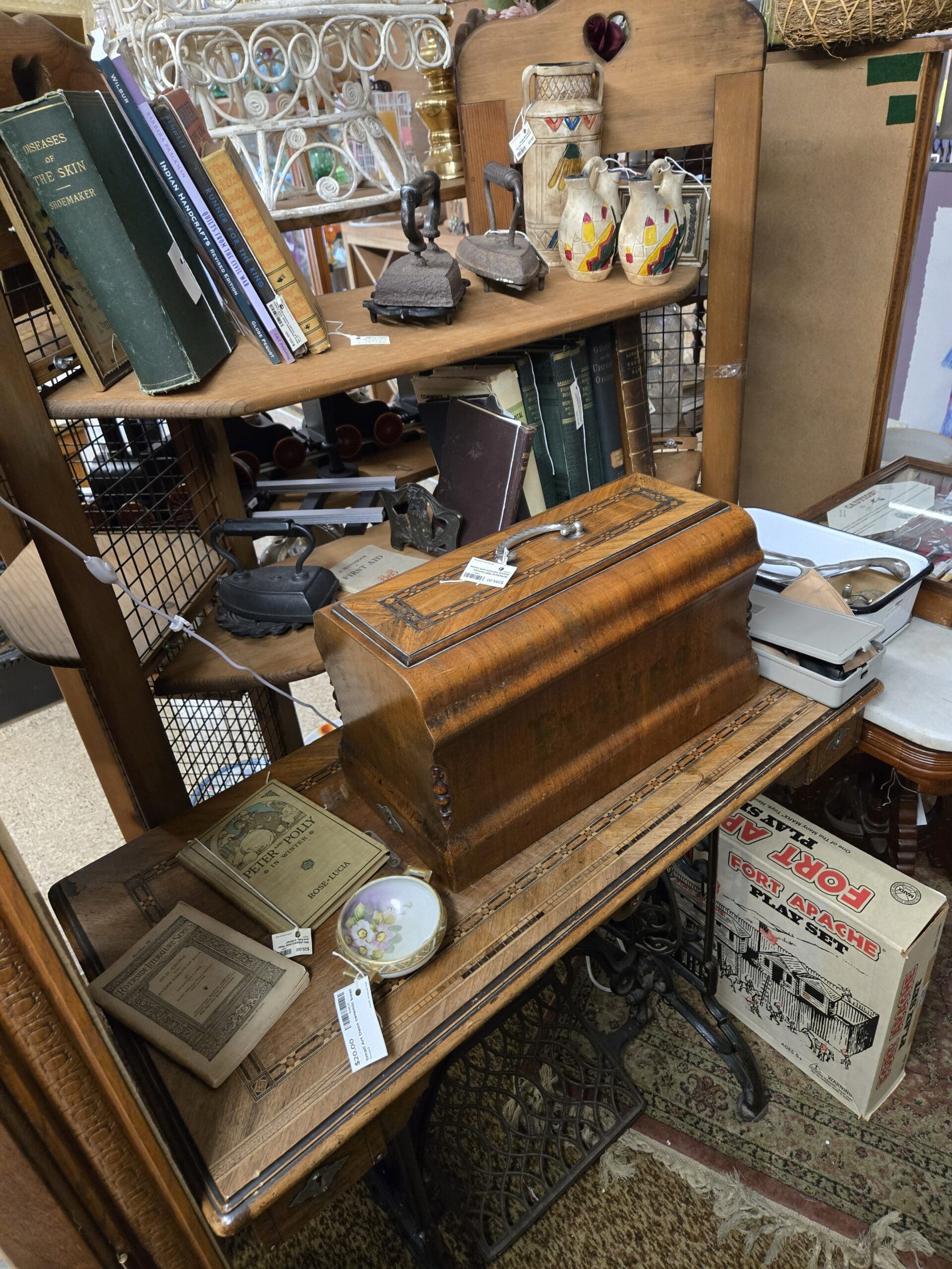The treasures continue with a gorgeous antique Singer sewing machine in its ornate wooden cabinet, cast iron sad irons, and hand-painted Southwestern pottery. Browse Royal Doulton-style character Toby jugs, delicate hand-painted pilsner glasses, and striking green majolica-style ceramic vases. There's a whimsical white wicker birdcage, vintage pin-up collector plates, cast iron locomotive bookends, and antique books including a German edition of Grimm's fairy tales - Shop 13 truly has something for everyone.