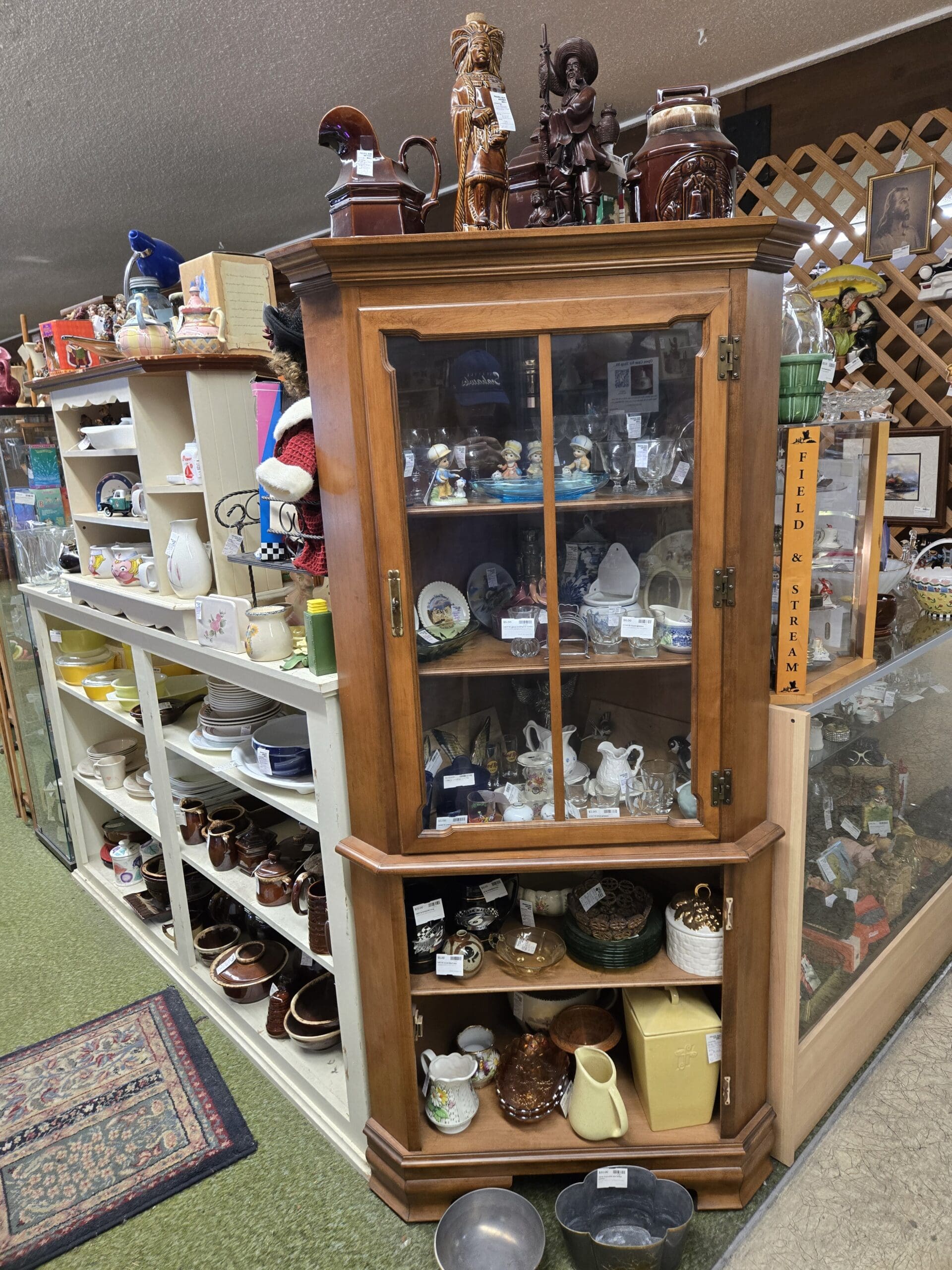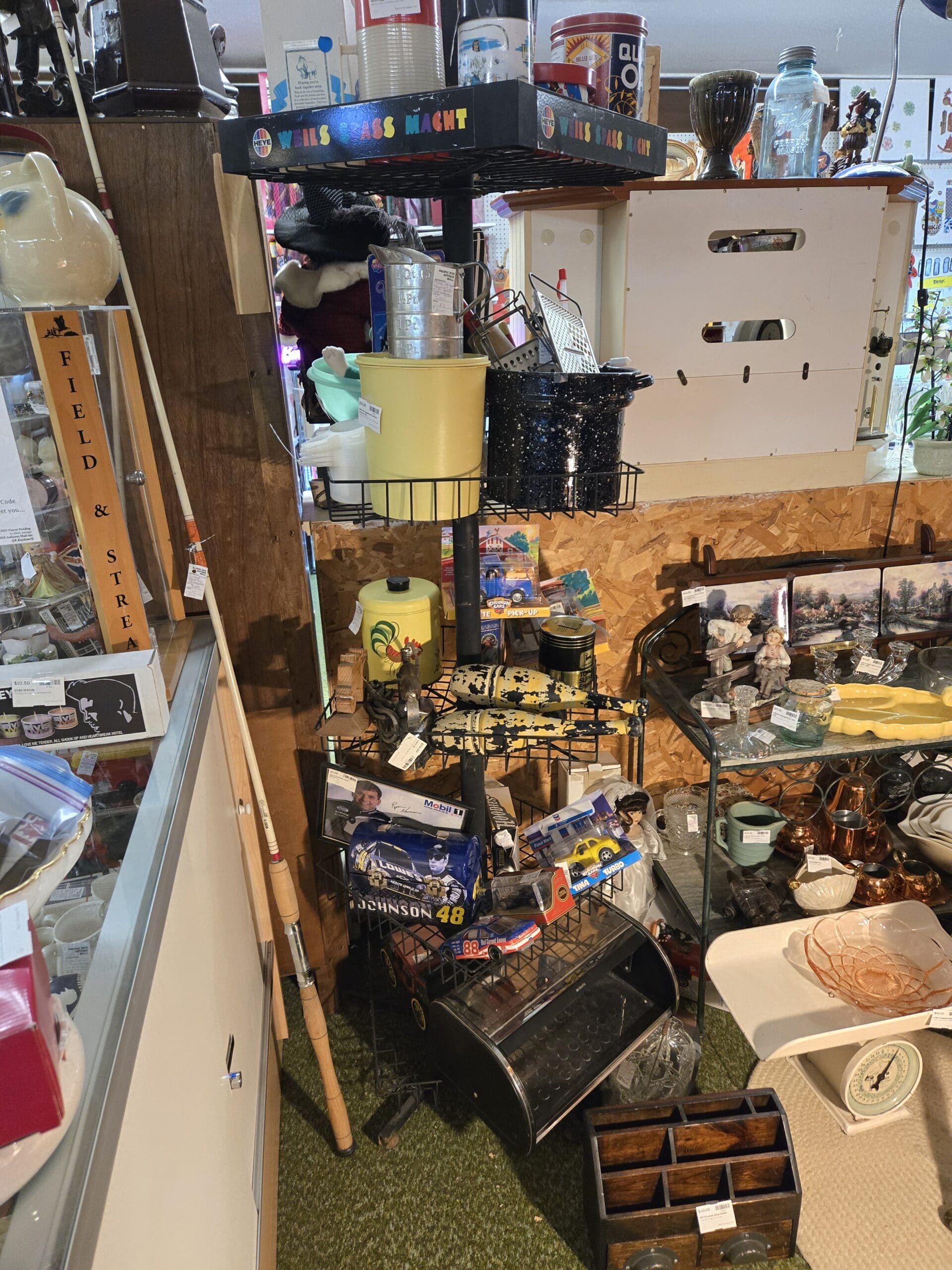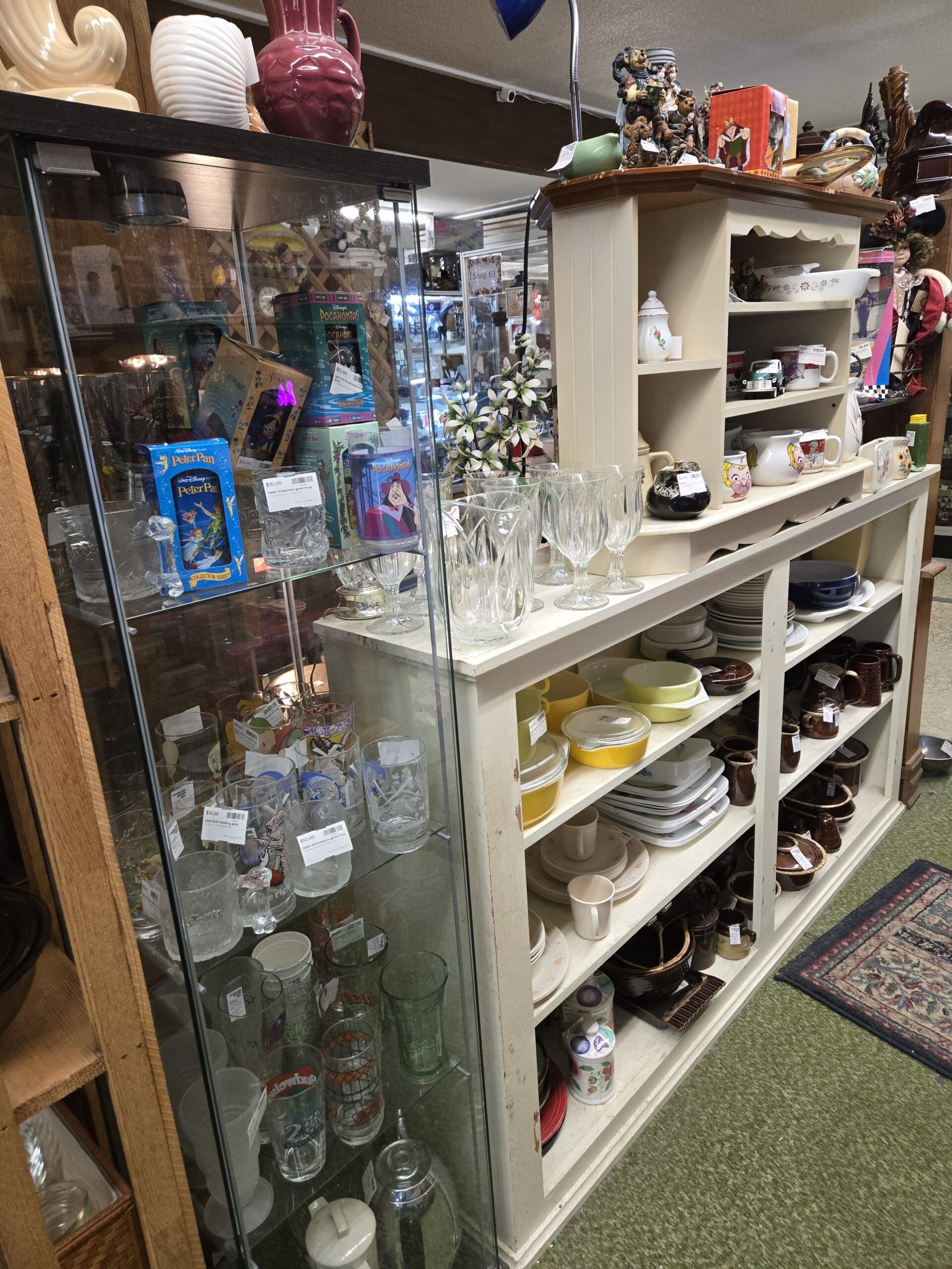 The character collectibles are a highlight here. Spot Royal Doulton-style Toby jugs and lawyer character mugs, adorable Bossons-style chalkware heads, plus cheerful Disney mugs featuring Beauty and the Beast's Mrs. Potts and Chip. You'll find vintage Disney VHS tapes like Peter Pan and Pocahontas still in their clamshell cases, carved wooden figures including Native American statues and tribal art, NASCAR memorabilia, and a Field & Stream fishing rod. Whether you're outfitting a retro kitchen or hunting for that perfect nostalgic gift, Shop 19 has treasures waiting to be discovered.