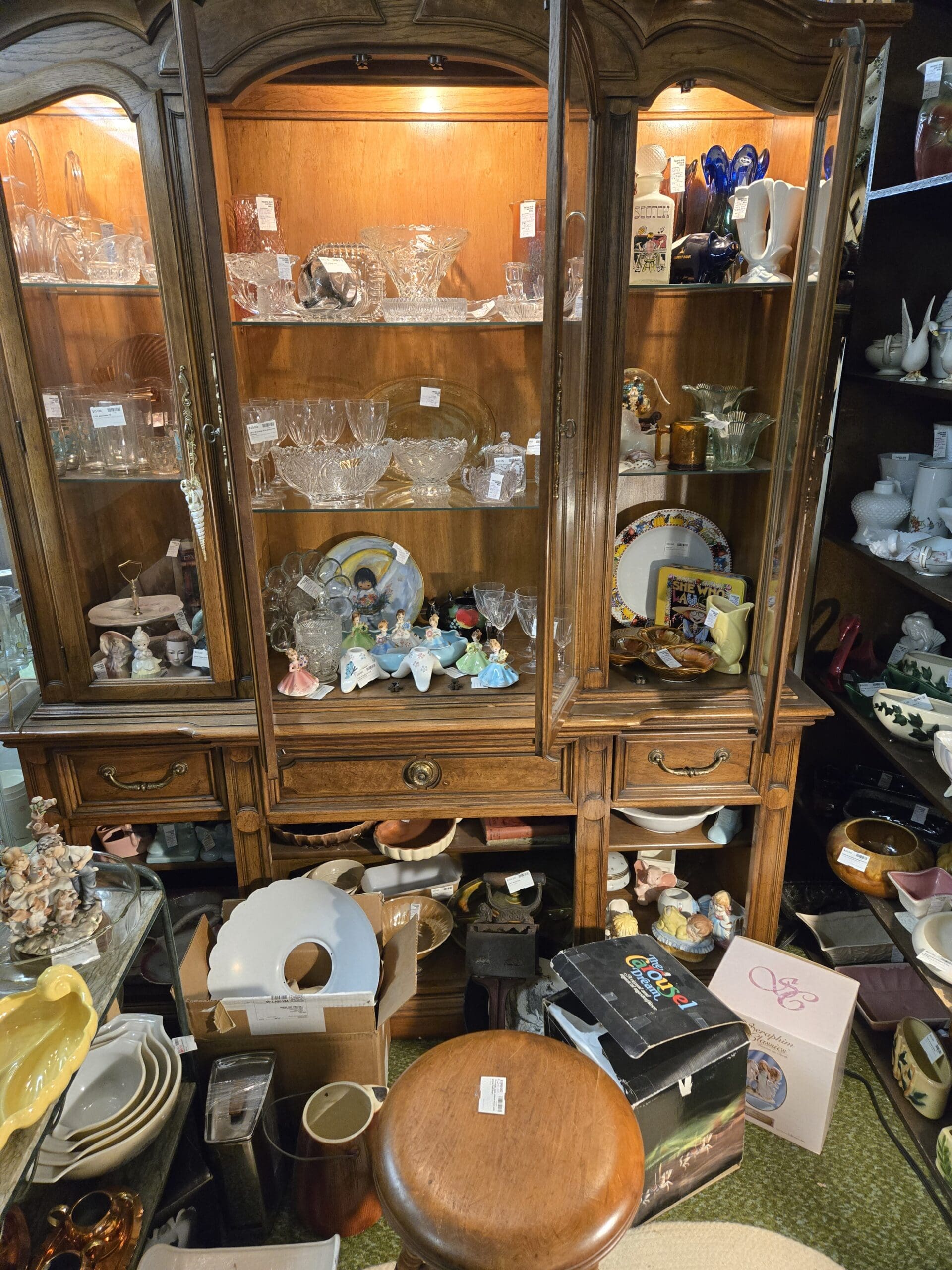 Crystal and glassware collectors, prepare to linger. This shop features elegant cut crystal bowls, stemware, and serving pieces that sparkle under the lights. You'll discover jadeite-green pitchers, colorful art glass vases in cobalt blue and amber, and whimsical pieces like swan-shaped planters and ceramic teapots in playful shapes. The Budweiser Clydesdale steins and vintage Coca-Cola trays add a touch of advertising nostalgia, while hand-painted Hummel-style figurines and delicate porcelain ladies in ball gowns bring old-world charm.