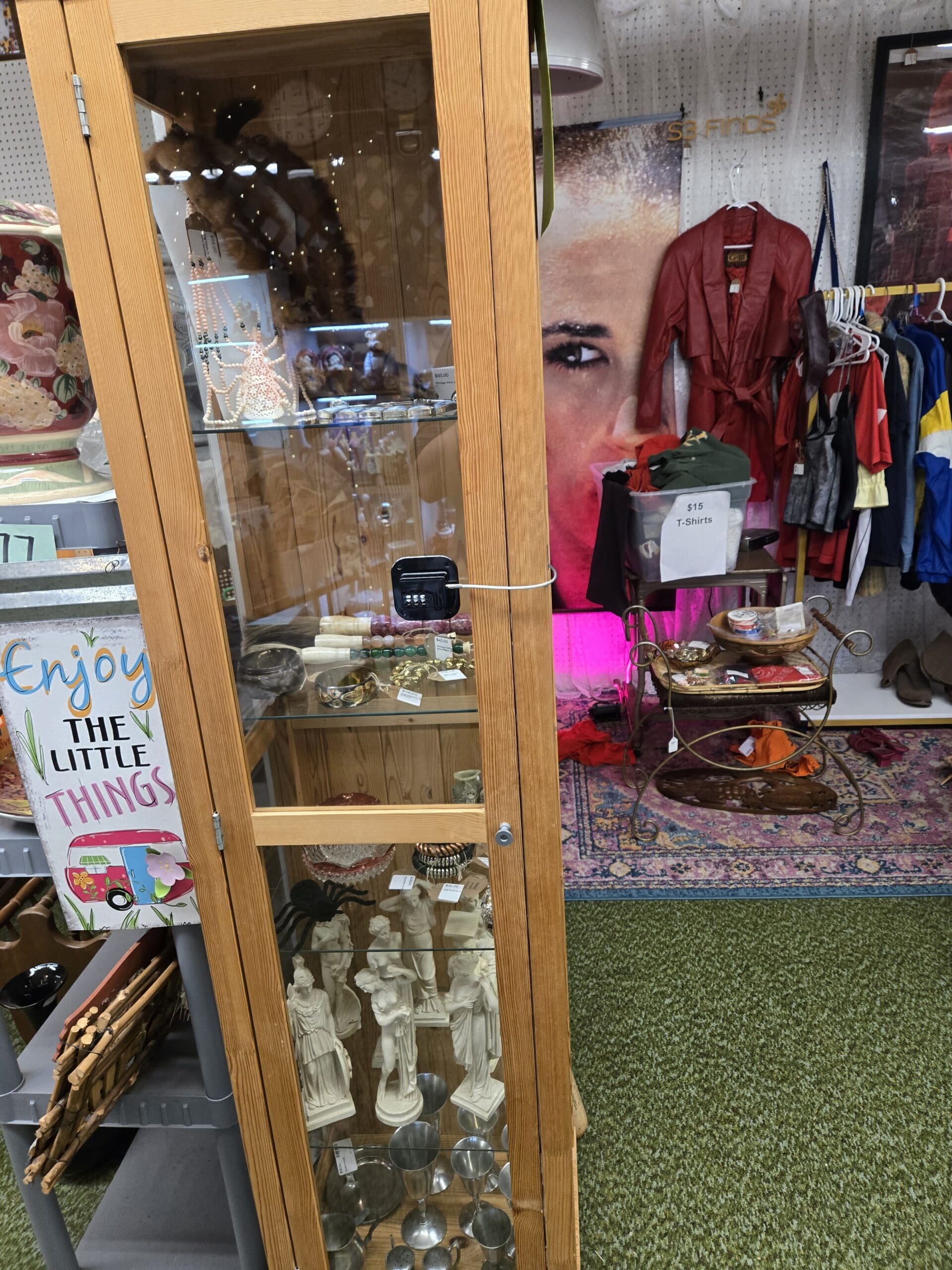 The eclectic treasures continue throughout the shop. Classical-style resin figurines depicting Greek goddesses and muses share space with polished stone eggs, colorful crystals, and vintage jewelry. A detailed tall ship model commands attention from above, while David Winter-style cottage figurines, a charming blue church collectible, and Corning Ware casserole dishes offer more traditional finds. Browse pewter steins, cobalt blue art glass vases, delicate china tea sets with floral patterns, antique coffee grinders, and even a vintage porcelain doll perched on a sunny yellow director's chair. Shop 27's bold personality makes every visit an adventure.