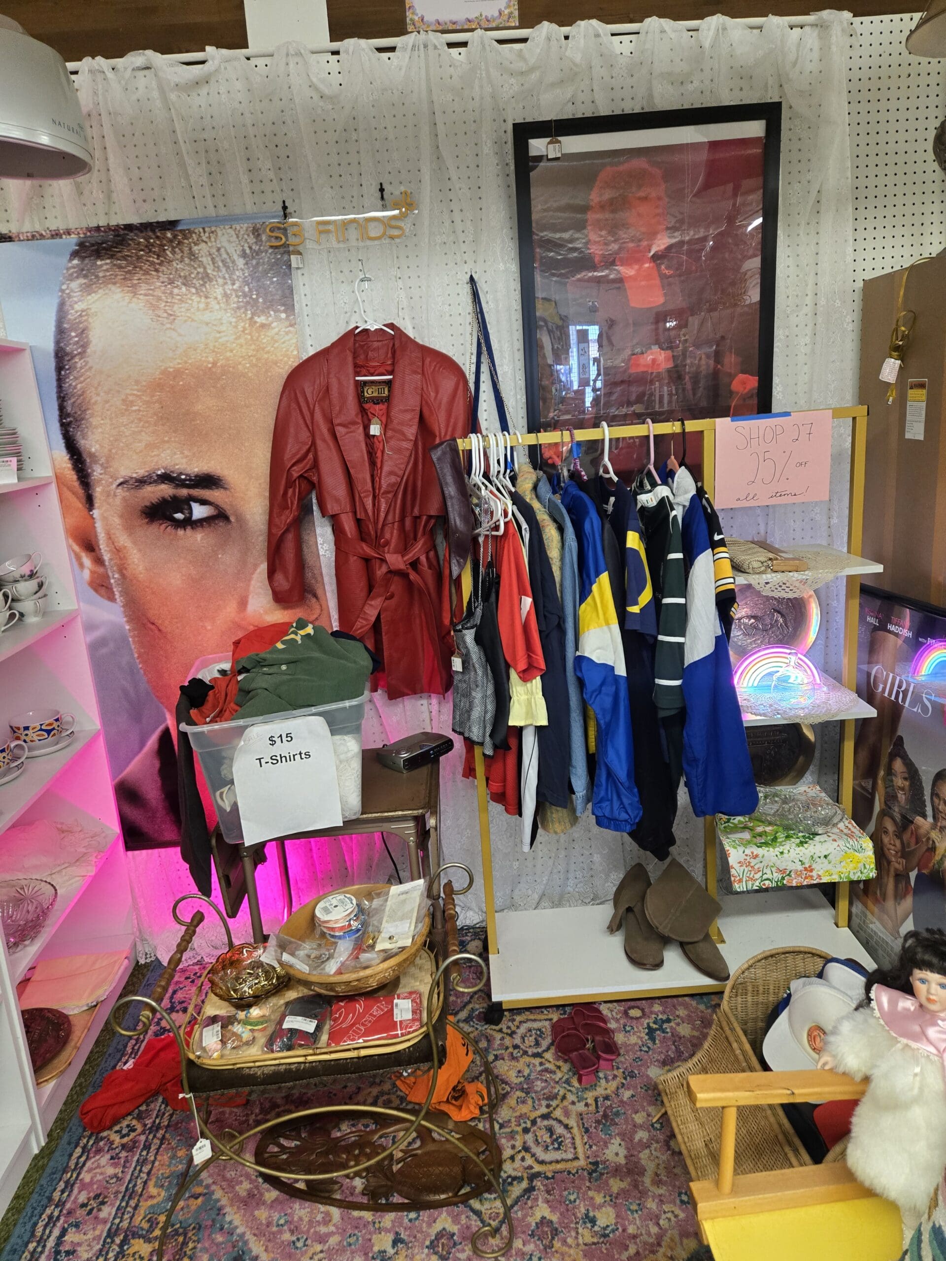 Visit Shop 27, where vintage fashion meets pop culture cool. The clothing rack offers a curated mix of statement pieces-a gorgeous burgundy leather trench coat, colorful varsity-style jackets, classic Nike windbreakers, and Green Bay Packers gear for the sports fan. Dig through bins of vintage t-shirts and discover wearable pieces with genuine character.