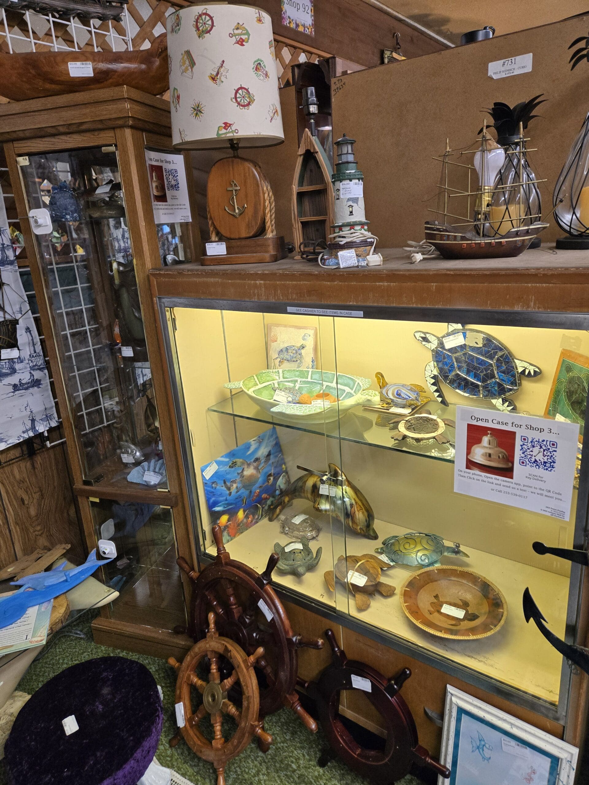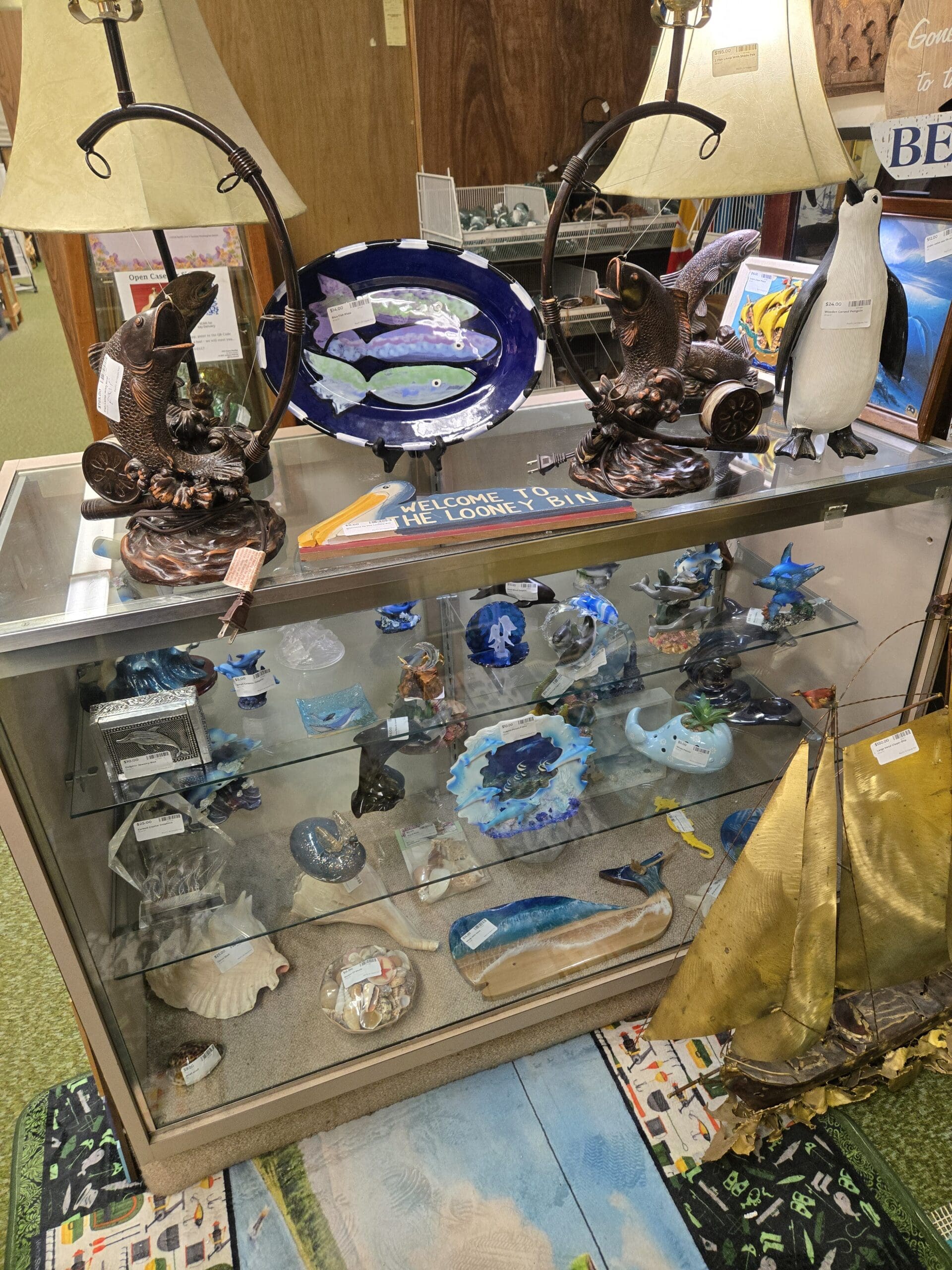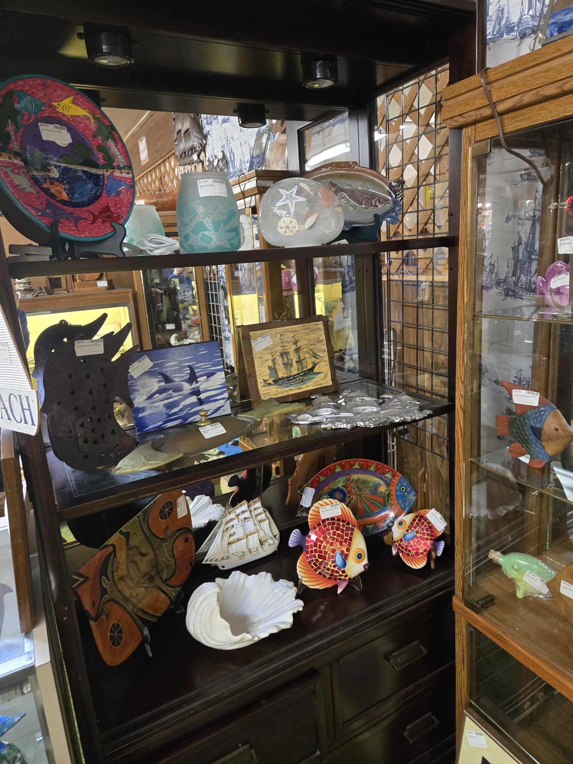 The treasures run deep here. Browse bronze fish lamps with an old-world patina, colorful hand-painted ceramic fish, glass dolphin figurines, and mosaic sea turtles that catch the light beautifully. You'll spot authentic ship's wheel replicas, vintage brass propellers, lighthouse sculptures, and stained glass ocean scenes. The "Welcome to The Looney Bin" sign hints at the shop owner's playful personality-and you never know what whimsical find will surface, from penguin statues to clownfish art that would make Nemo jealous.