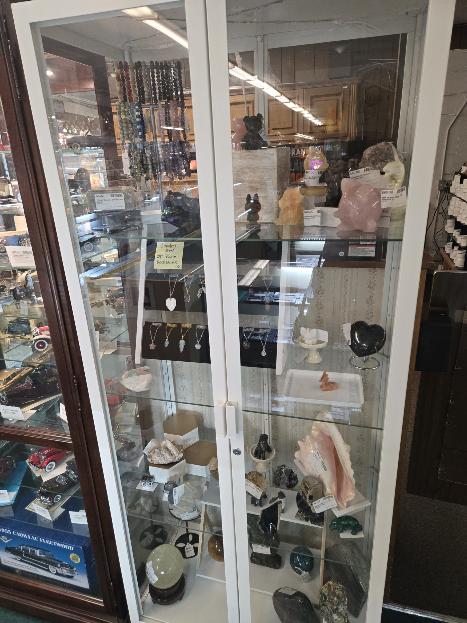 Gemstone jewelry adds a wearable dimension to the collection, with stainless steel stone necklaces in 24-inch lengths hanging from the top shelf in a rainbow of bead colors, from deep amethyst and lapis to soft rose and jade green. Delicate pendants in heart and star shapes displayed on velvet cards make for beautiful gift options. Whether you're drawn to the energy of raw crystals or simply appreciate the beauty of polished stone, Shop 300 offers a focused, gem-lover's collection worth stopping for.