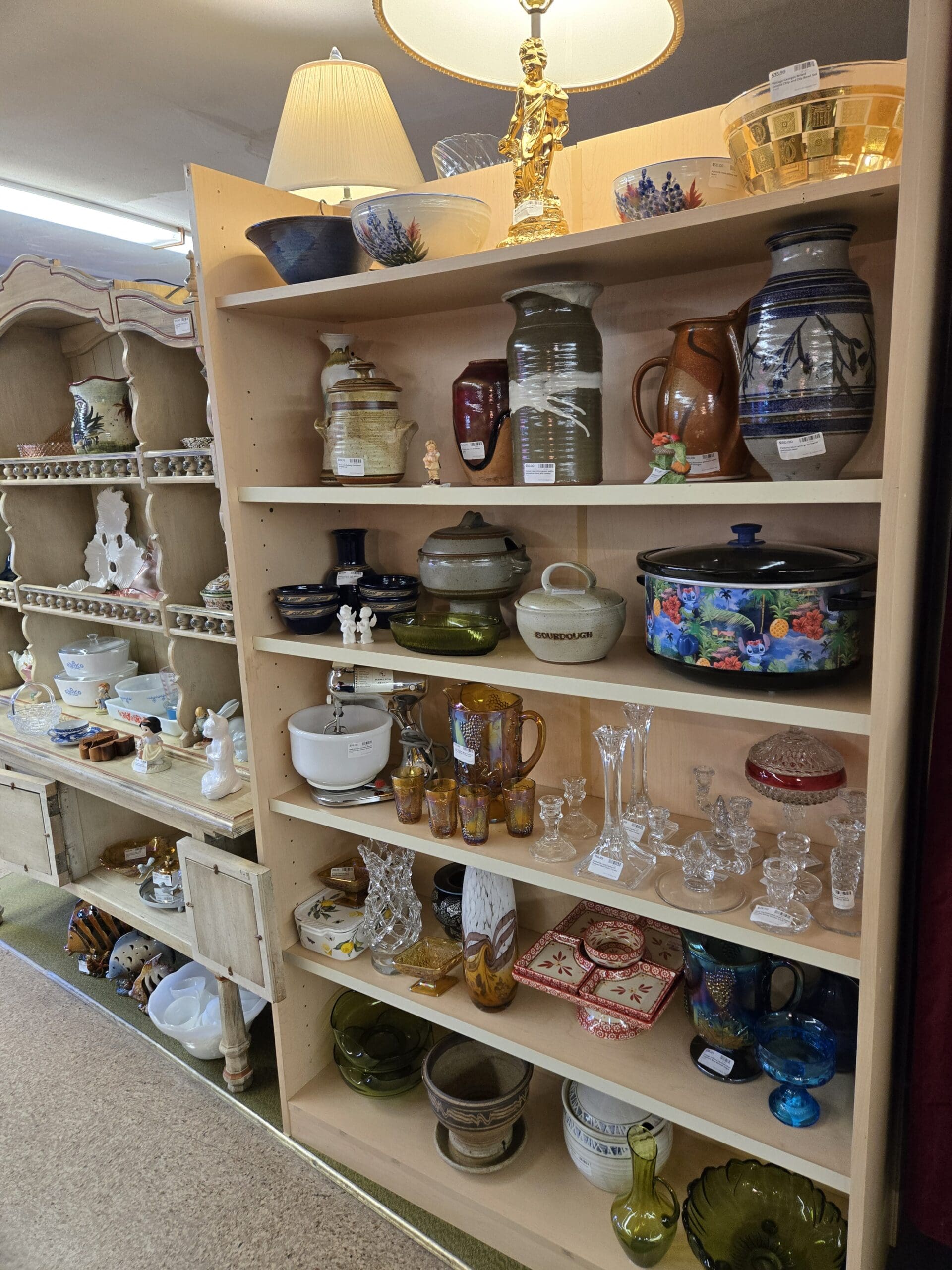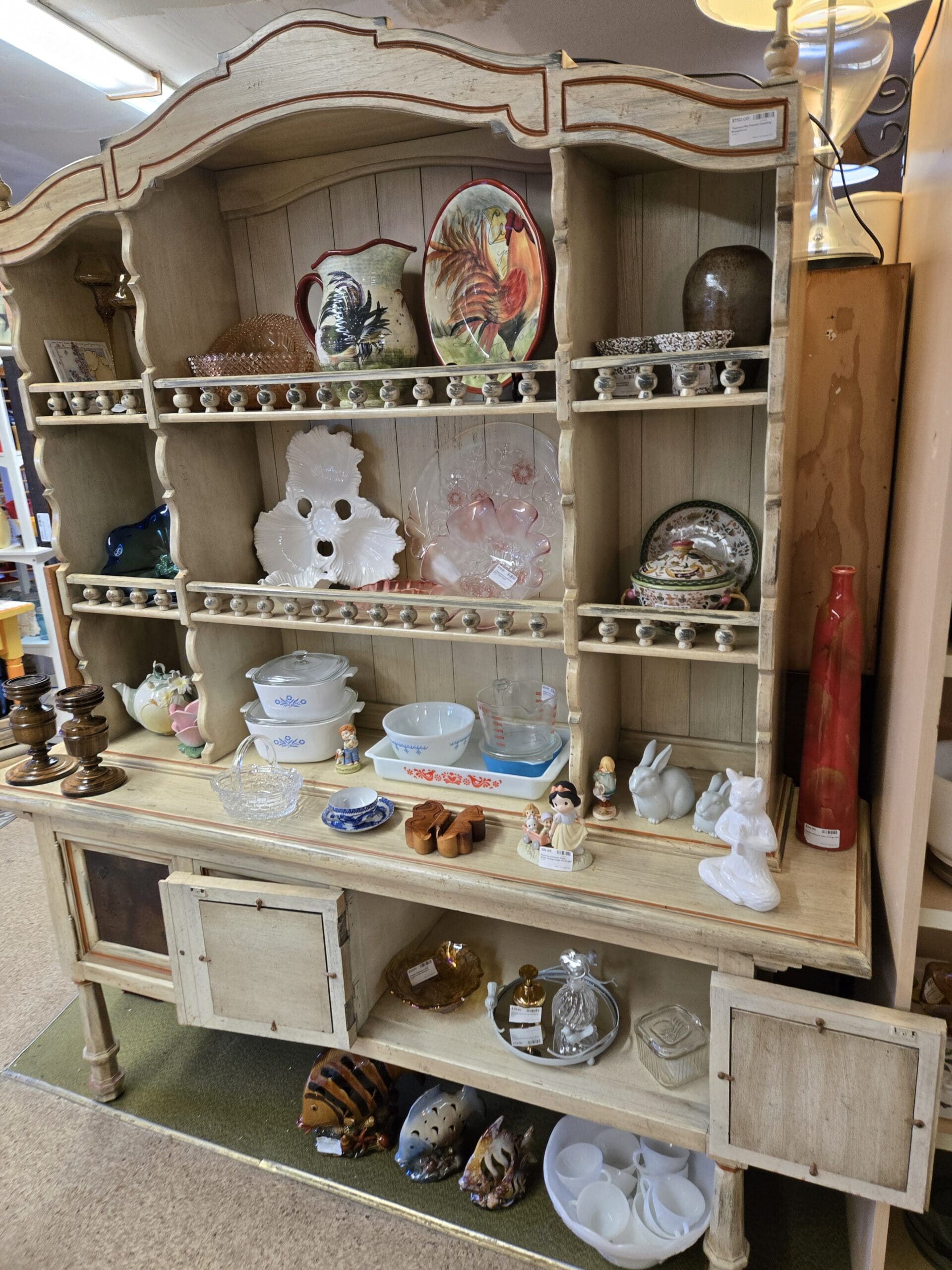 Visit Shop 35, where collectible decor and glassware spill across a cozy, densely stocked space that feels like browsing through a well-loved home. Handmade stoneware pottery in earthy greens, browns, and cobalt blue fills the upper shelves, with hefty pitchers, lidded crocks, and a charming sourdough crock sitting alongside studio-fired vases with mountain and landscape motifs. Carnival glass tumblers and a pitcher in warm marigold tones catch the light next to crystal candlesticks, hobnail pieces in blue opalescent, and pressed glass candy dishes. A French country-style hutch with spindle rails anchors one wall, holding rooster-themed pitchers, pink Depression glass plates, Corning Ware casserole dishes in the classic Cornflower pattern, and Pyrex baking dishes that collectors snap up fast.