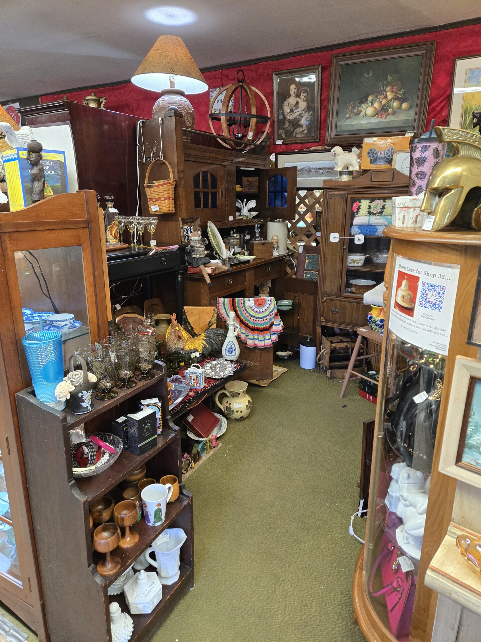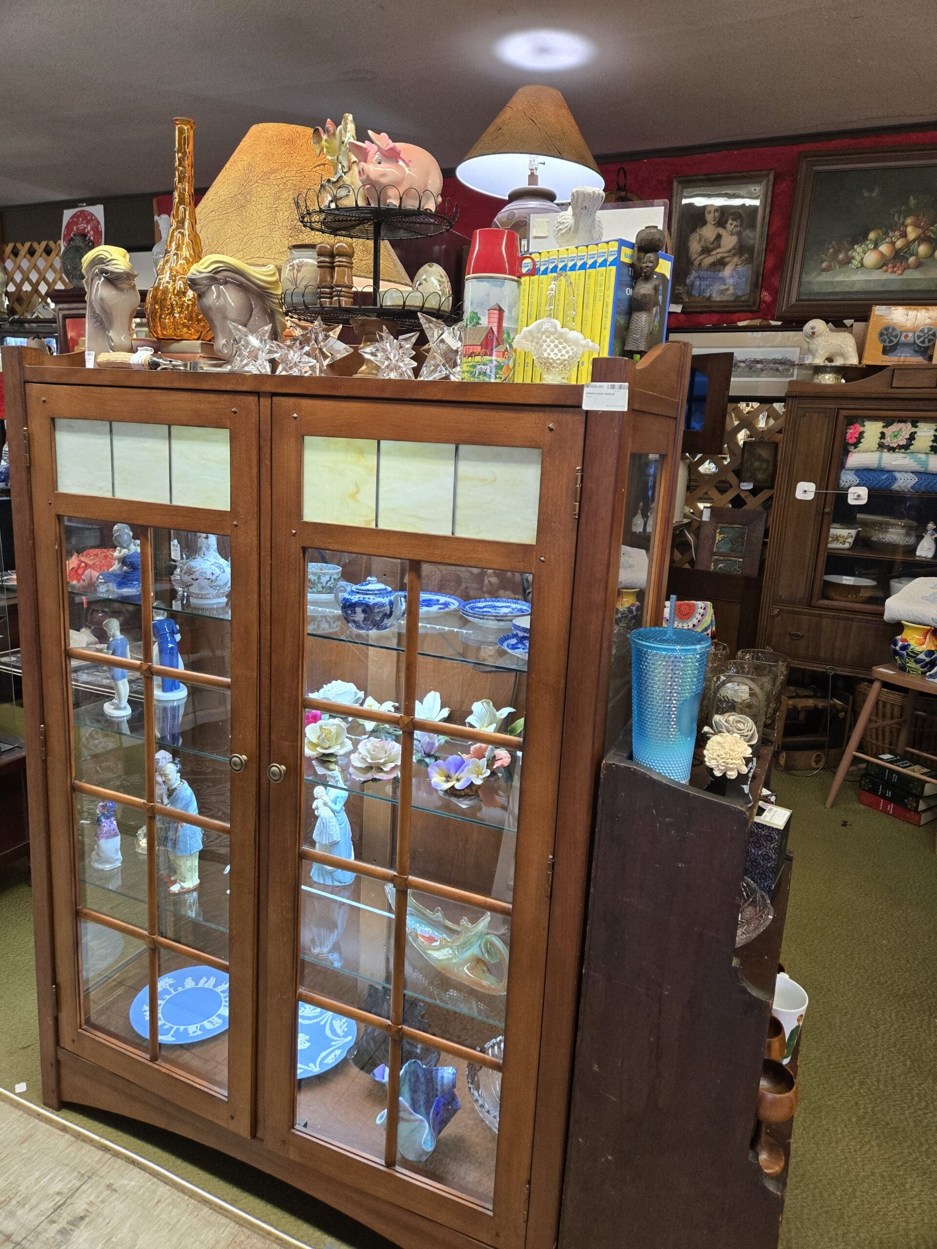 Keep exploring and you'll discover blue and white Delft-style vases, Hummel-style figurines tucked into cubbyholes, a carved wooden crucifix, hand-embroidered linens, vintage books, and colorful garden gnomes. Glass cloches shelter tiny porcelain trinkets, and a collection of wooden goblets and turned-wood bowls adds a rustic handcrafted touch. Whether you're searching for a specific glassware pattern, a piece of original artwork, or a one-of-a-kind accent for your home, Shop 35 is packed with character and well worth a thorough look.