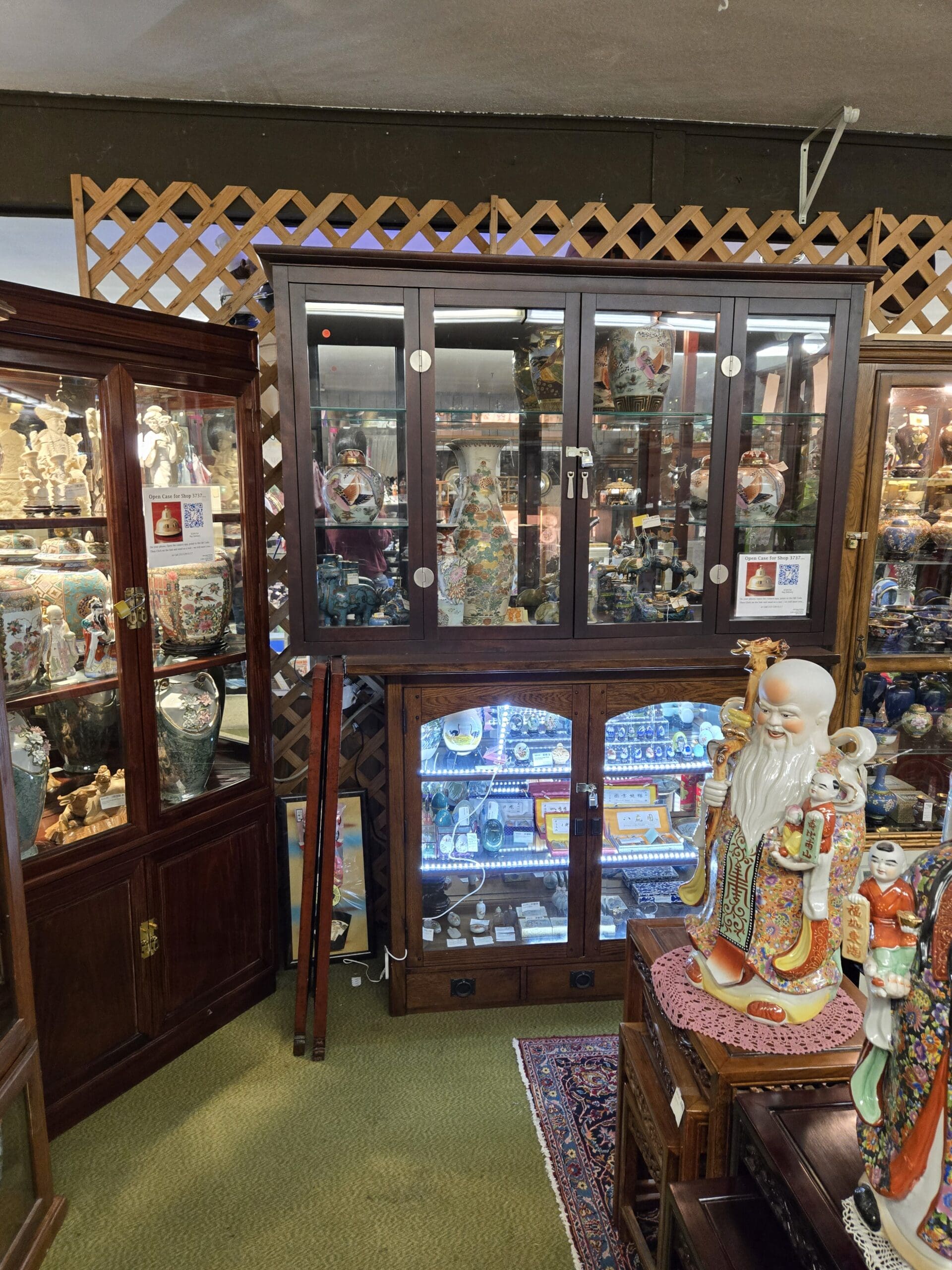 Visit Shop 3737, where Asian collectibles fill one of the mall's most visually stunning spaces. This is a destination shop for collectors and decorators drawn to the artistry of Chinese and Japanese antiques. Tall rosewood cabinets line the walls, each one glowing with hand-painted porcelain vases, lidded ginger jars, and famille rose pieces in vivid pinks, yellows, greens, and golds. A floor-standing vase with gilded handles and medallion panels commands attention at the center of the room, surrounded by richly robed porcelain figurines depicting traditional Chinese deities including Shou, the god of longevity. The scope and quality of the Asian collectibles here make this shop a standout in the Tacoma and Seattle area.