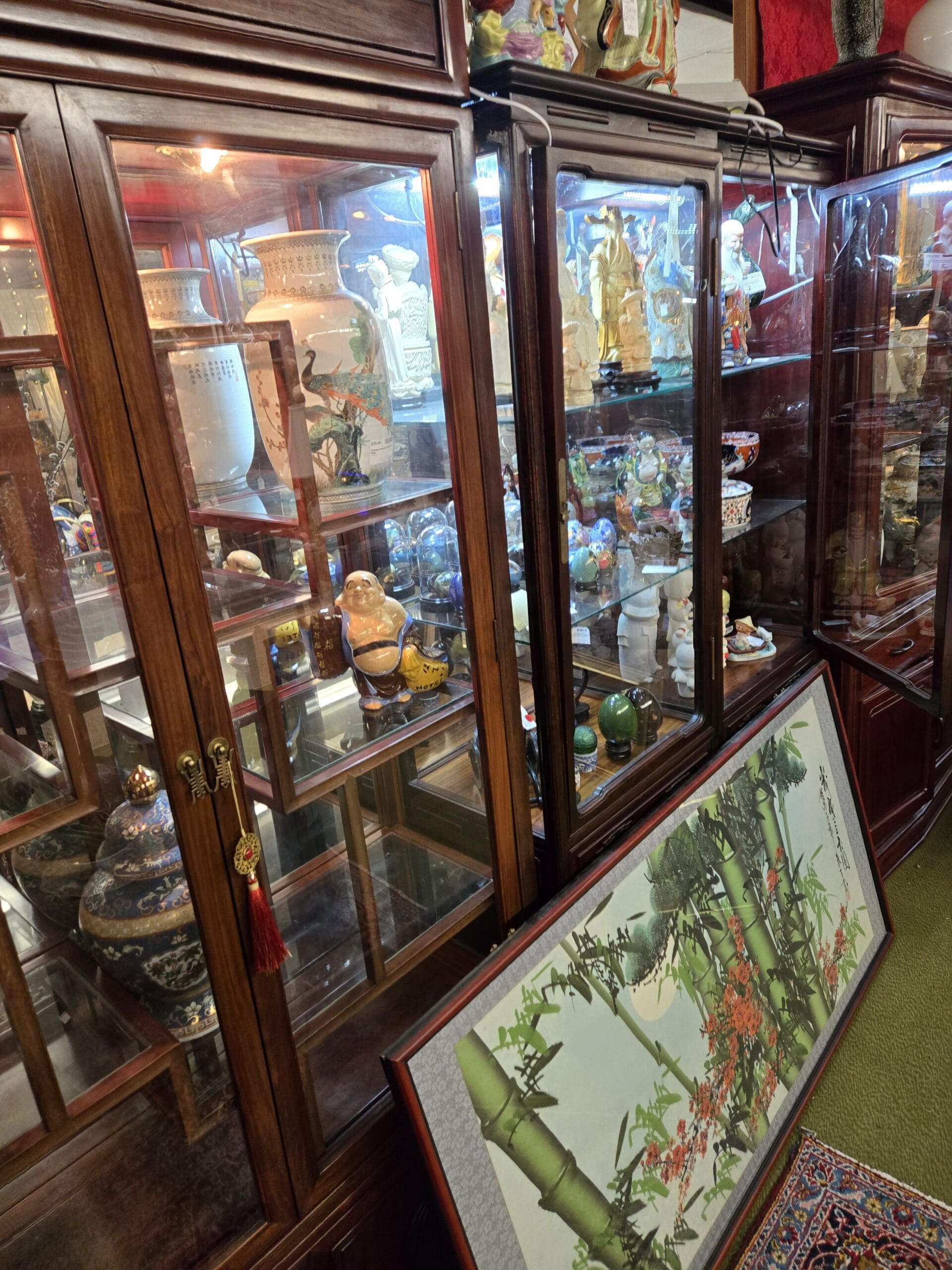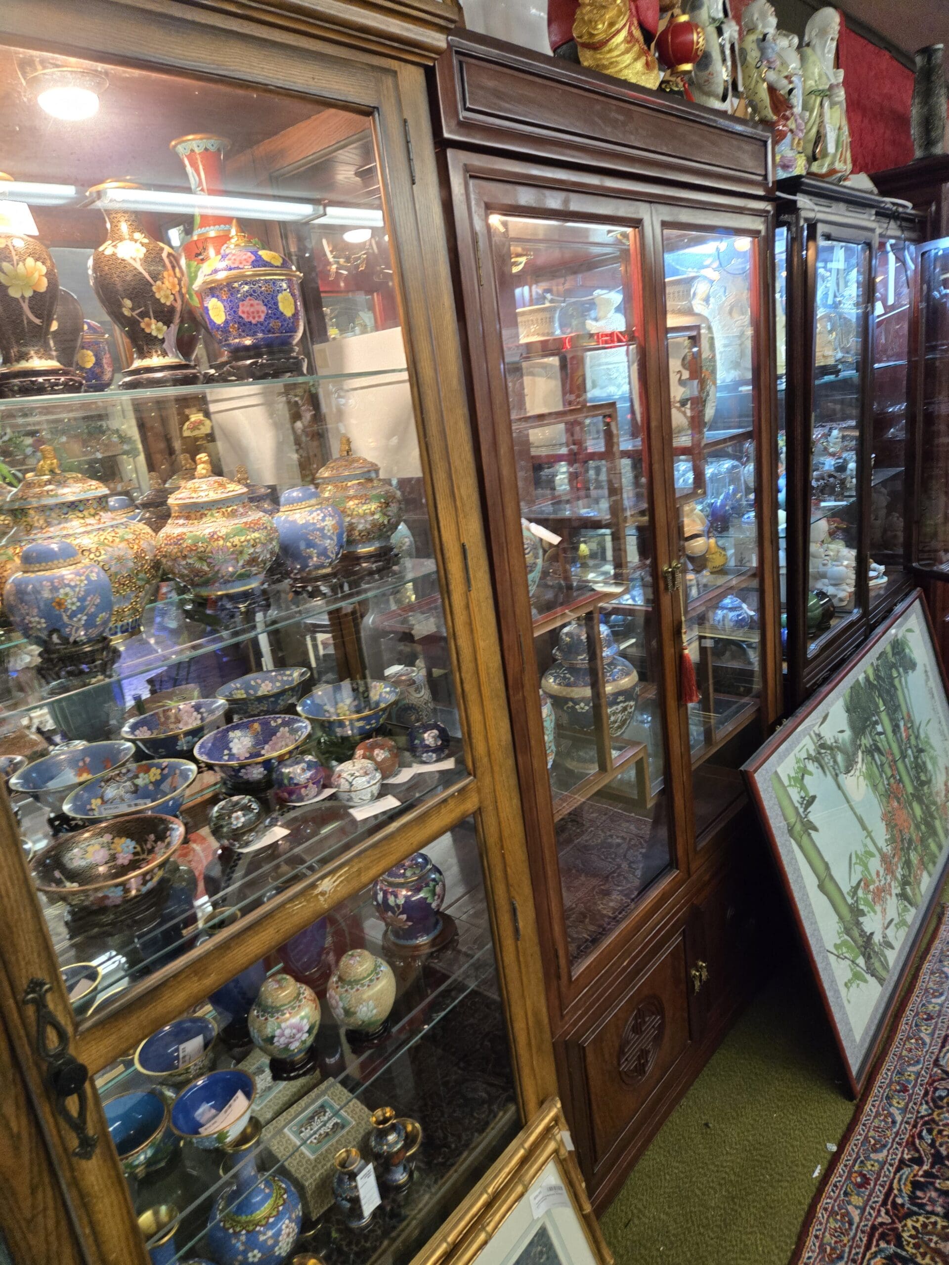 The furniture itself is part of the collection. Carved rosewood nesting tables, plant stands with scrollwork legs, low platform benches, and richly patterned Oriental rugs ground the space and give it the feeling of walking through a curated gallery. Red paper cut art and silk banners add pops of traditional color overhead. Whether you are searching for a statement vase, building a cloisonné collection, or simply looking for a unique piece of Asian art to bring warmth and character to your home, Shop 3737 is a space that rewards a slow, appreciative visit.