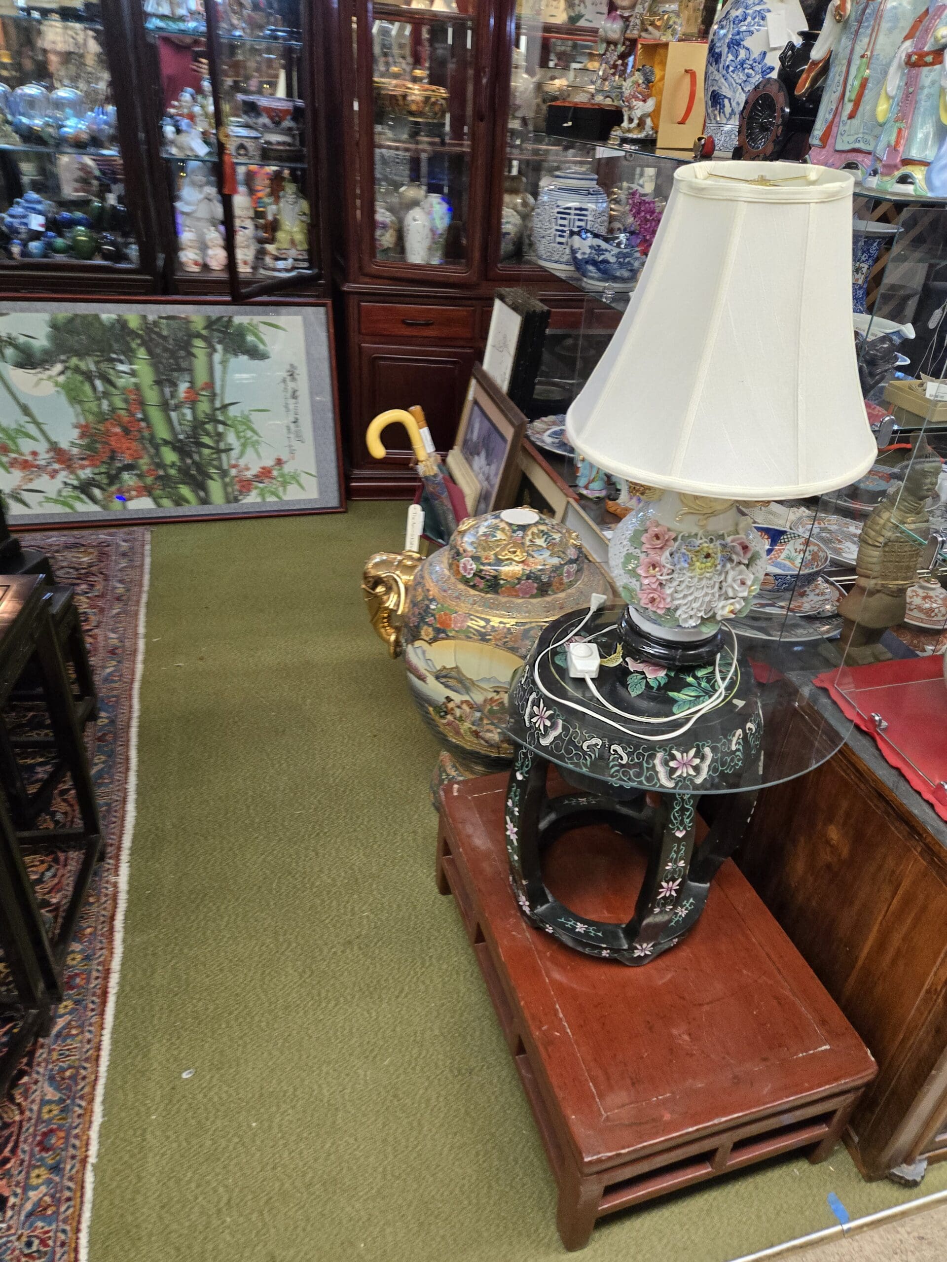 Cloisonné collectors will find shelf after shelf of enamelwork in deep cobalt blues, rich greens, and floral patterns across bowls, vases, lidded jars, and miniature accent pieces. Nearby, blue and white porcelain jars sit alongside delicate hand-painted tea bowls, calligraphy-inscribed vases, and smiling Buddha figures in warm glazes. Framed artwork featuring bamboo, birds, and traditional ink-wash landscapes leans against the furniture, and a lacquered garden stool with raised floral motifs serves as both a decorative piece and a lamp stand topped with an ornate porcelain lamp. Black lacquer boxes with gold and mother-of-pearl inlay are stacked high, adding another layer of craftsmanship to explore.