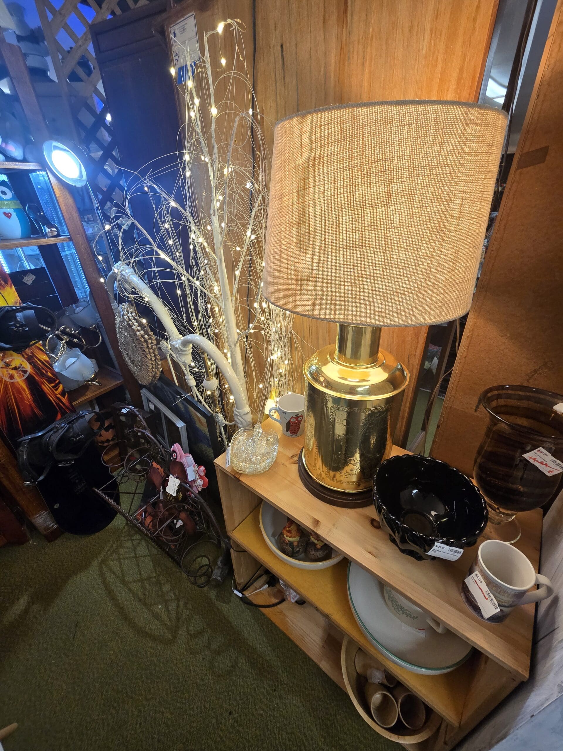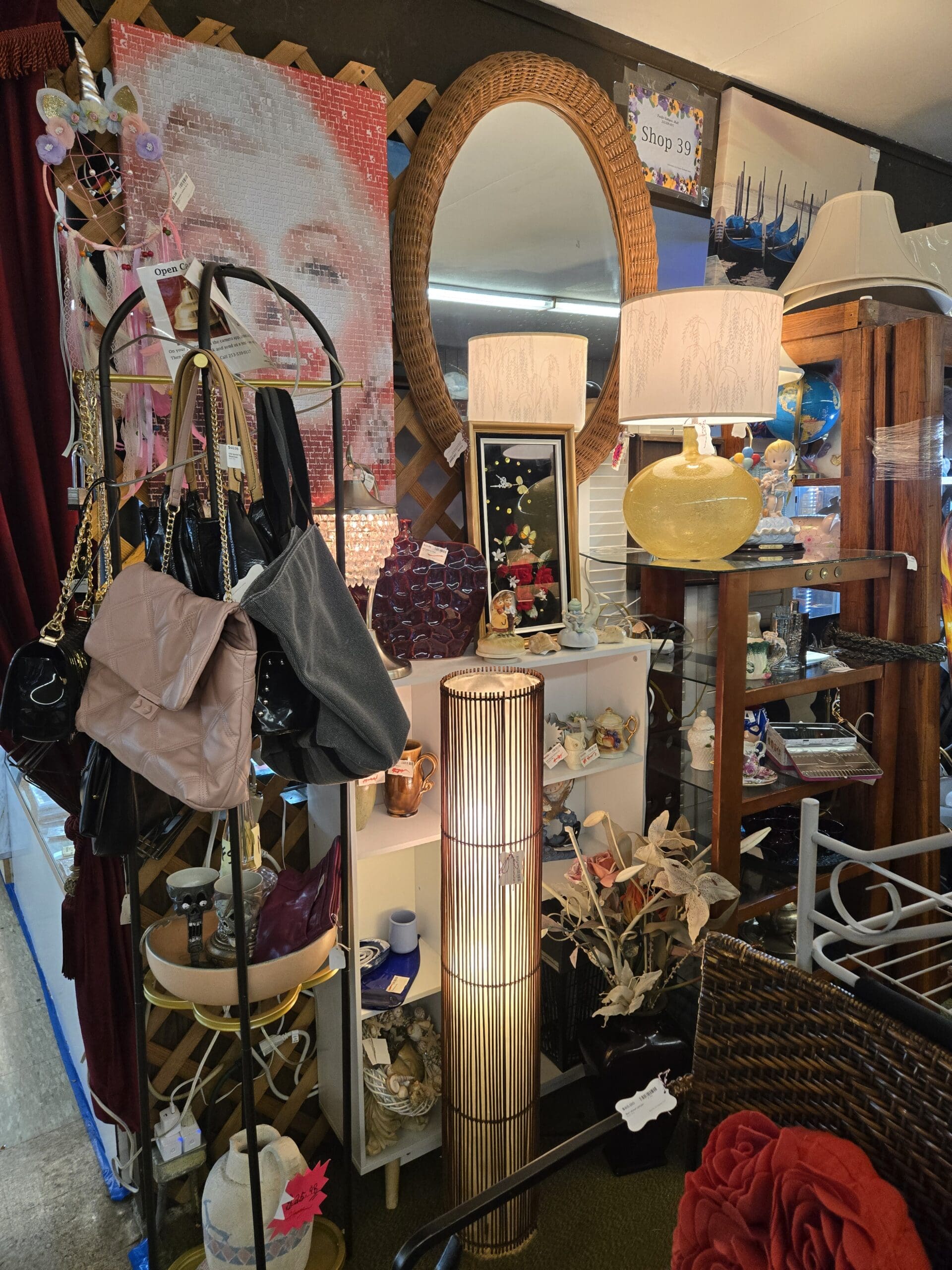 Visit Shop 39, where a bold mosaic-style portrait and a flickering bamboo floor lamp welcome you into a space brimming with creative home décor. This shop blends farmhouse warmth with modern flair-a wicker-framed oval mirror, galvanized metal lanterns with fairy lights, and a striking blue-and-white floral ceramic table lamp on a gorgeous two-tiered walnut parlor table. A tall brass lamp with a burlap drum shade glows warmly in the corner, and a lighted white branch tree in a crystal vase adds a magical touch.