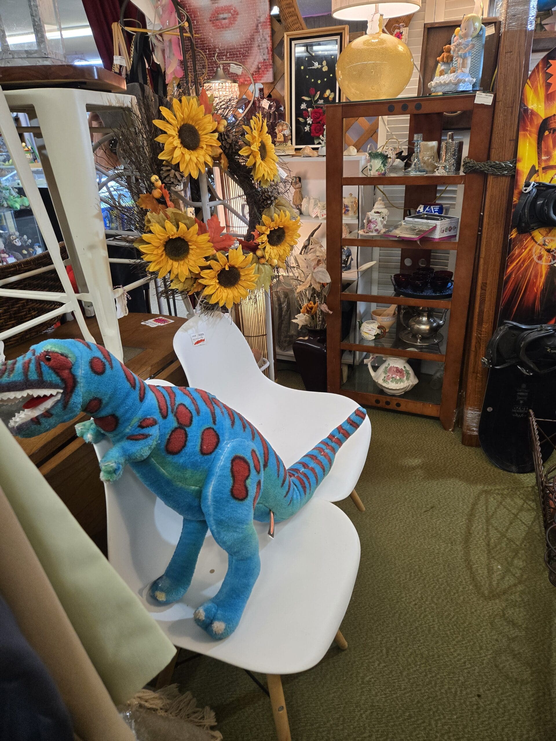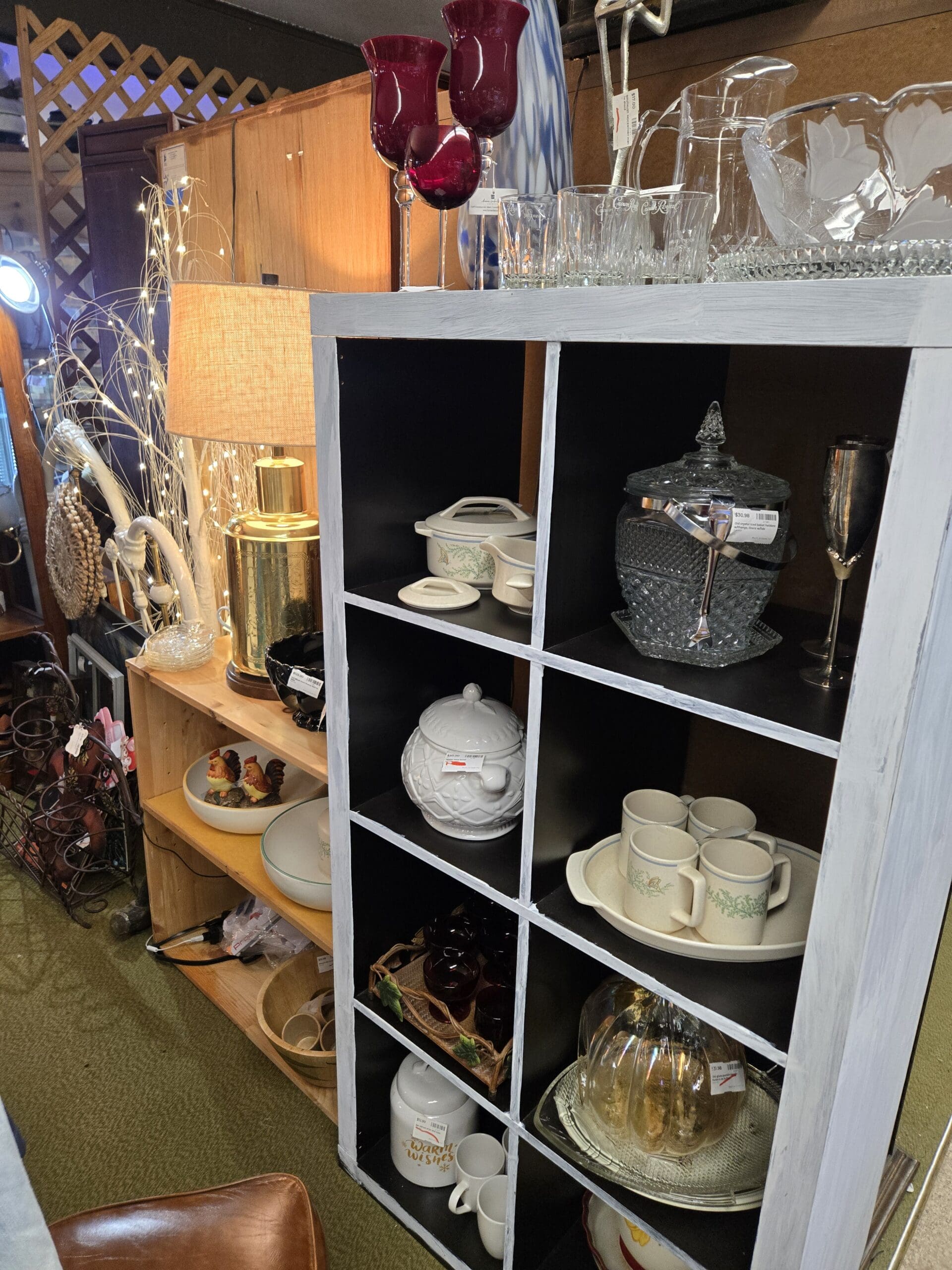 Furniture hunters will appreciate the industrial-style white metal stools with wooden tops, a woven rattan bench with iron frame, and a sleek white Eames-style shell chair currently guarded by a colorful plush T-Rex. A whitewashed cubby shelf holds elegant white stoneware tureens, a pressed glass biscuit jar, ruby red wine goblets, and matching floral mugs on a serving tray. Nearby, a wrought-iron wine rack, a copper Moscow mule mug, and Precious Moments figurines show off the shop's range.
