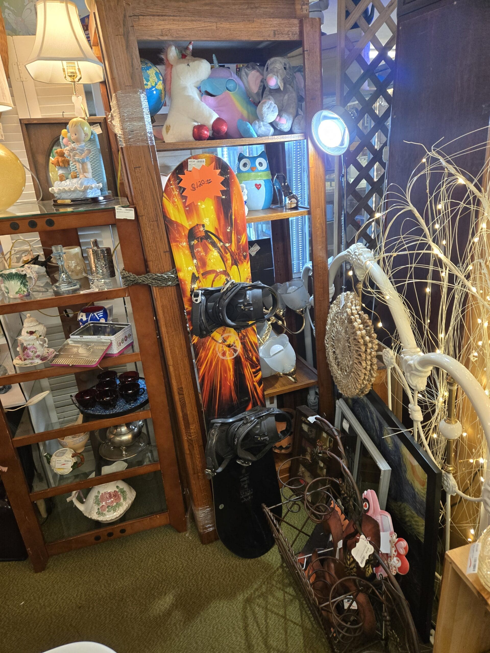 A clothing rack features light-wash denim overalls and soft pastel blouses, while a stand near the entrance holds an assortment of handbags in black, blush, and grey. A snowboard with blazing orange graphics leans against a shelf stacked with plush unicorns, stuffed elephants, and a whimsical owl figurine. A sunflower wreath, decorative throw pillows, rolled woven blankets, and a vintage globe complete the picture-Shop 39 is the kind of space where you walk in for one thing and leave with an armful.