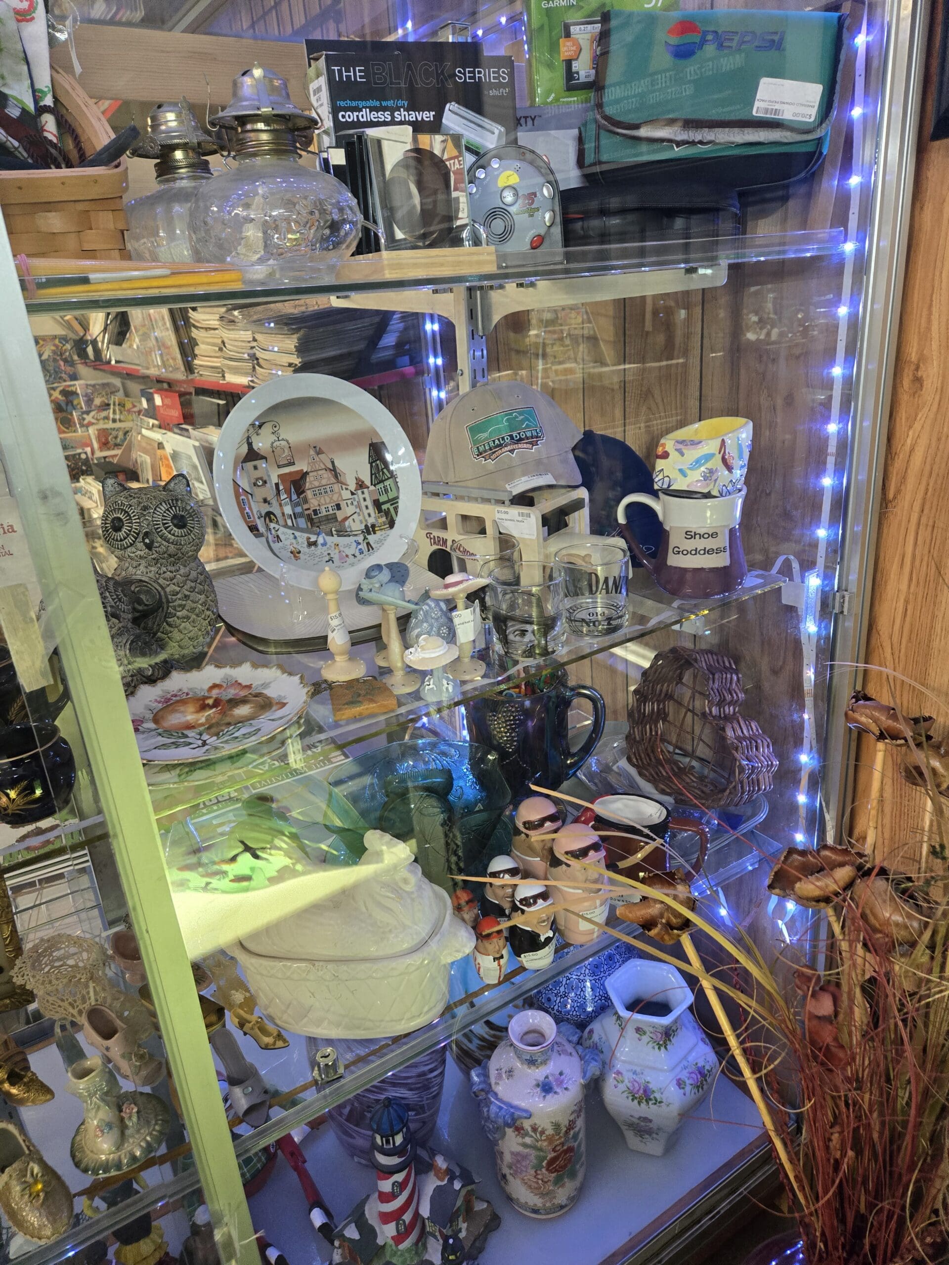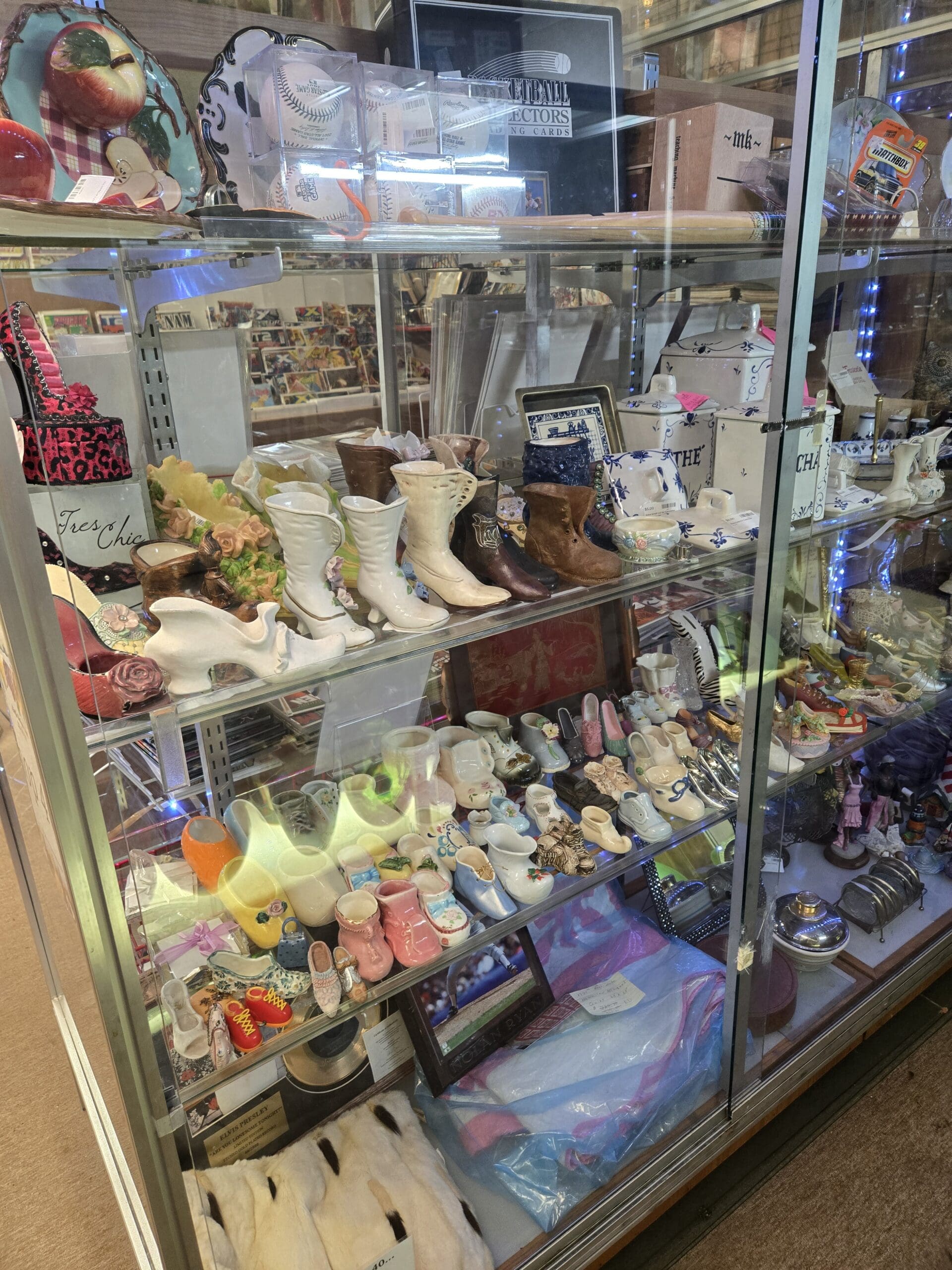 The surrounding shelves hold an equally eclectic mix: a clear glass hurricane oil lamp, a hand-painted German village collector's plate, an Emerald Downs baseball cap, and a "Shoe Goddess" novelty mug that fits the shop's theme perfectly. Painted figurines wearing sunglasses line up on toothpick-thin sticks, a ceramic hen-on-nest tureen sits nearby, and a miniature lighthouse rounds out the coastal touches. Souvenir plates, Matchbox cars still in packaging, a vintage Pepsi cooler bag, and a leather baseball glove tucked in the corner prove there's plenty here beyond the shoes-though those tiny boots are hard to walk away from.