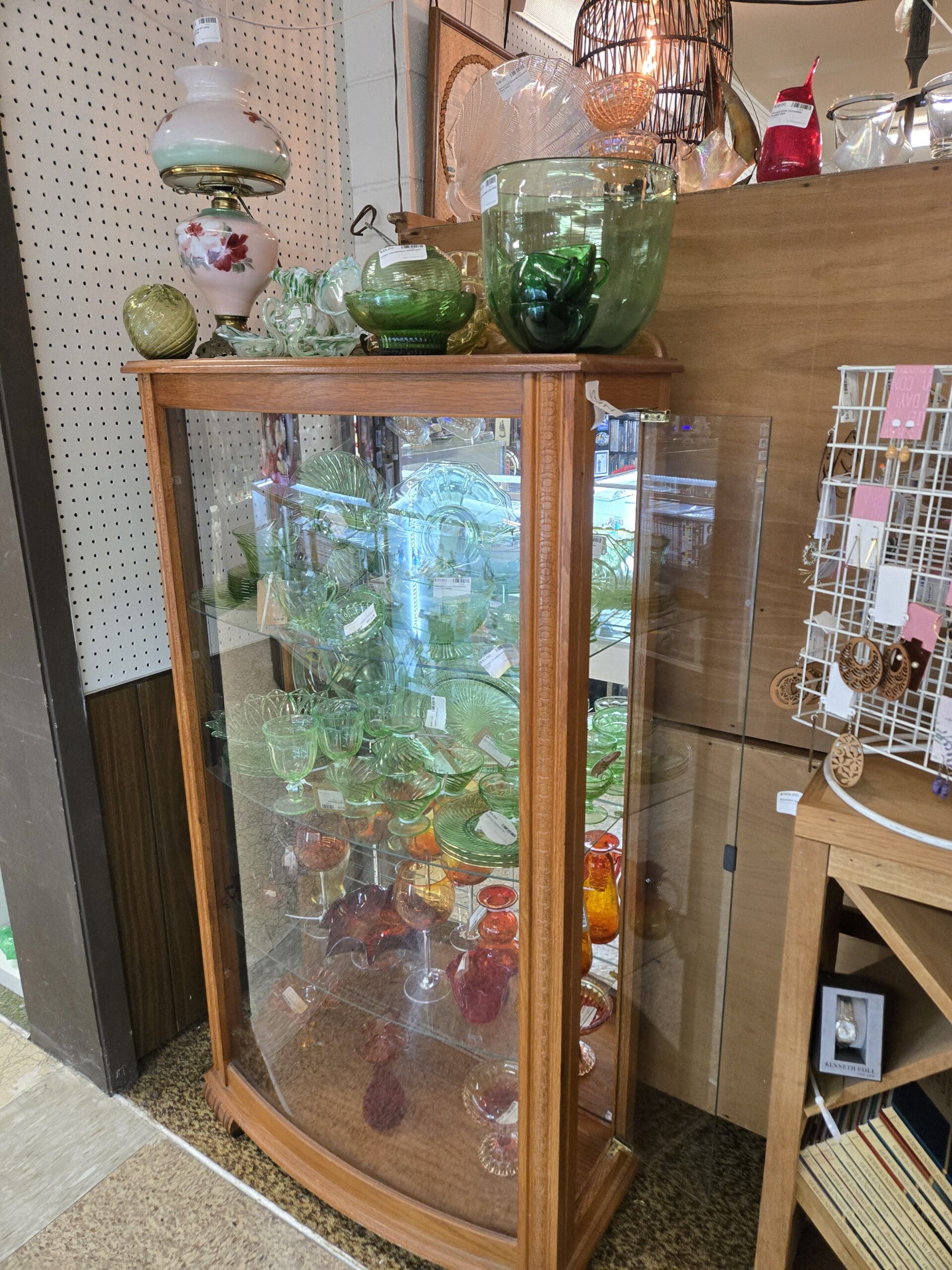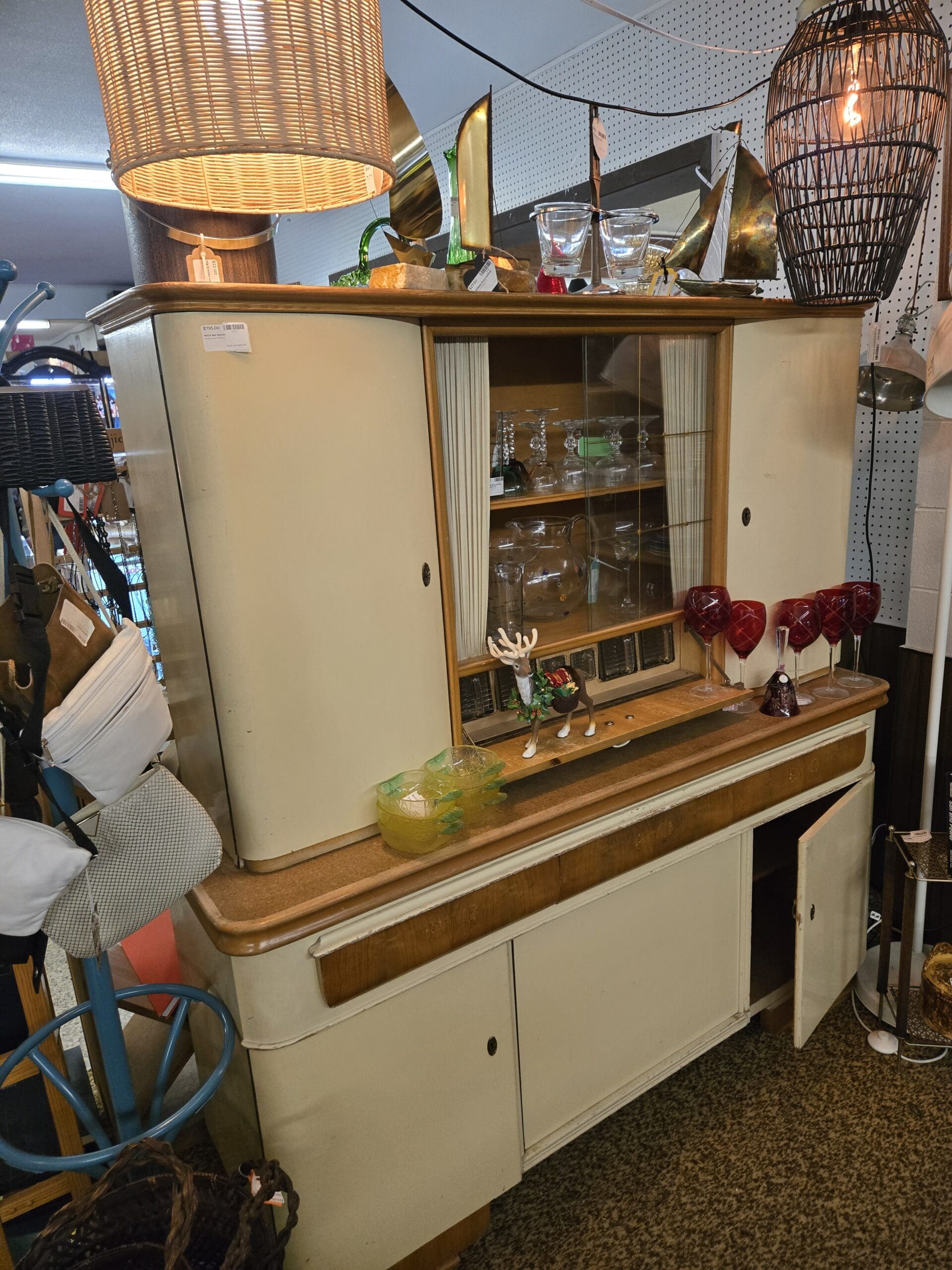 Glass collectors will want to linger at the curved oak curio filled with Depression-era glass in gorgeous greens and ambers-sherbet dishes, footed bowls, ruffled-edge plates, and swirled vases glow beautifully under the light. A hand-painted floral hurricane oil lamp crowns the top, while ruby red cut-crystal goblets and elegant pink-stemmed wine glasses offer a more formal touch. Nearby, a stunning mid-century cream-and-wood china cabinet with sliding glass doors holds additional stemware and makes a statement piece all on its own. Brass sailboat sculptures and emerald green art glass vases perch on top.