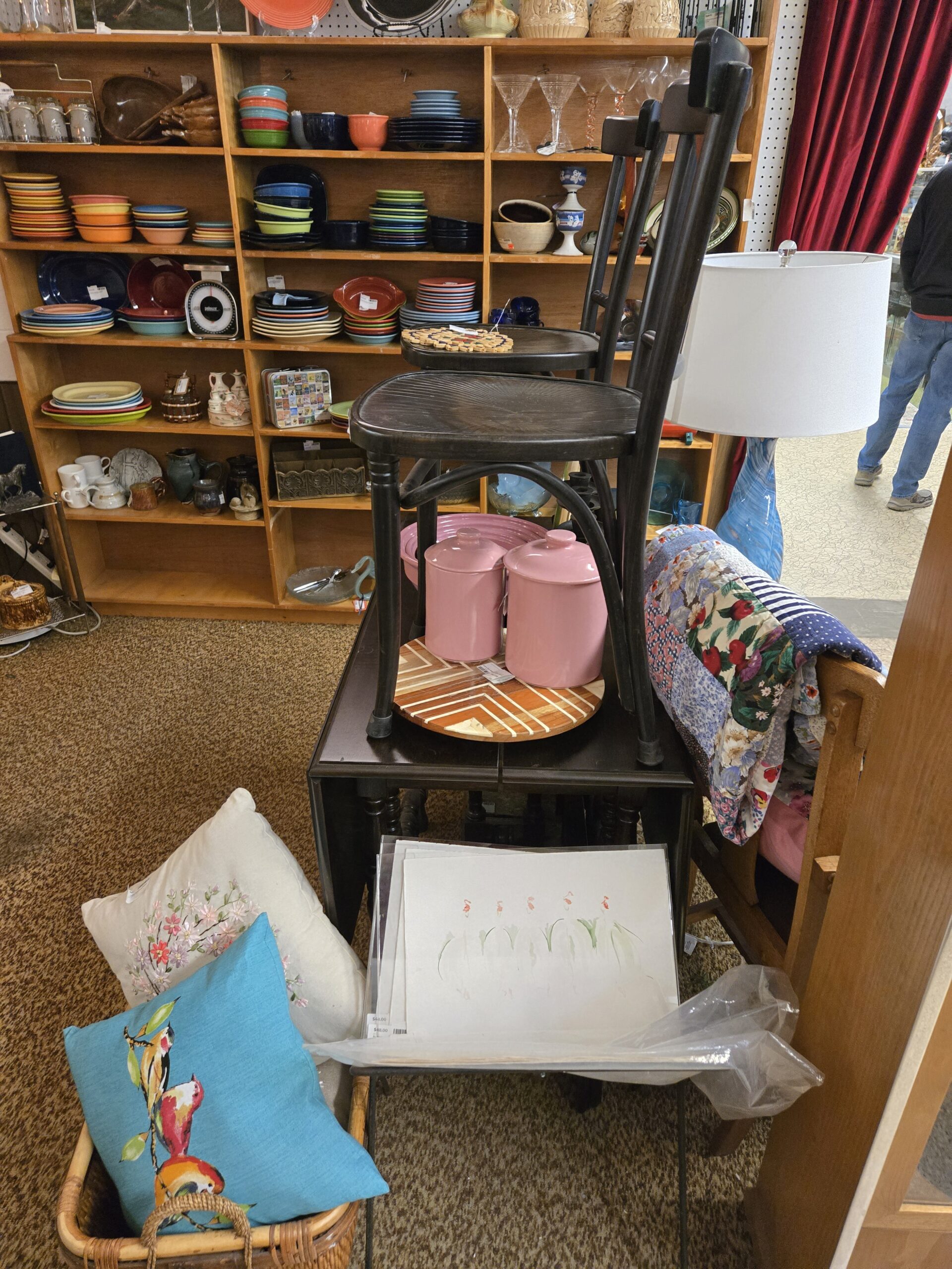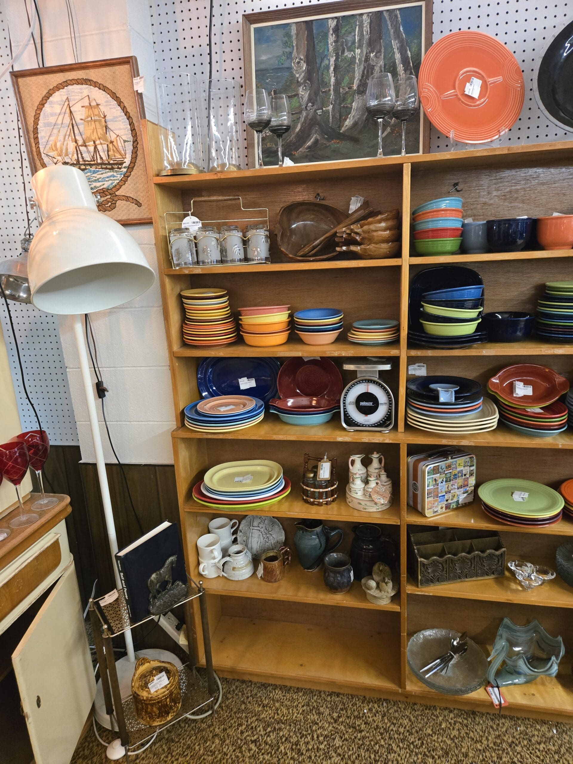 Visit Shop 41, where a rainbow of Fiesta dinnerware immediately draws the eye. Shelves upon shelves of plates, bowls, and platters in cobalt blue, persimmon orange, sunflower yellow, shamrock green, and rose pink make this a destination for Fiesta collectors looking to fill out a set or start a new one. Handmade stoneware pitchers and mugs in earthy glazes sit alongside the bright Fiesta stacks, and a vintage Pelouze kitchen scale and carved wooden salad bowl with utensils add to the culinary charm.