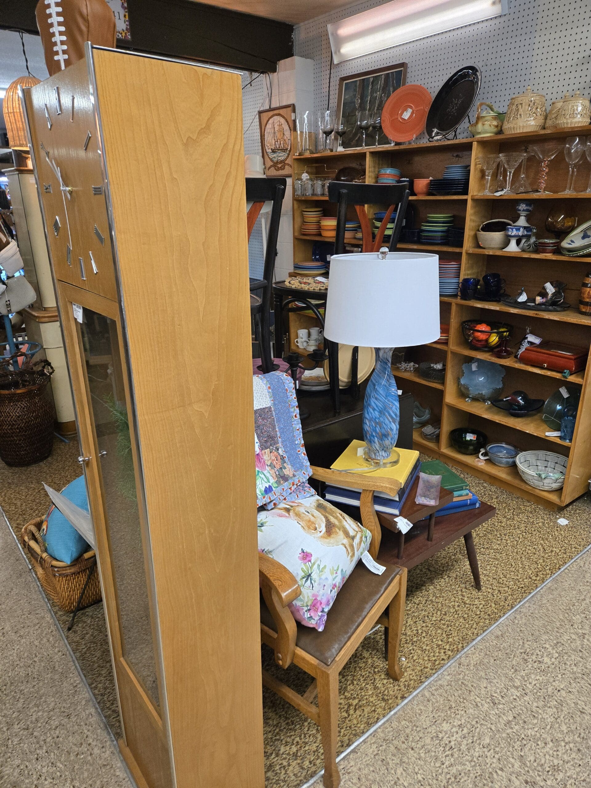 Beyond the dinnerware and glass, Shop 41 is full of thoughtful accents. Adajio jewelry hangs from a spinning display-beaded necklaces, carved wood earrings, and turquoise pieces catch the light. A blue marble-swirl table lamp sits on a mid-century side table stacked with books, while embroidered throw pillows, a patchwork quilt, and a woven rattan basket soften the space. A tall birch-front wardrobe with a full-length mirror, a dark bentwood café chair topped with pink ceramic canisters, and a rope-framed sailing ship wall art give the shop a collected, layered feel that keeps you exploring.