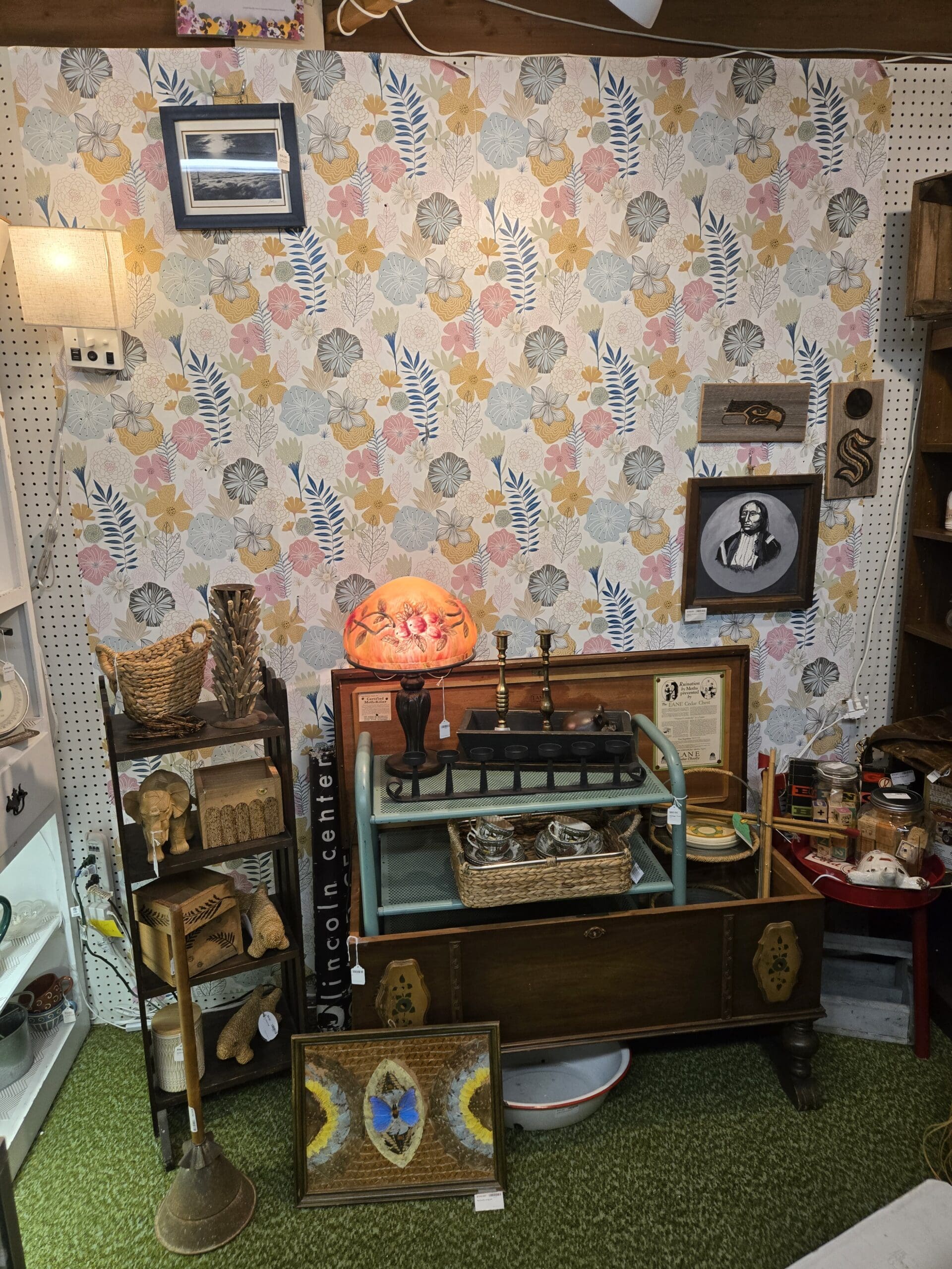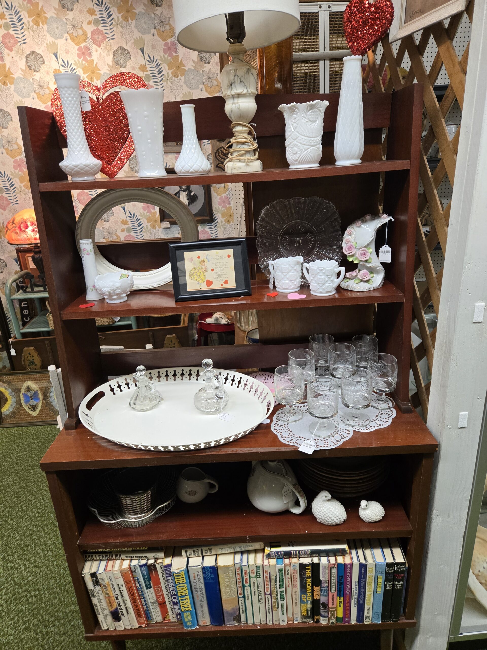 Visit Shop 428, where a cheerful floral wallpaper backdrop sets the scene for a shop brimming with cottage-style character. Milk glass collectors will love the top shelf of a walnut bookcase lined with bud vases, owl vases, and hobnail pieces in classic white, while a rose-adorned pitcher and matching sugar bowl add a romantic touch. Below, a white enamel tray holds crystal figurines, and a collection of etched glass tumblers sits ready for a dinner party. Paperback novels fill the bottom shelf for those who like to browse with a book in hand.