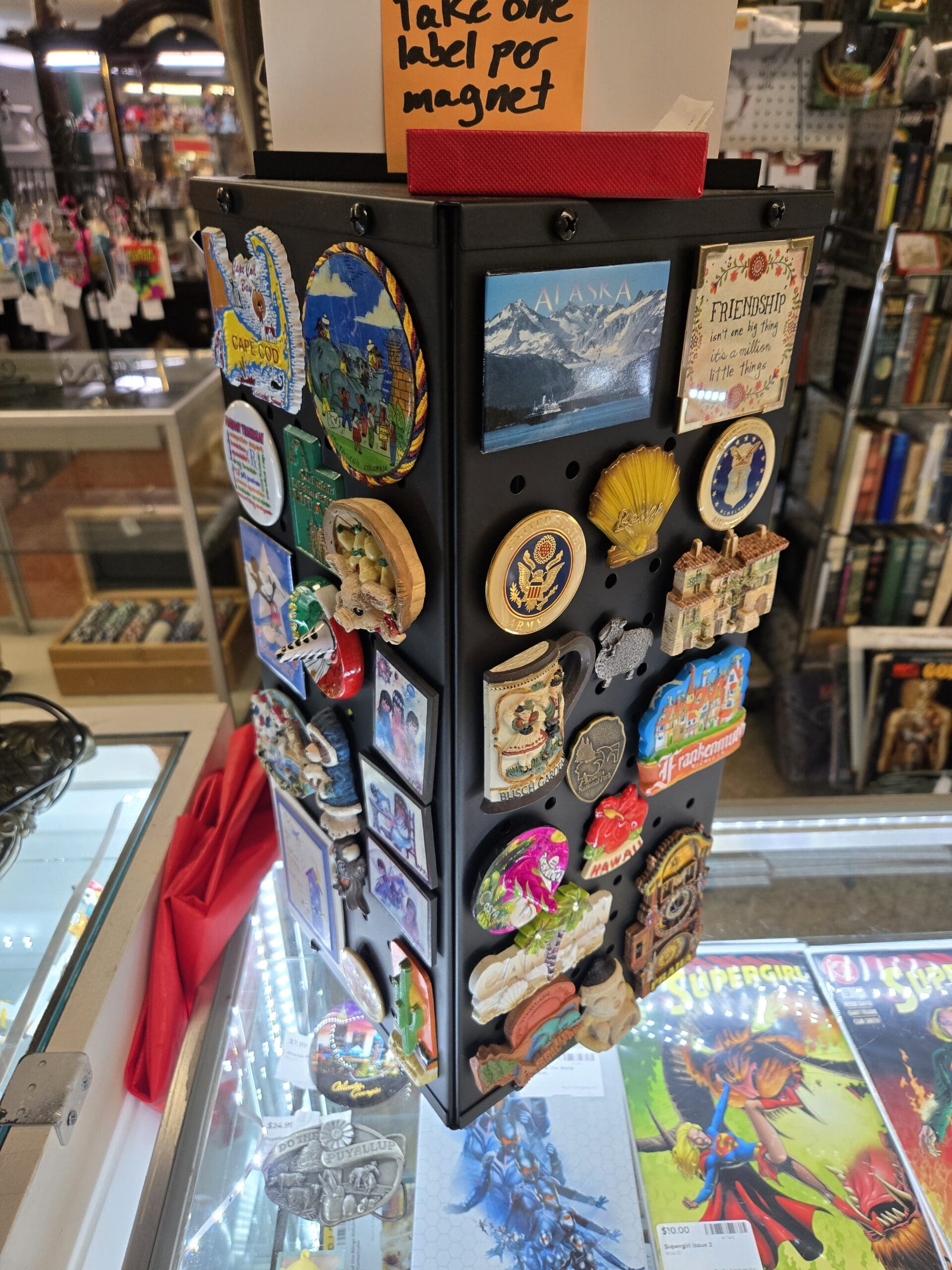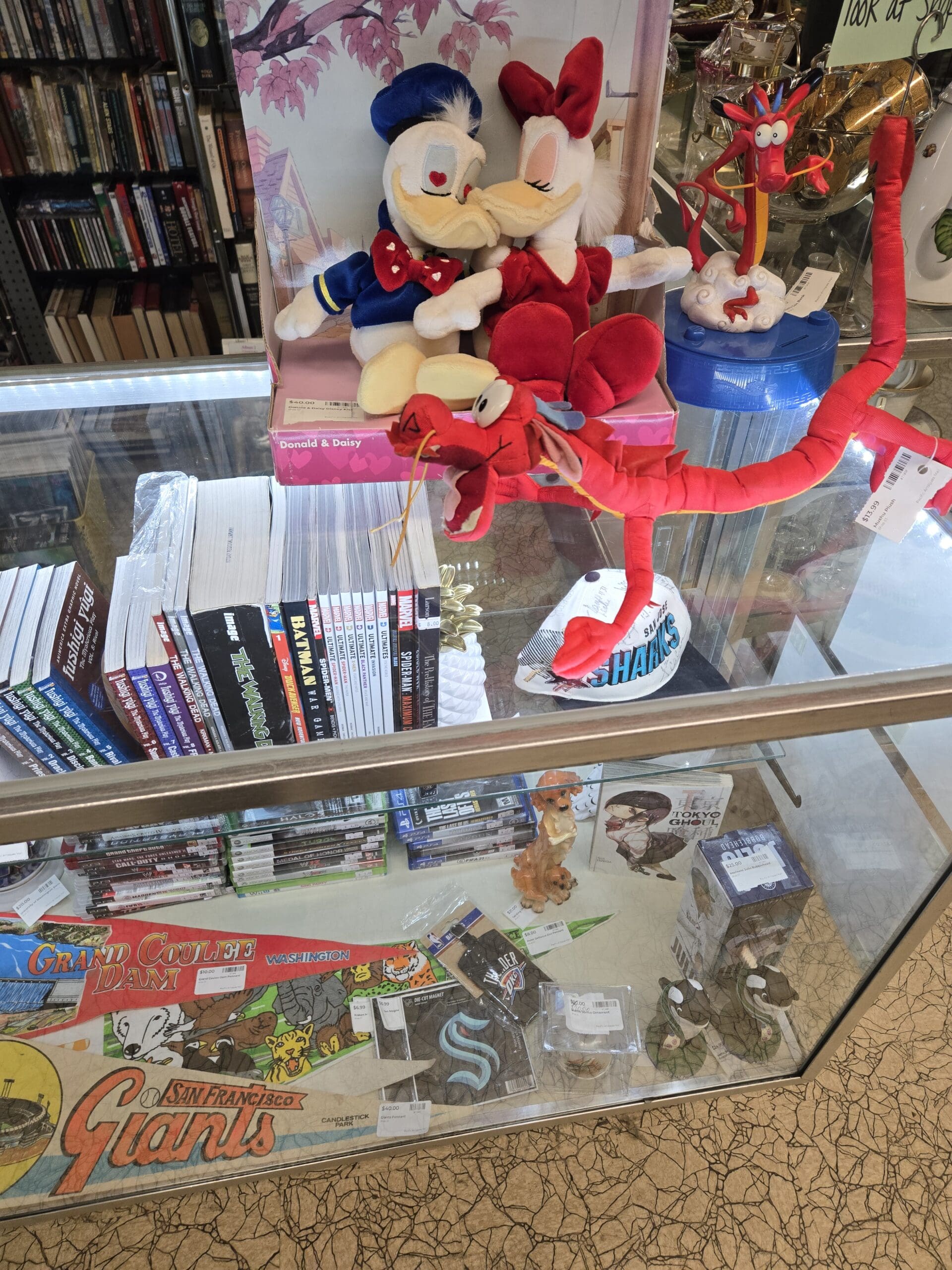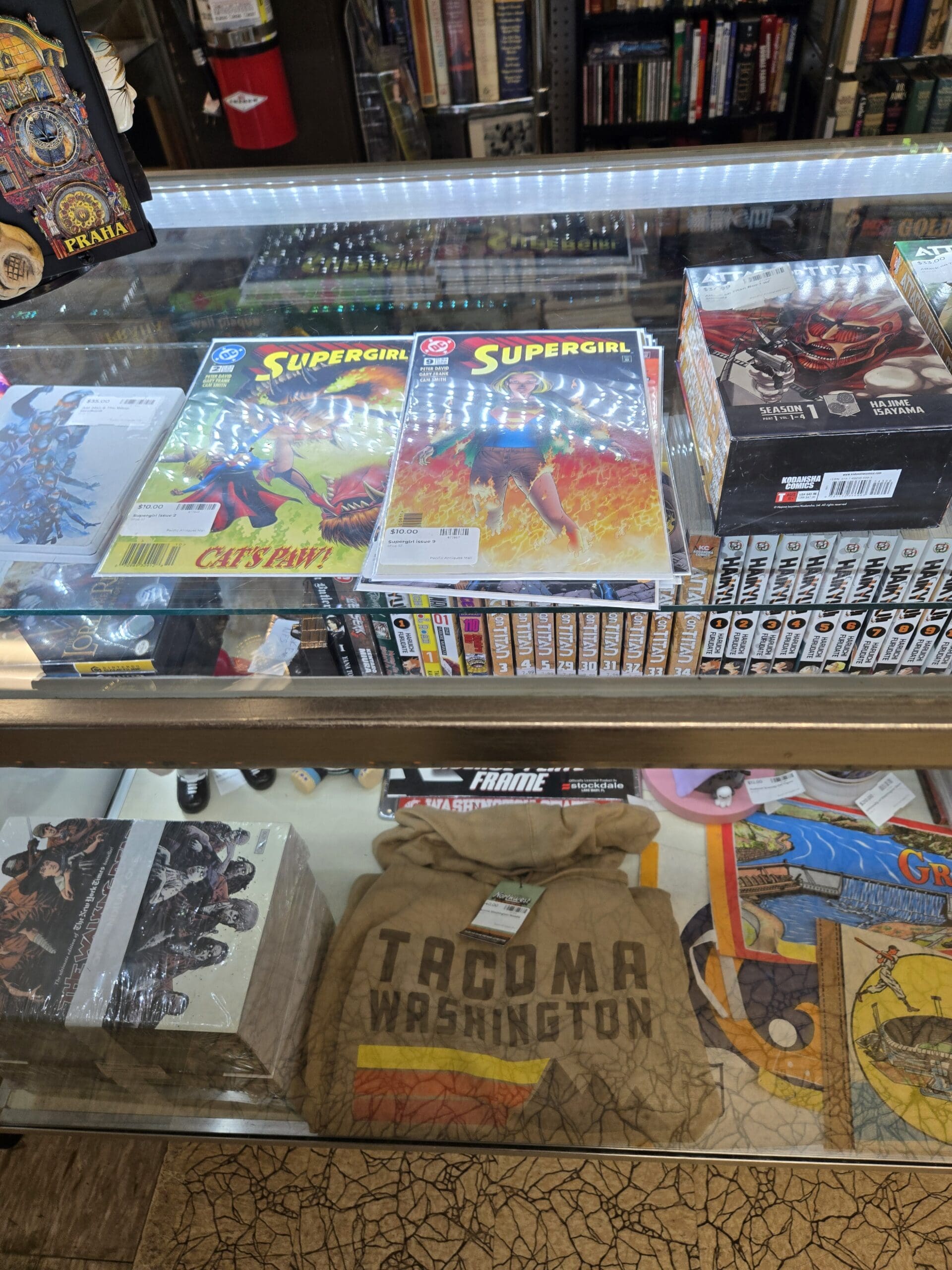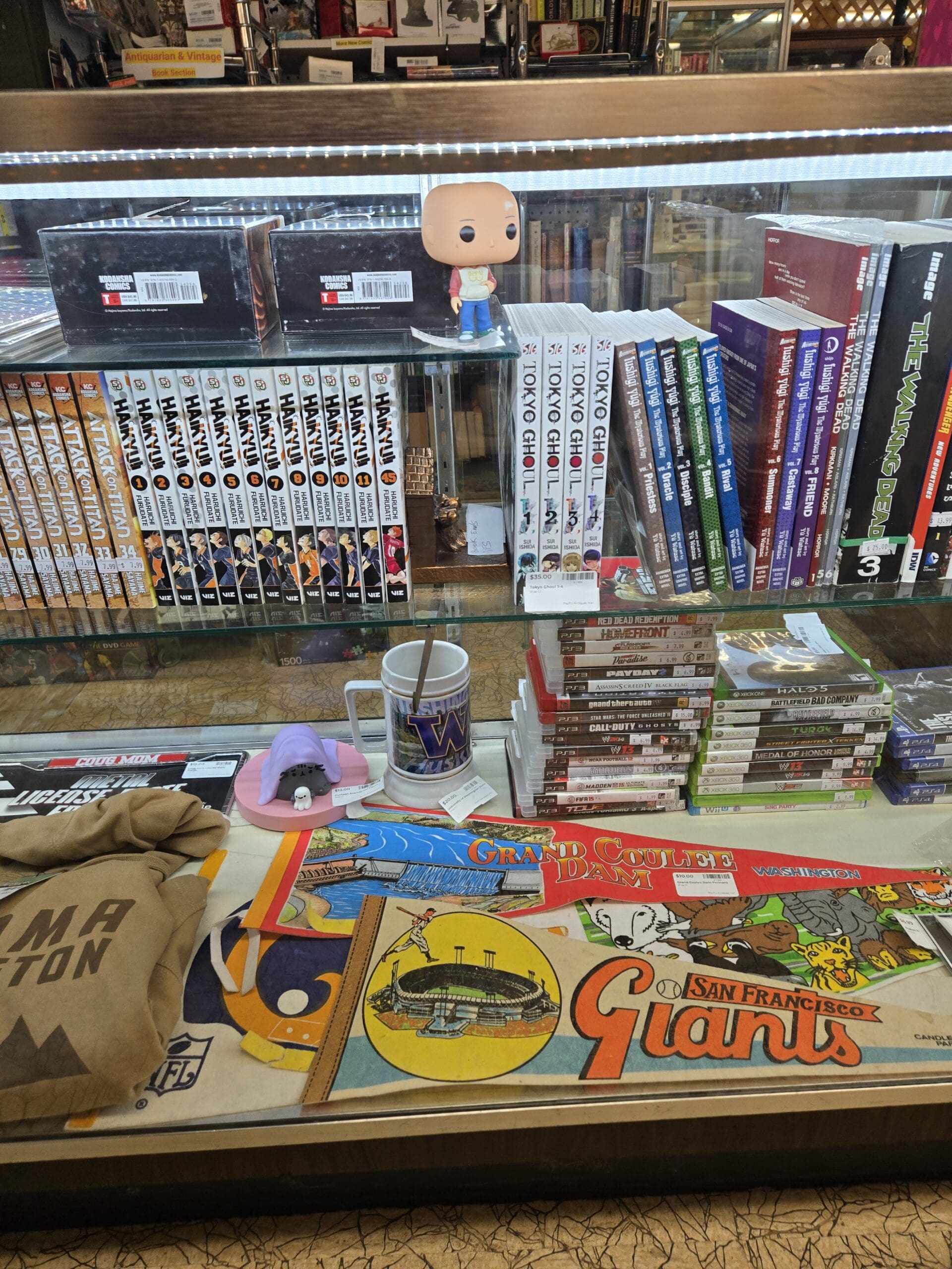 Gamers will dig the stack of Nintendo GameCube titles including Lord of the Rings, Star Wars: Bounty Hunter, X-Men Legends, and Top Gun: Combat Zones, plus PS3, PS4, Xbox, and Wii games ranging from Red Dead Redemption and Grand Theft Auto to Call of Duty and Halo 5. Sports fans can browse vintage pennants from Grand Coulee Dam and the San Francisco Giants at Candlestick Park, a Seattle Kraken puck, a University of Washington mug, and a Tacoma Washington hoodie. A spinning rack of souvenir magnets from Alaska, Hawaii, Cape Cod, and beyond rounds things out with a fun travel vibe. Shop 53 is a compact hub where geek culture and Pacific Northwest pride happily coexist.
