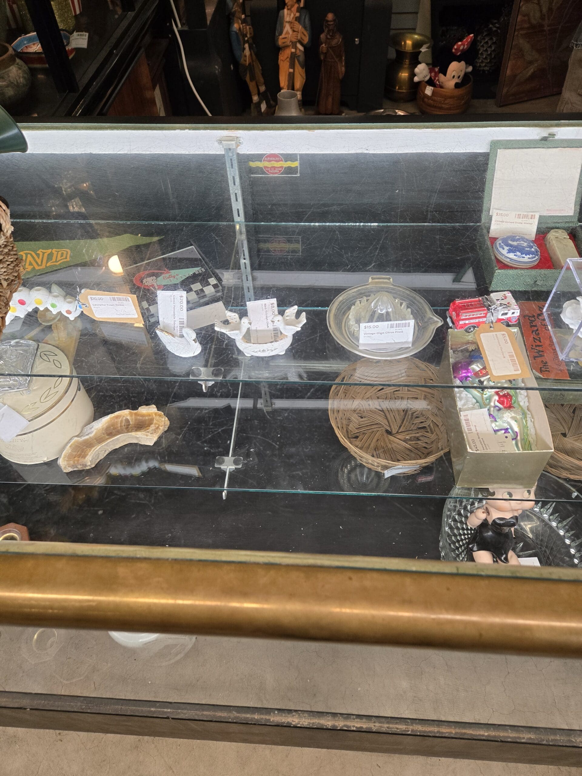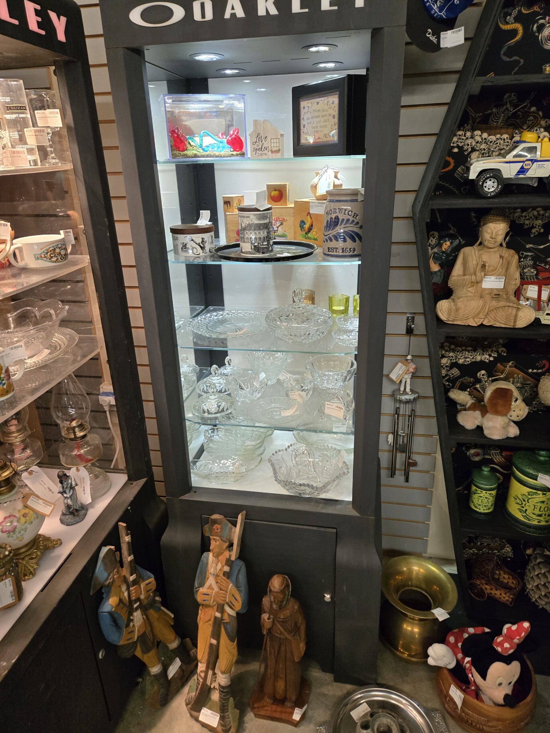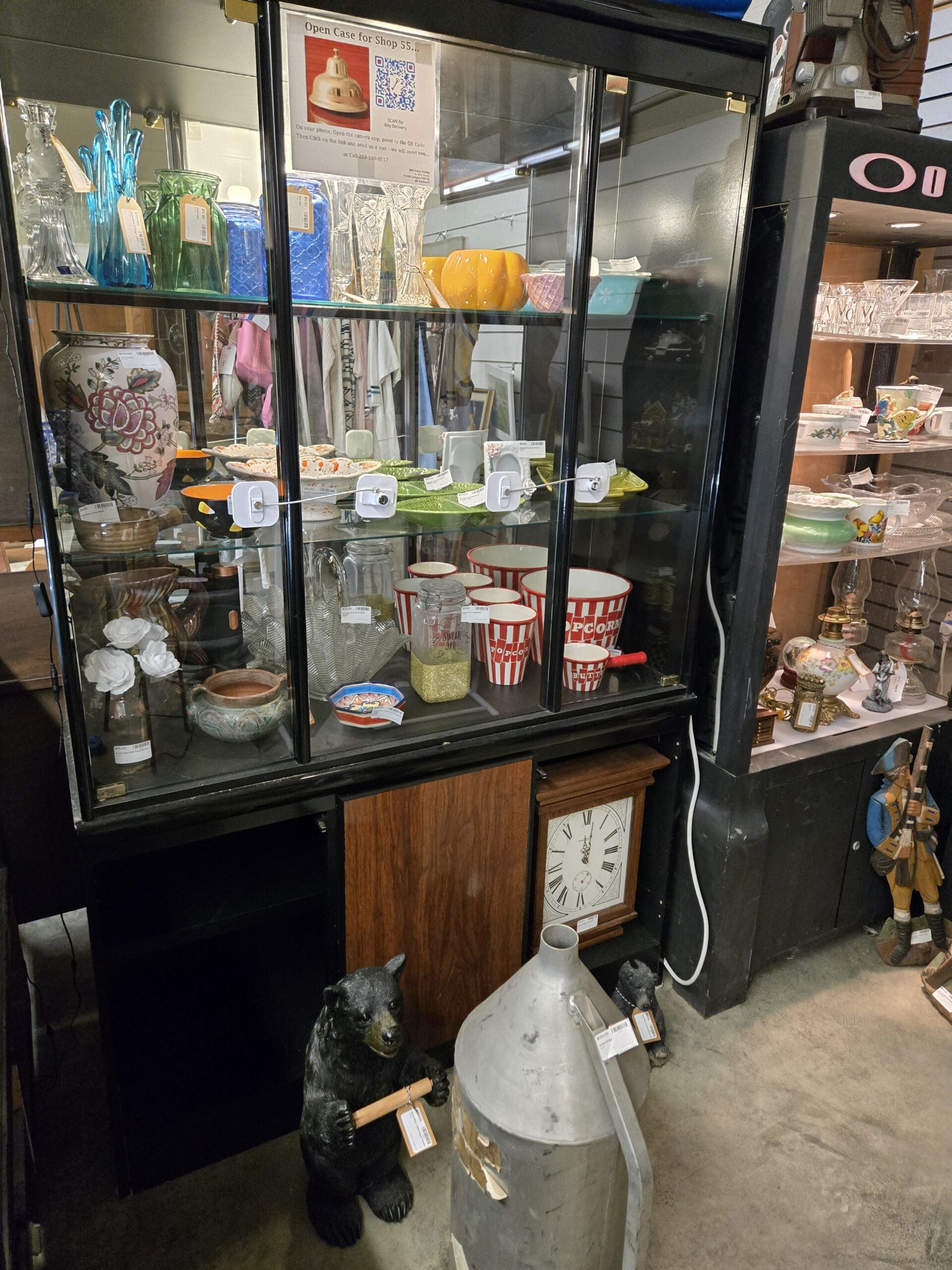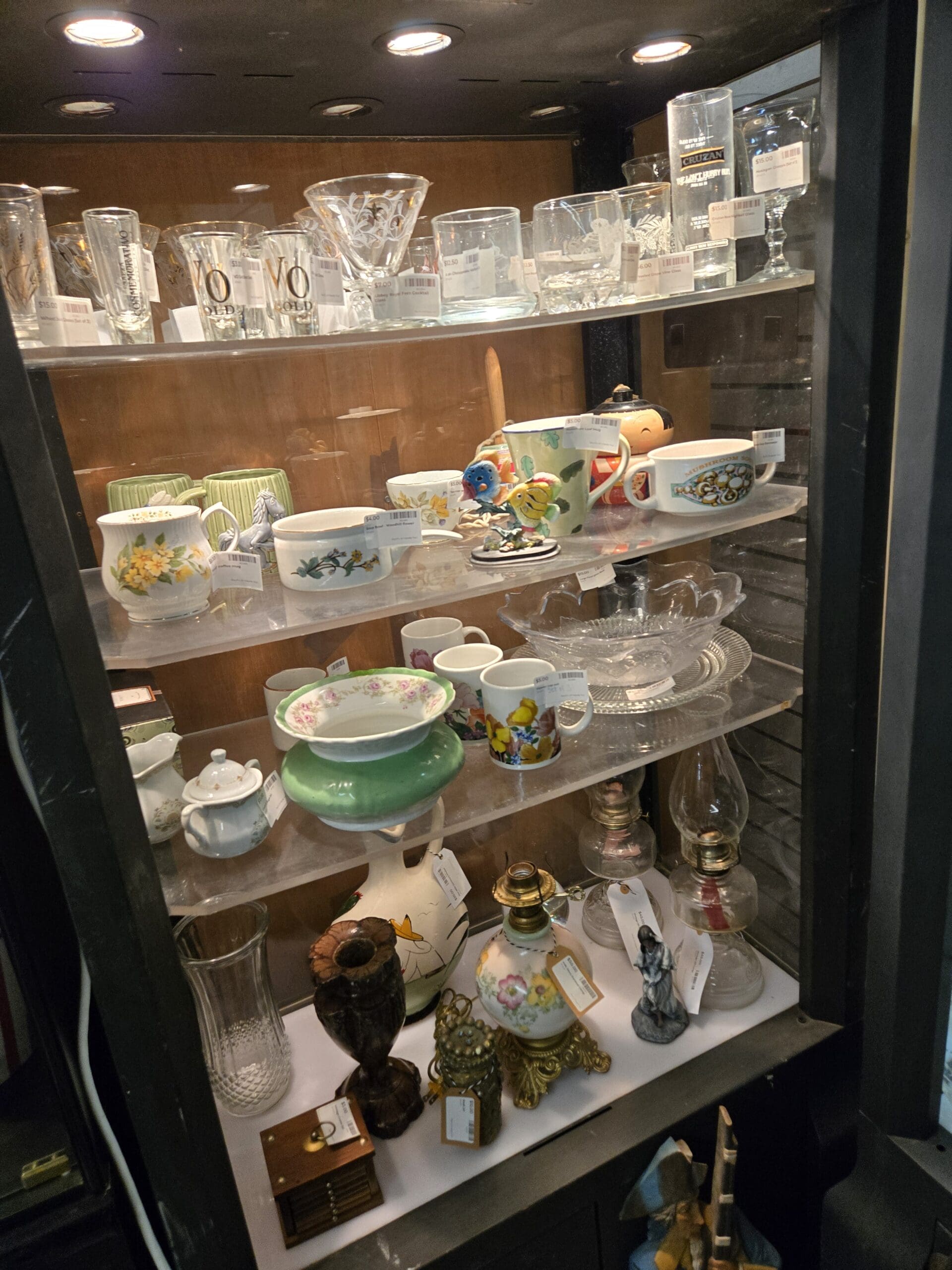 Visit Shop 55, where the unexpected is the whole point. This shop has a wonderfully eclectic personality, mixing fine crystal and vintage glassware with quirky collectibles and everyday treasures. A tall tower is packed with sparkling cut crystal bowls, candy dishes, and lidded compotes, while nearby shelves hold colorful art glass vases in teal, green, and cobalt blue alongside a large hand-painted Asian-style vase with bold floral motifs. Vintage oil lamps with hand-painted floral globes and clear glass chimneys bring old-fashioned warmth, and a set of cheerful red-and-white-striped popcorn buckets adds retro kitchen fun.