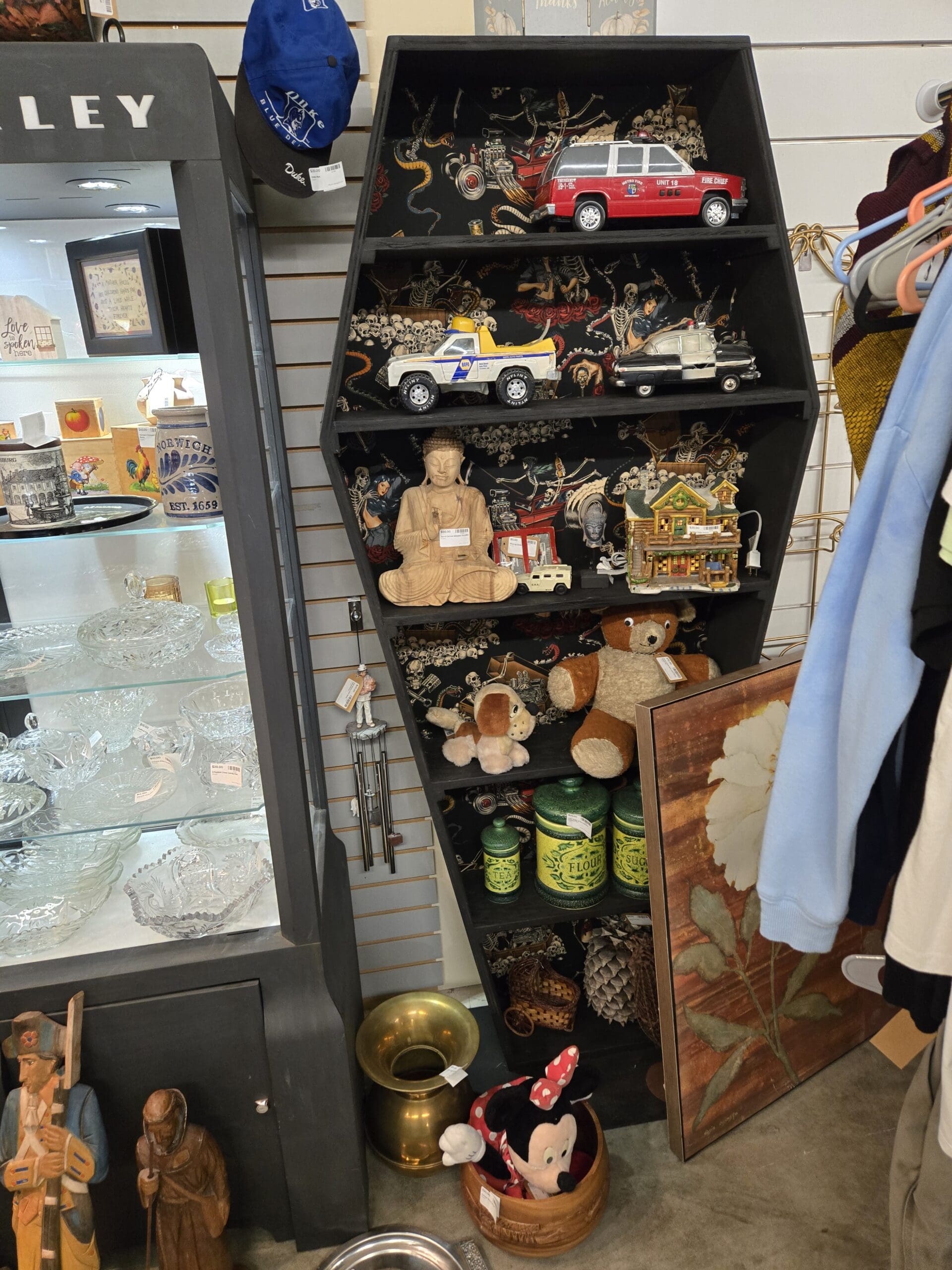 The curiosity factor runs high here. A coffin-shaped bookshelf lined with skeleton-print fabric holds die-cast model trucks (including a fire chief rig and a utility pickup), a carved wooden Buddha, a lighted Christmas village building, and a set of green vintage-style flour, sugar, and tea canisters. Nearby you'll find a Moroccan-style jeweled mirror, wooden candlesticks with brass fittings, a Betty Boop doll, a Wizard of Oz book, a brass lotus candle holder, cow-shaped salt and pepper shakers, and a collection of souvenir barware including VO whiskey glasses and Cruzan rum stemware. Carved wooden saint figurines and a Minnie Mouse plush sit side by side, perfectly summing up this shop's playful range.