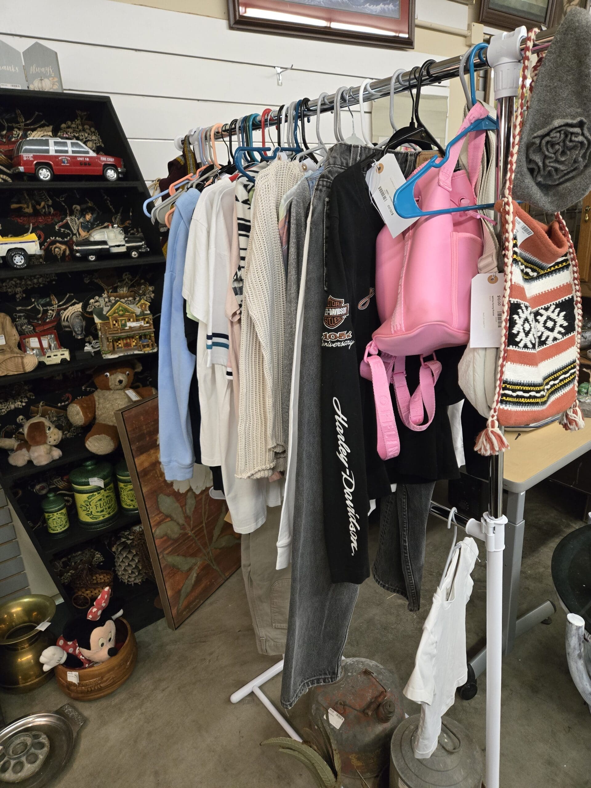 A clothing rack rounds things out with vintage and modern fashion finds, including a Harley-Davidson 105th Anniversary long-sleeve tee, knit sweaters, denim, a pink backpack, and woven crossbody bags. Whether you're hunting for a hand-painted Norwich stoneware crock, a floral magnolia canvas, or a set of dainty floral teacups, Shop 55 keeps you guessing in the best possible way.