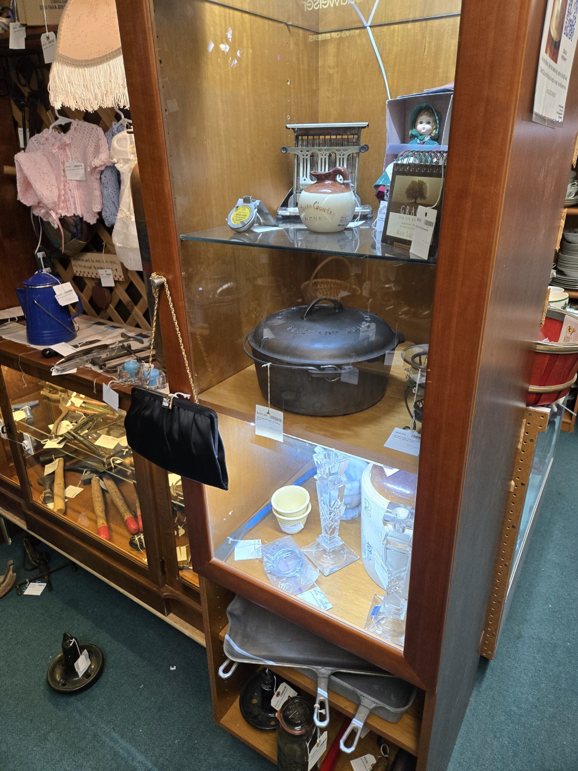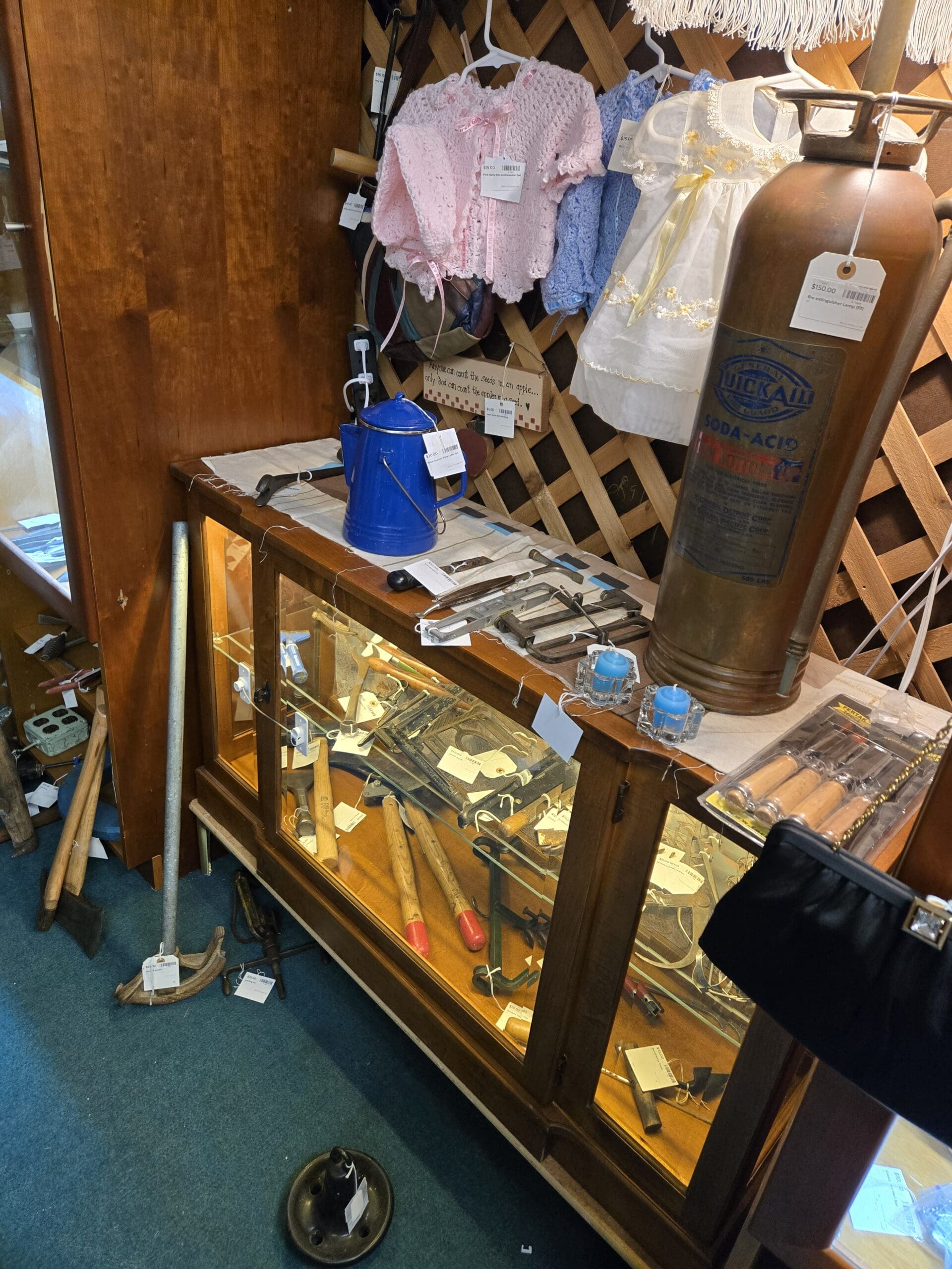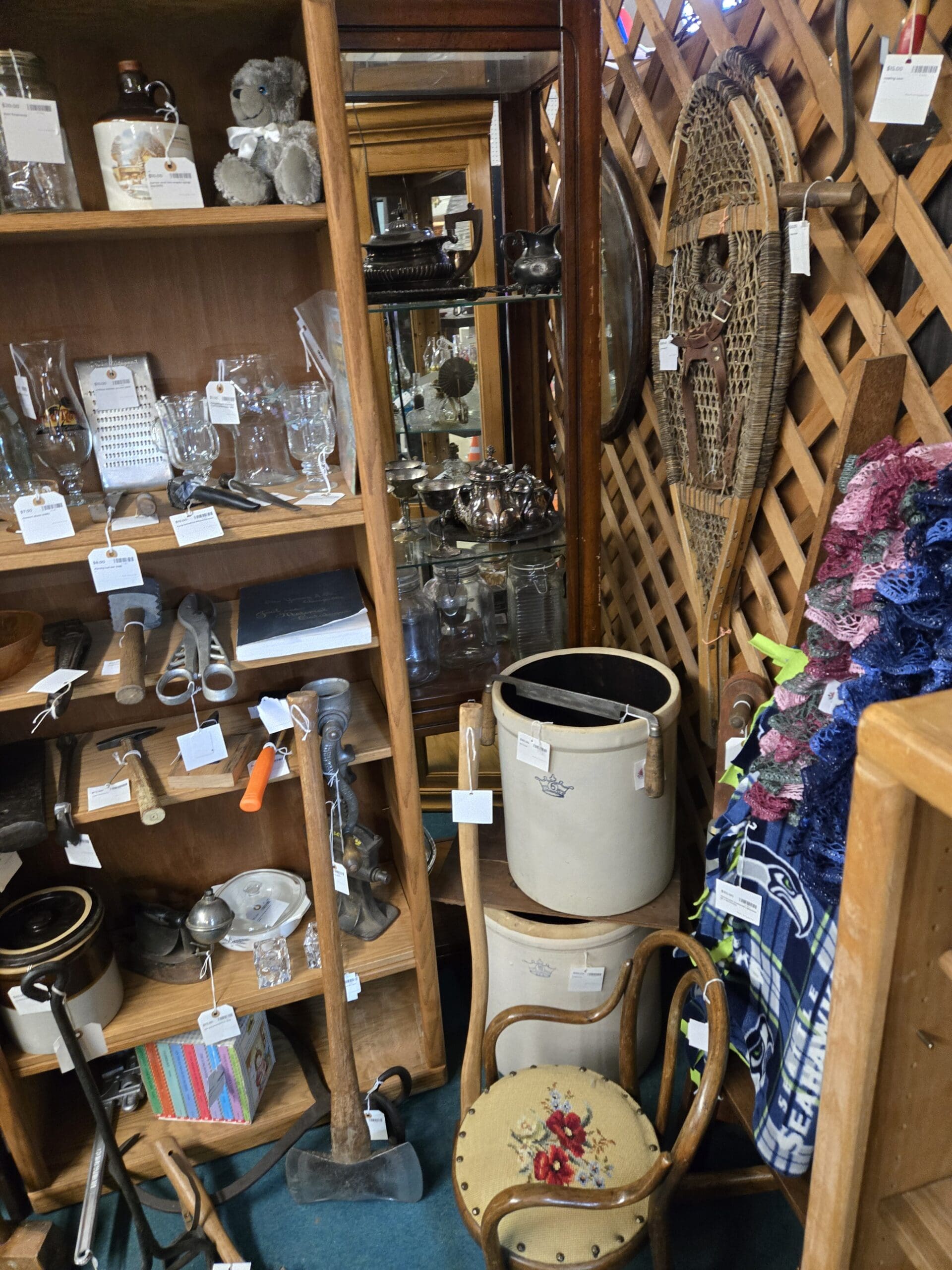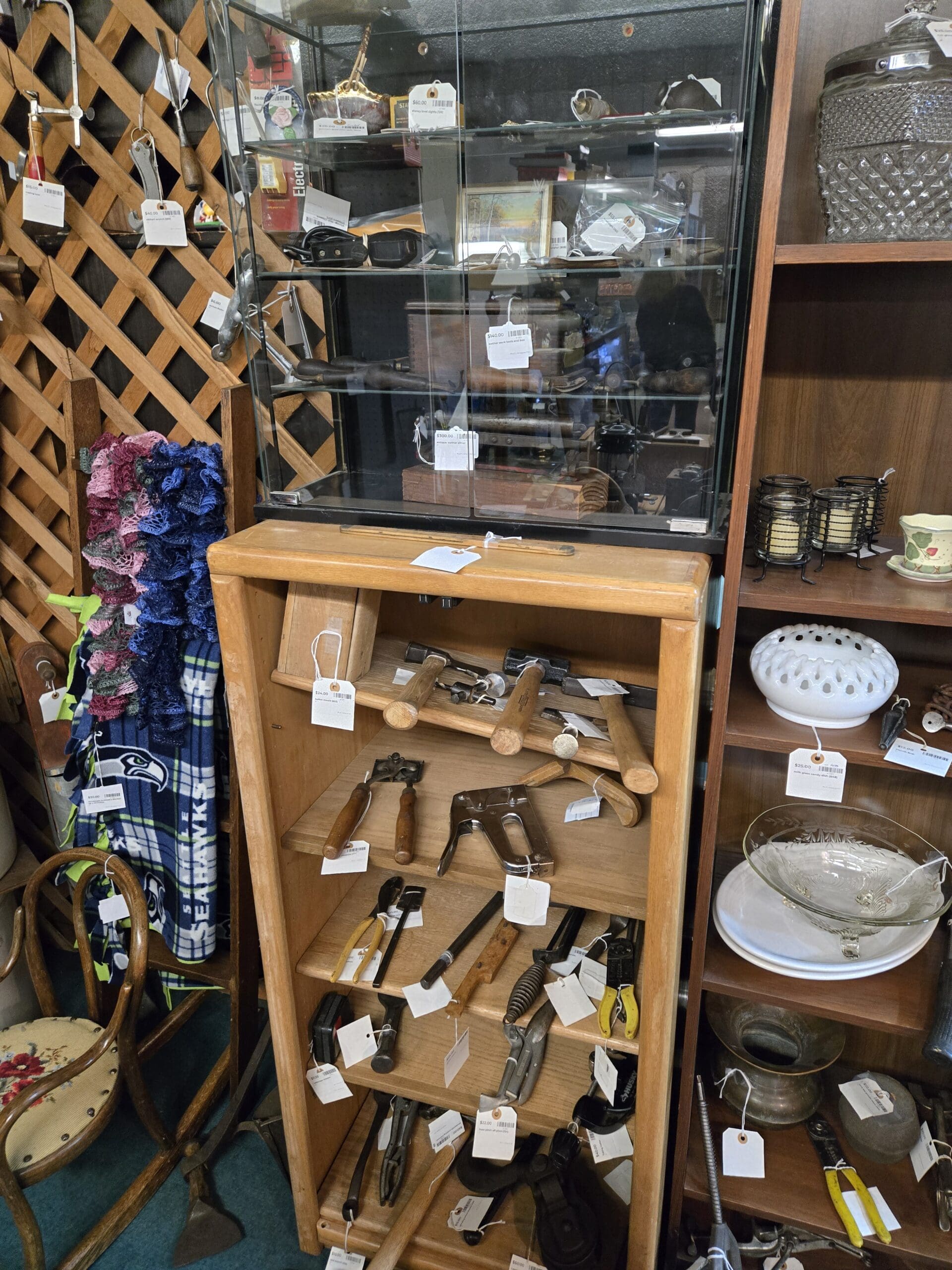 Tucked in among the tools and rustic wares you'll also spot a "Baker Country Honey" stoneware jug, hand-crocheted baby sweaters in pink, blue, and white, a black satin evening clutch, a Seahawks fleece scarf, a needlepoint-topped Victorian parlor chair, crystal candlestick holders, and an antique hand-crank bench grinder topped with an iron spoke wheel. Shop 57 is the kind of place where you can pick up vintage carpenter tools like a hundred-year-old drawknife and a delicate crystal vase in the same visit. For more rustic Americana, check out Shop 31 or browse the eclectic finds at Shop 68.