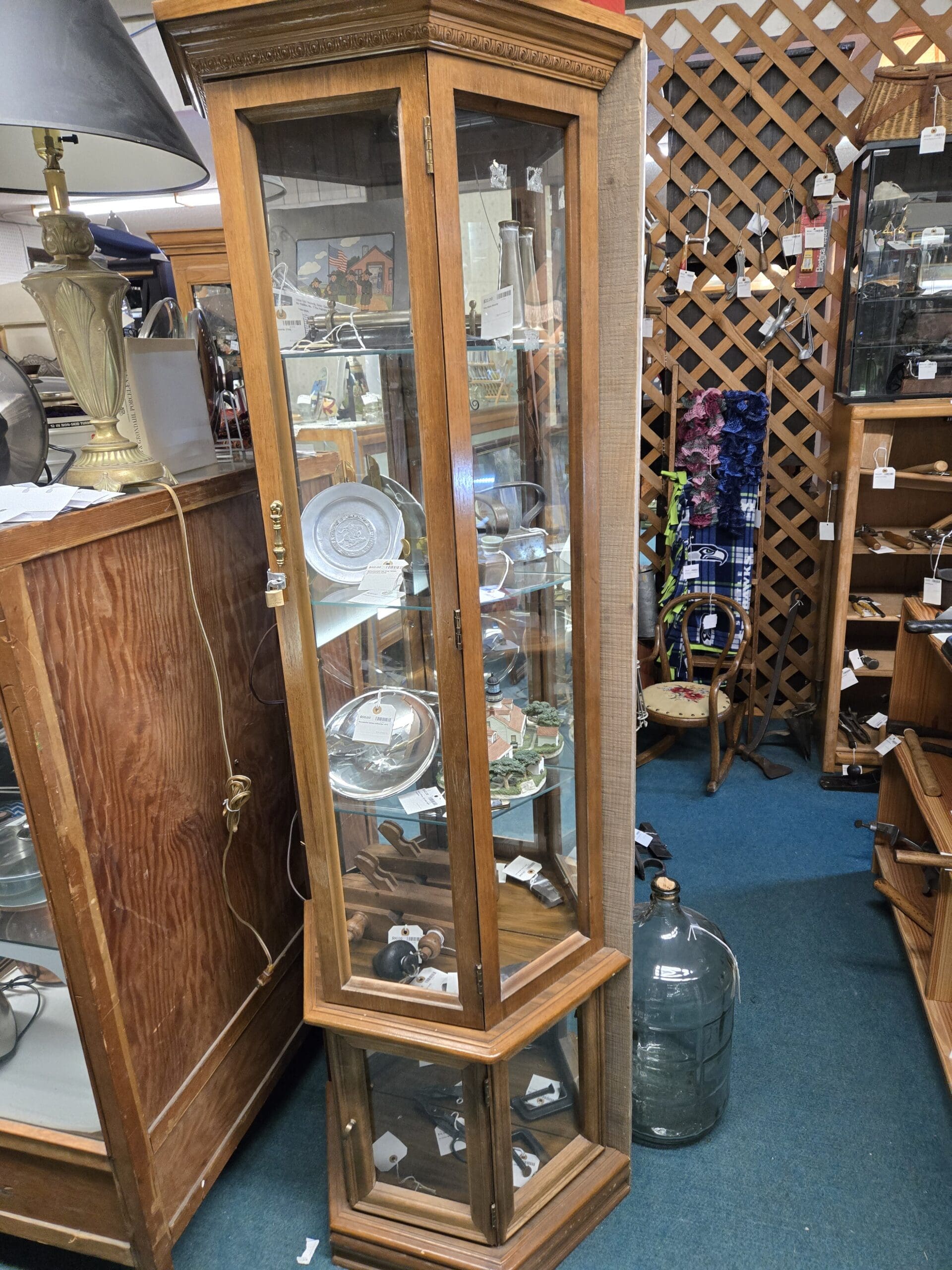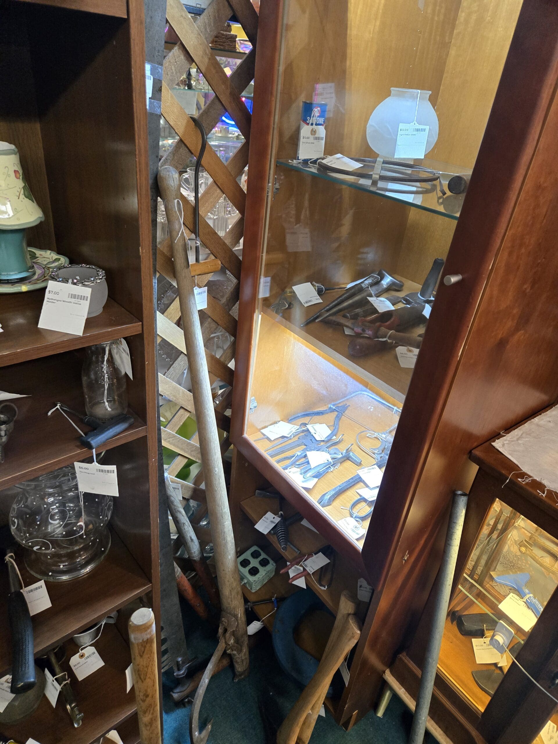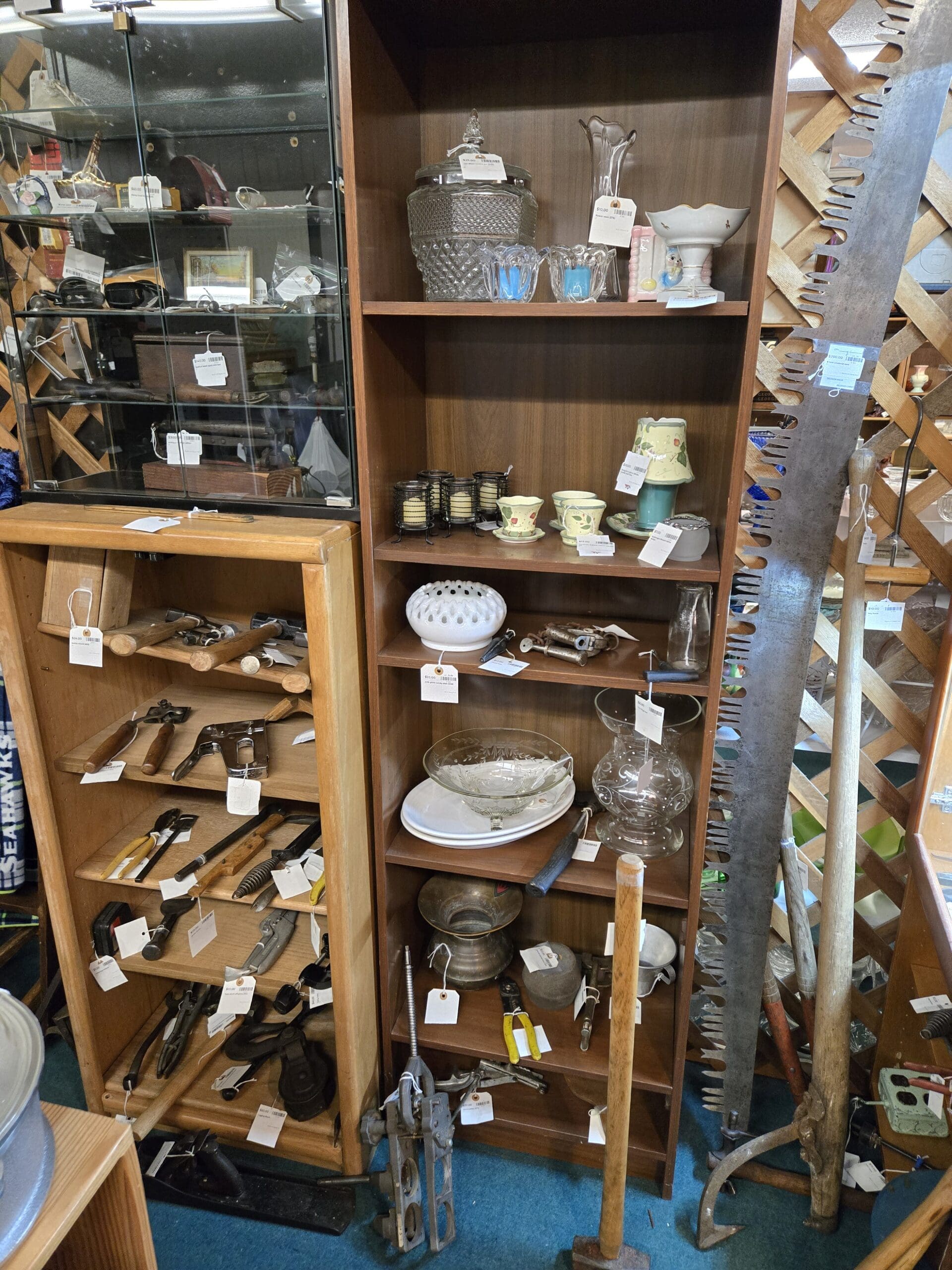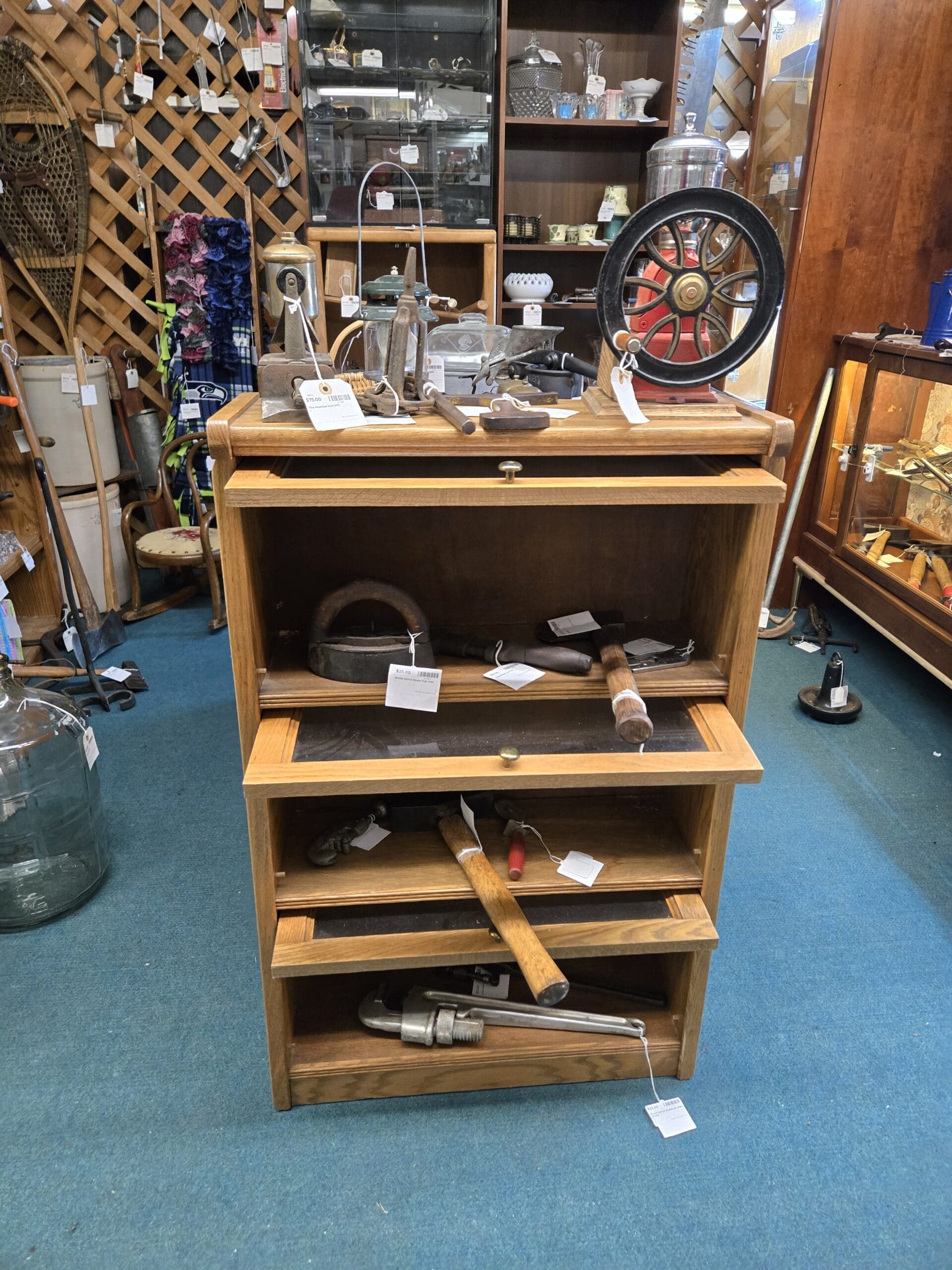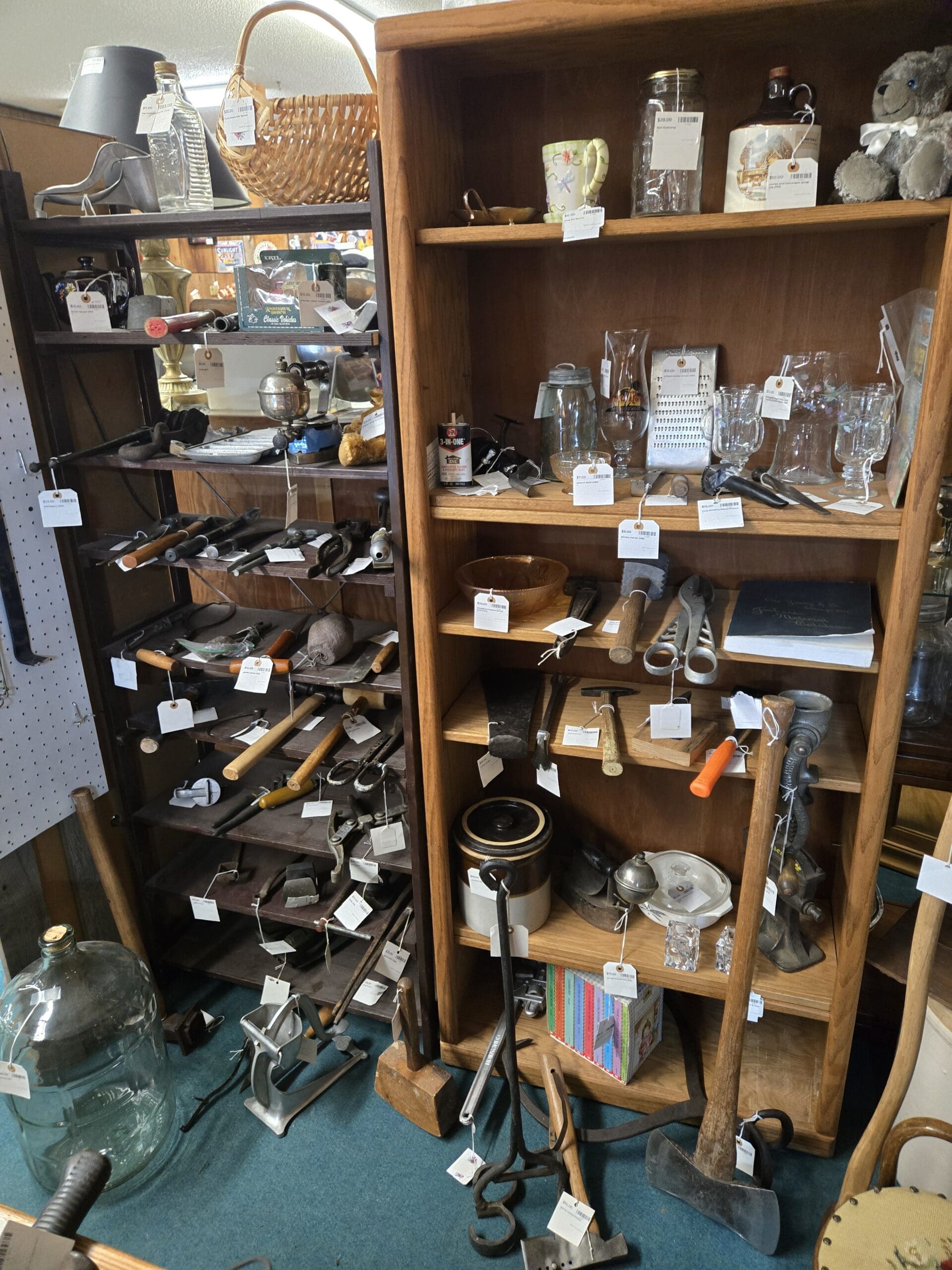 Shop 57 is a hands-on haven of antique tools, cast iron vises, and hand planes alongside a stoneware crock, glass carboy, hobnail milk glass, and a handsome oak leaded-glass cabinet.