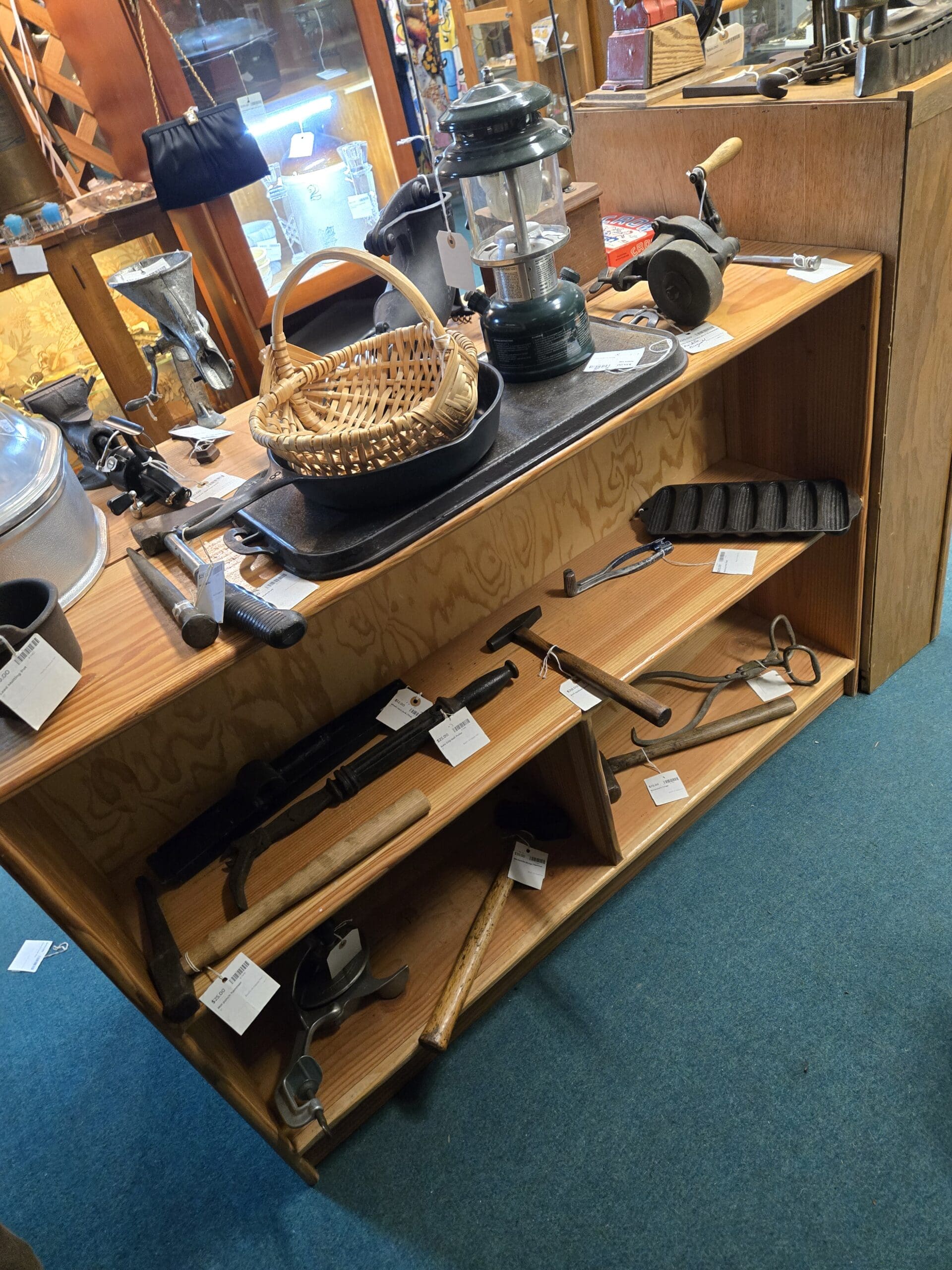 Shop 57 is filled with antique farm and kitchen primitives including cast iron corn shellers, hand-crank meat grinders, blacksmith tongs, a cobbler's shoe last, and vintage canning supplies.