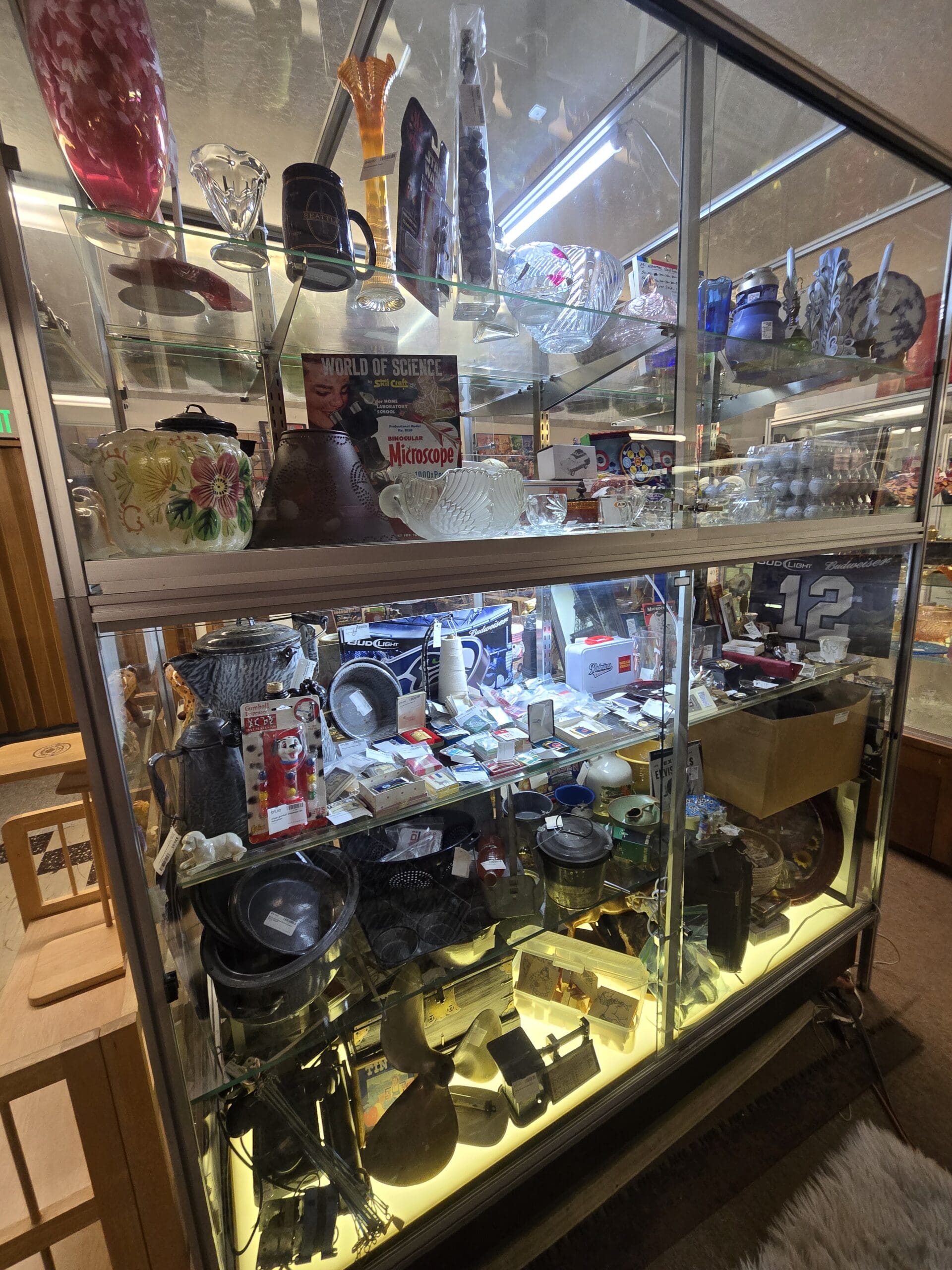 Visit Shop 62, where the shelves pack a wild variety into a compact space. Glassware collectors will spot cranberry pink vases, cobalt blue bowls and mugs, a flow blue plate, cut crystal bowls, and a ship's decanter alongside rows of clear glass egg cups and candlesticks. A hand-painted floral cookie jar, white swan-shaped milk glass creamer, and an amber art glass vase catch the eye up top. A vintage "World of Science" binocular microscope kit in its original box and a colorful tabletop target shooting game bring retro toy appeal.