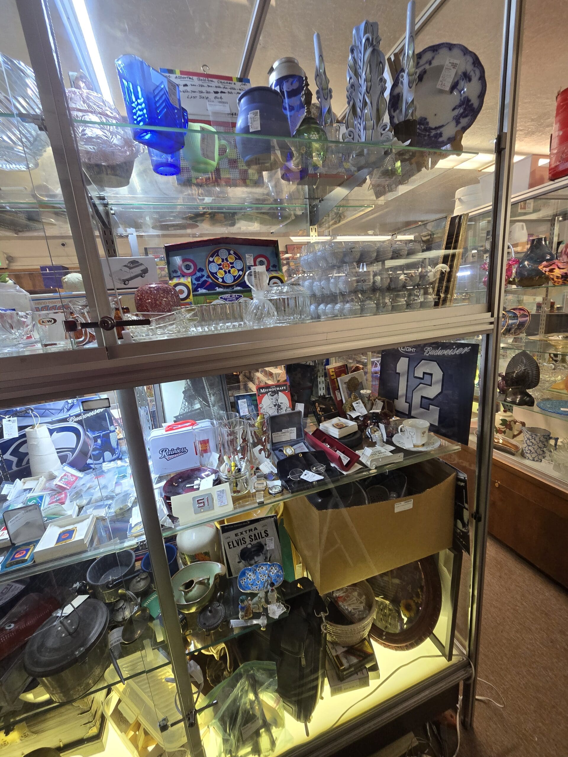Pacific Northwest pride runs through the mix with a Bud Light Budweiser #12 jersey, Seattle Seahawks banners, and a Rainier Beer mini cooler. Elvis memorabilia including an "Elvis Sails" newspaper headline sits near a cloisonné dish, vintage eyeglasses, and jewelry in velvet boxes. You'll also find graniteware camping pots and pans, a pewter coffee pot, cast iron skillets, brass items, an A&W root beer bottle, and a Microcraft hobby kit. Shop 62 is the kind of spot where something catches your eye no matter which direction you look.