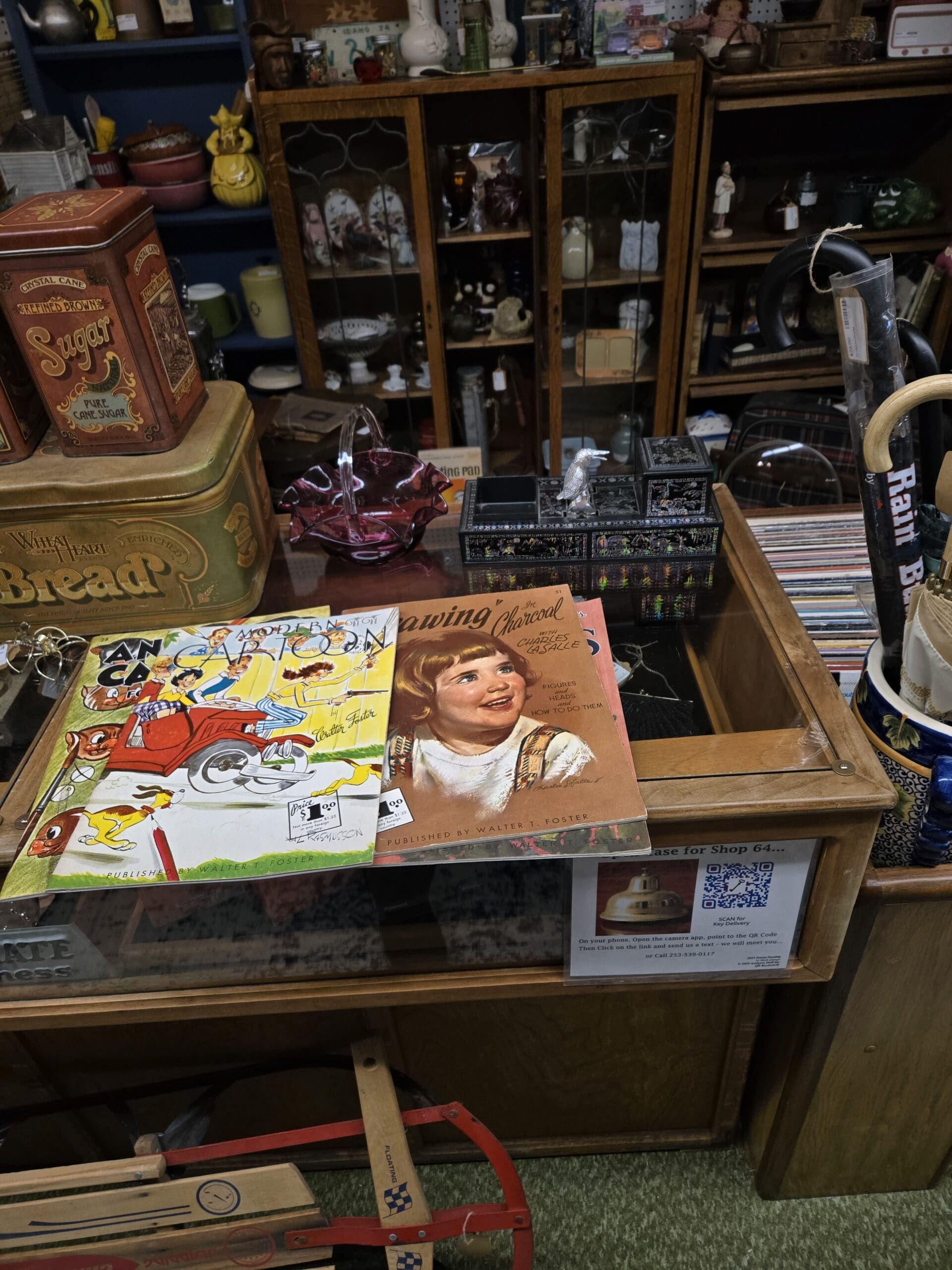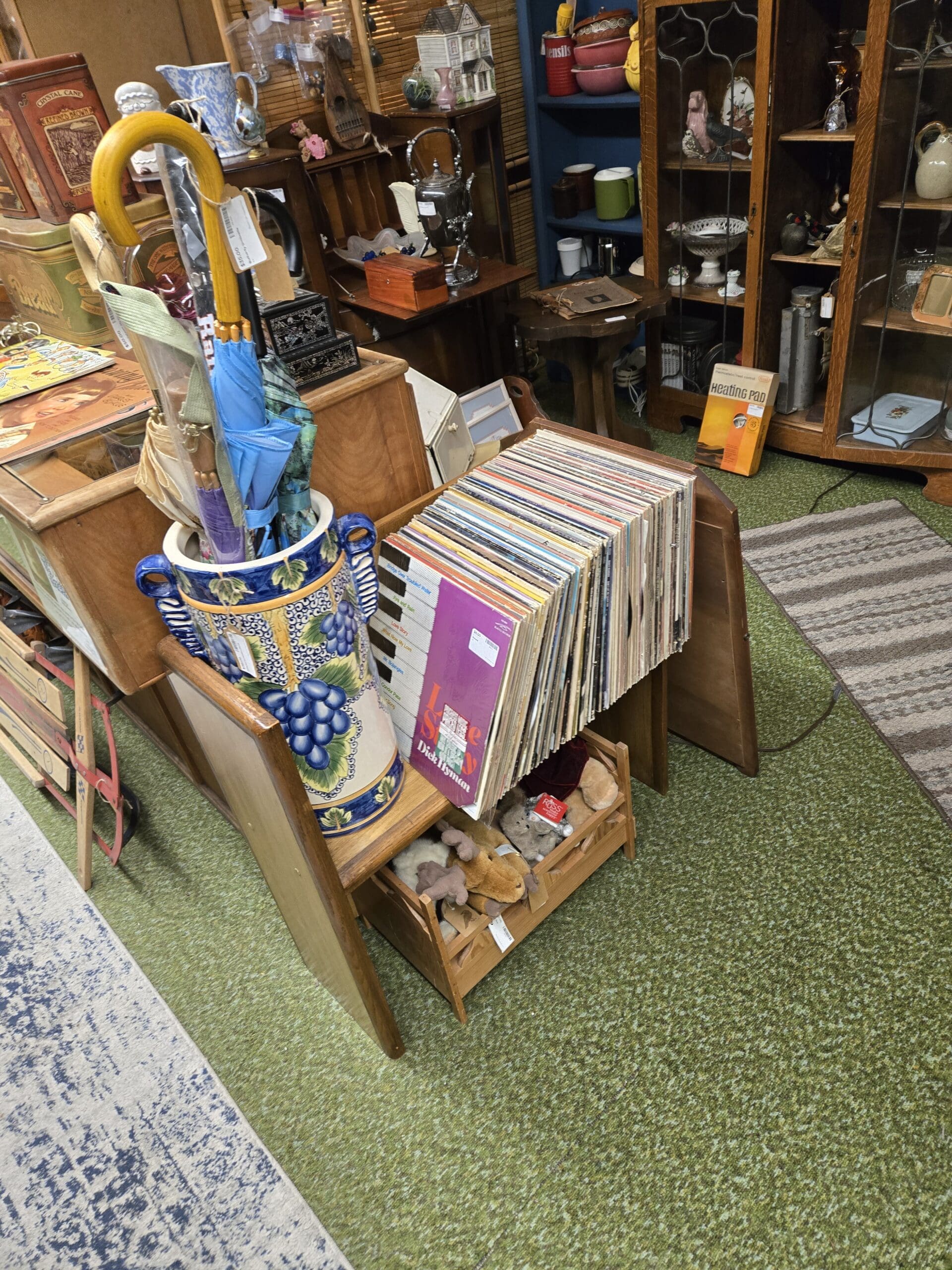 A wooden magazine rack brimming with vinyl records sits beside a hand-painted Italian grape-motif vase doubling as an umbrella stand. Nearby, a beautiful silver-plated tilting tea kettle on its stand gleams atop a mid-century radio cabinet, flanked by a blue-and-white transferware pitcher and a miniature Victorian dollhouse. Walter Foster art instruction books on cartooning and charcoal drawing rest on a glass-top table alongside vintage advertising tins for Golden Harvest Flour, Crystal Cane Sugar, and Wheat Heart Bread. A tray of vintage costume jewelry brooches in silver and crystal catches the light beautifully.