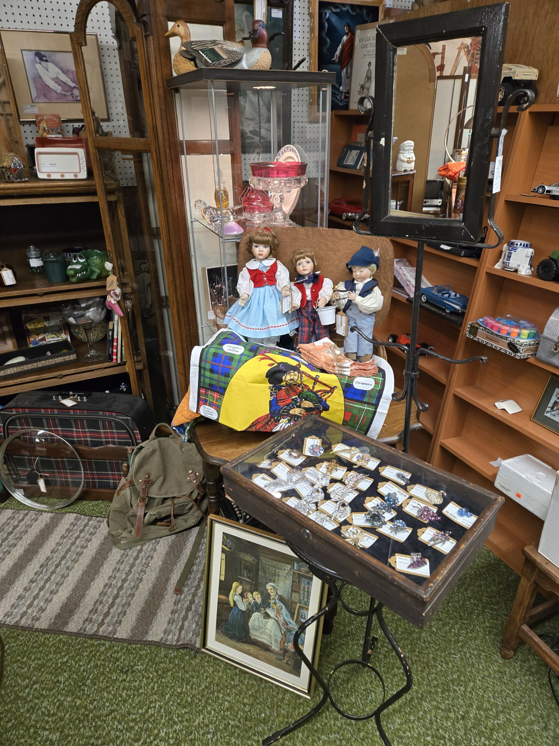 Porcelain dolls in Bavarian-style outfits stand next to a plaid tartan suitcase, a canvas military-style rucksack, and a carved wooden duck decoy. A retro-style radio, a wooden nutcracker figure, an Audrey Hepburn coffee table book, framed prints, and patchwork quilts all add to the cozy, collected feel. Shop 64 is the kind of place where every shelf tells a different story.