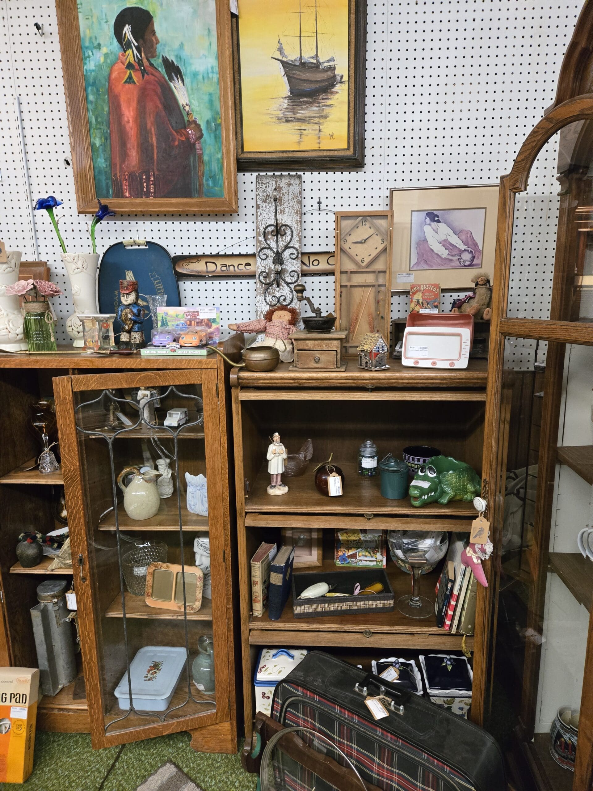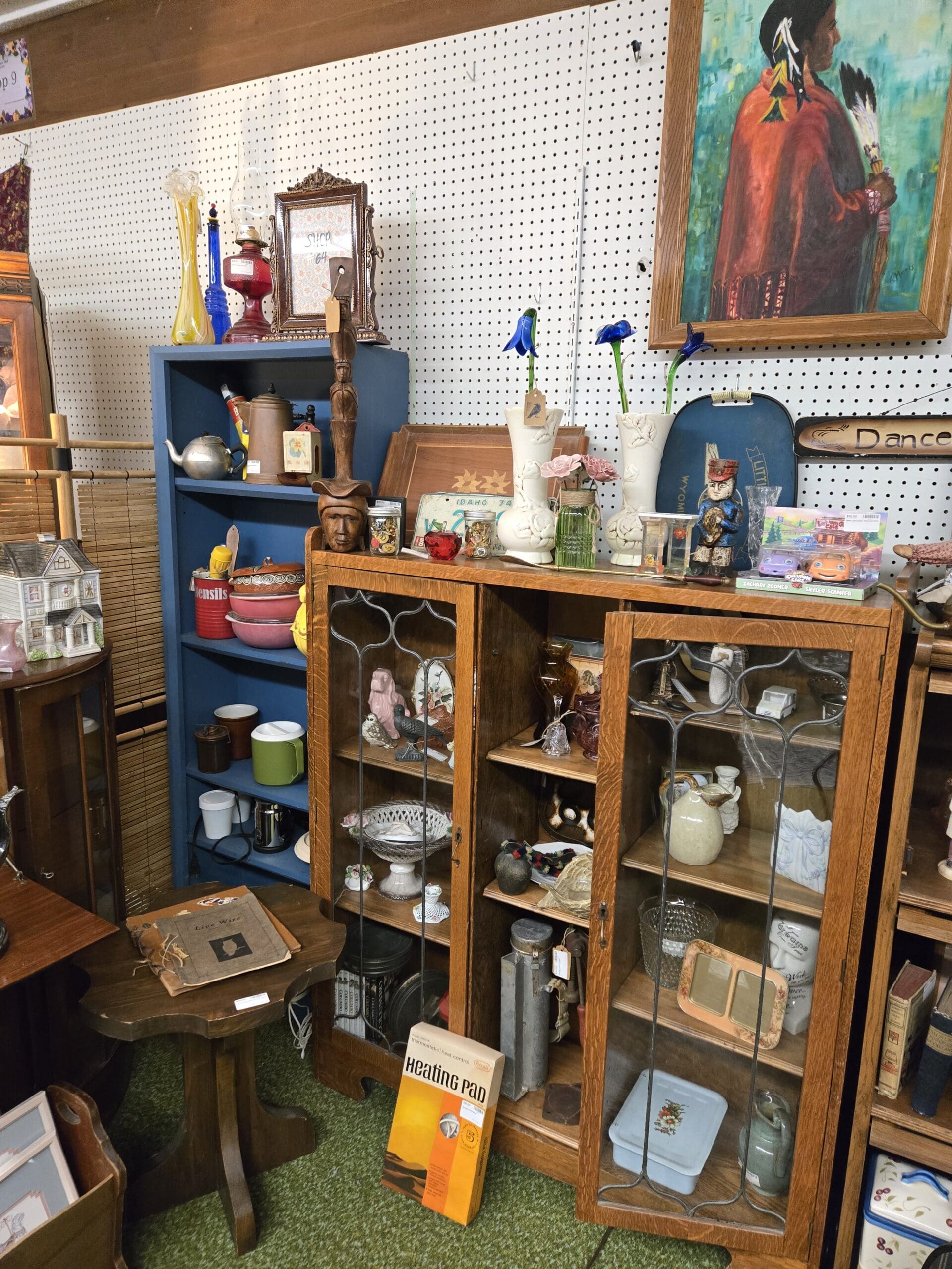 Visit Shop 64, where a warm, layered mix of vintage furniture, art, and collectibles creates a space that rewards a slow browse. Original oil paintings hang high on the walls, including a striking portrait of a Native American figure in a red blanket and a golden-toned sailing ship at sunset, setting a tone of color and history. Below them, oak barrister bookcases and leaded-glass cabinets hold an eclectic assortment of stoneware crocks, pink Depression glass, blue and white Delft-style pitchers, ruby red glassware, amber bottles, and a whimsical green ceramic alligator. A carved wooden cowboy bust watches over a shelf stacked with colorful nesting bowls, a red enamel "Utensils" canister, and vintage Idaho and Wyoming license plates.