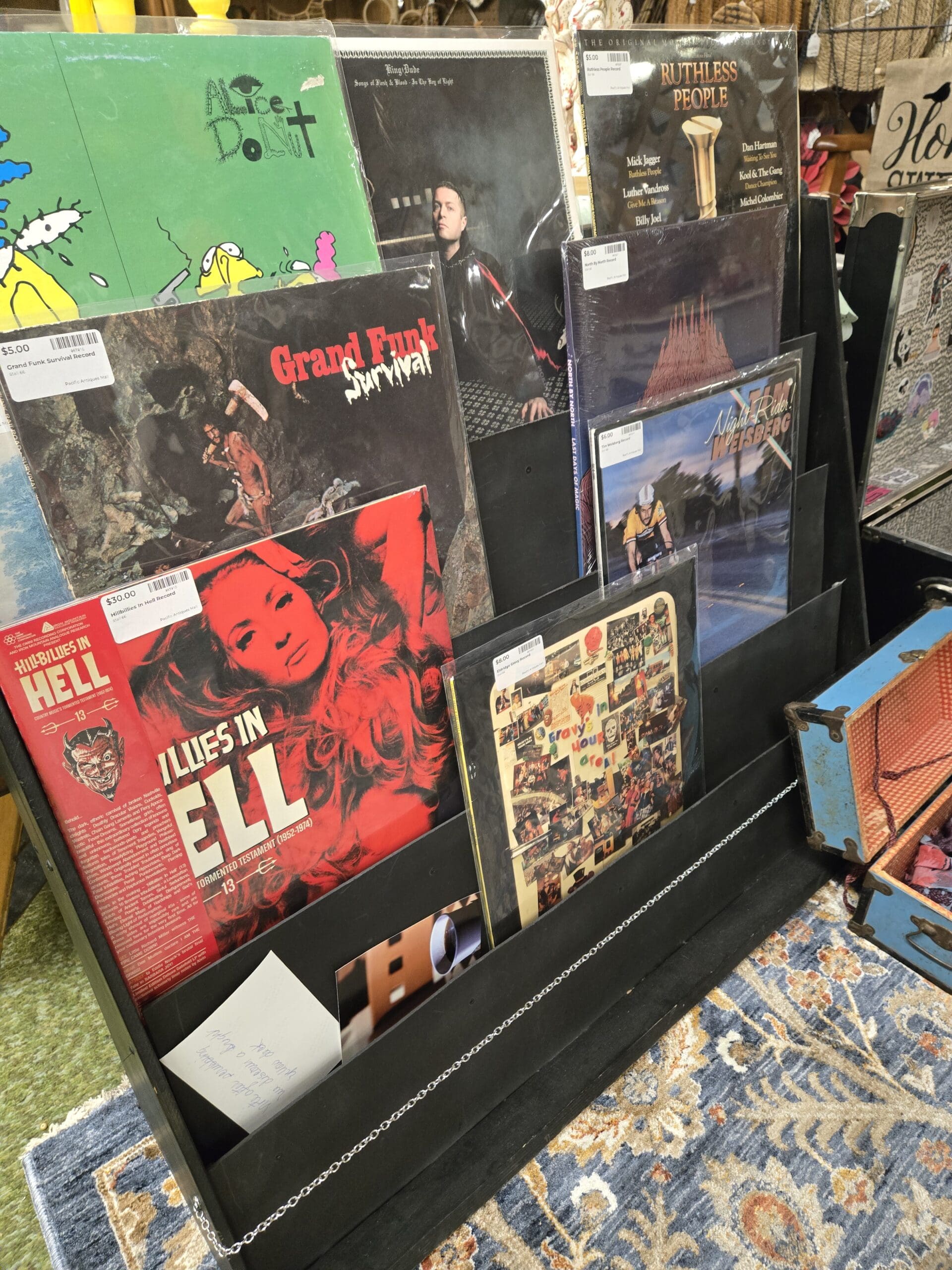 Visit Shop 66, where the vibe is bold, eclectic, and unapologetically fun. Vinyl collectors will want to flip through the record display stacked with titles ranging from Grand Funk's Survival and the Ruthless People soundtrack featuring Mick Jagger and Billy Joel to Alice Donut, Hillbillies in Hell, and Tim Weisberg's Night Rider. A shelf of cassette tapes adds to the music haul with names like Pink Floyd Live, Deep Purple, Cream, Carly Simon, The Otis Redding Story, Traffic, Asia, and Jeff Beck. Nearby, a sticker-covered black footlocker and a vintage suitcase overflow with scarves and clothing finds.