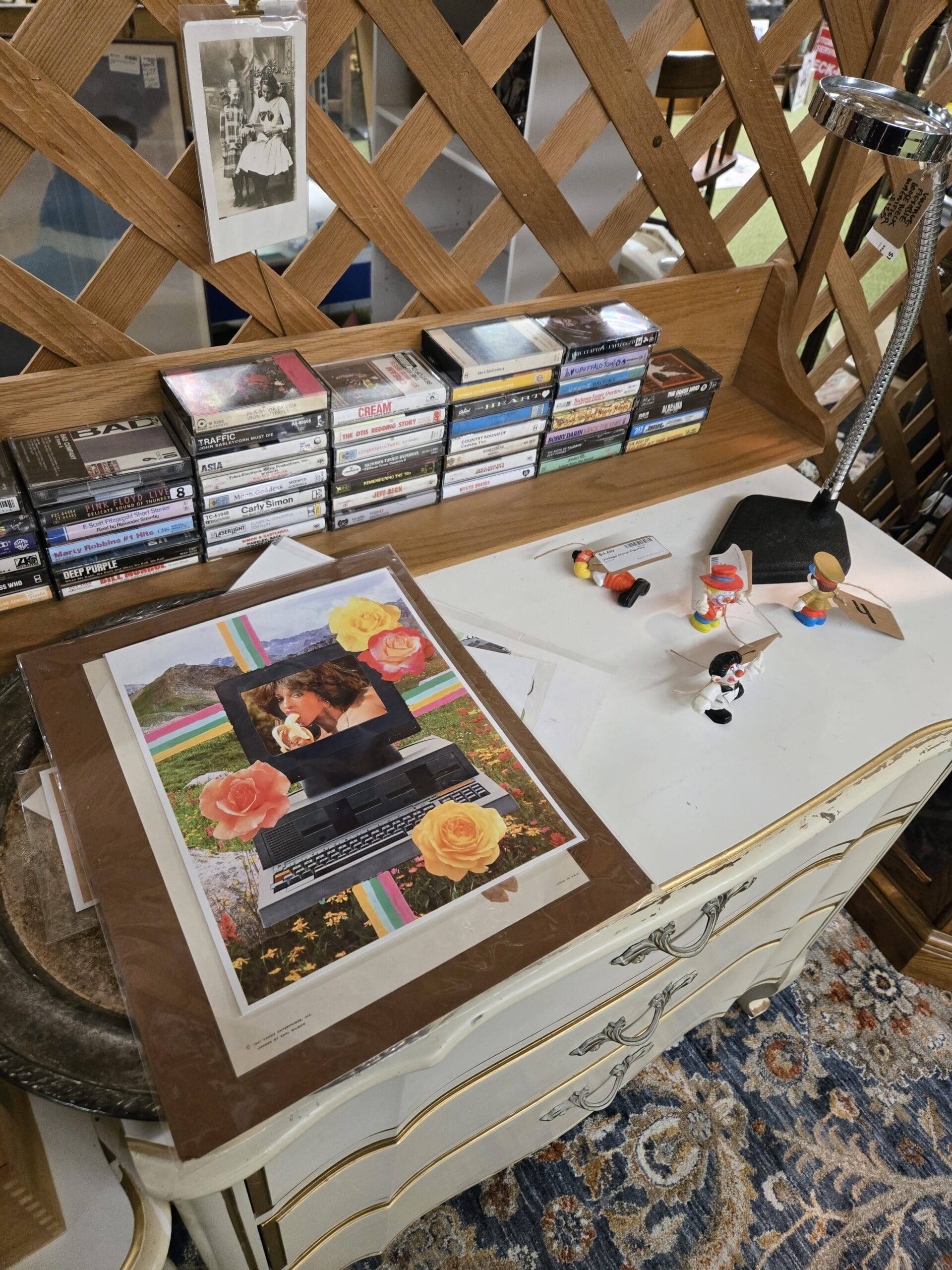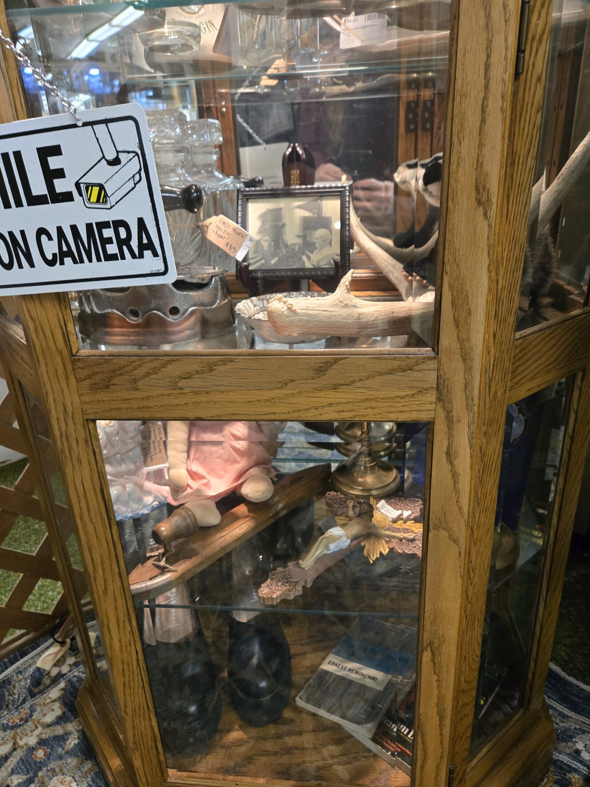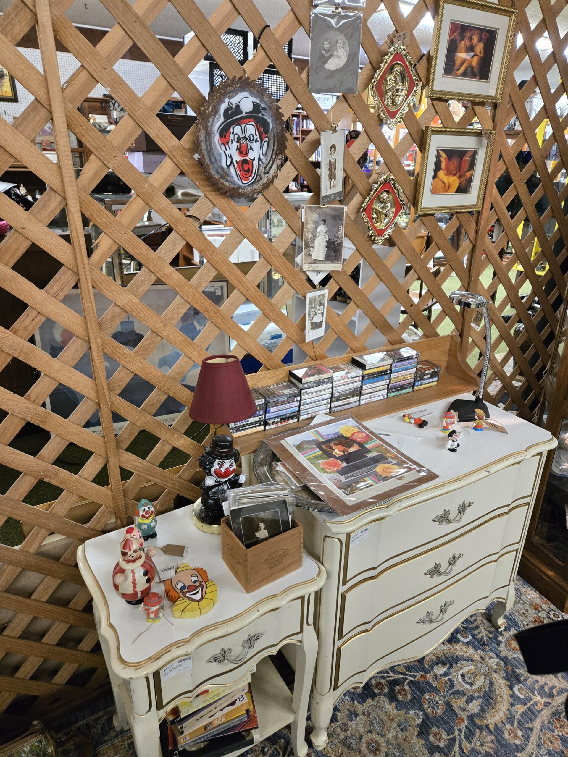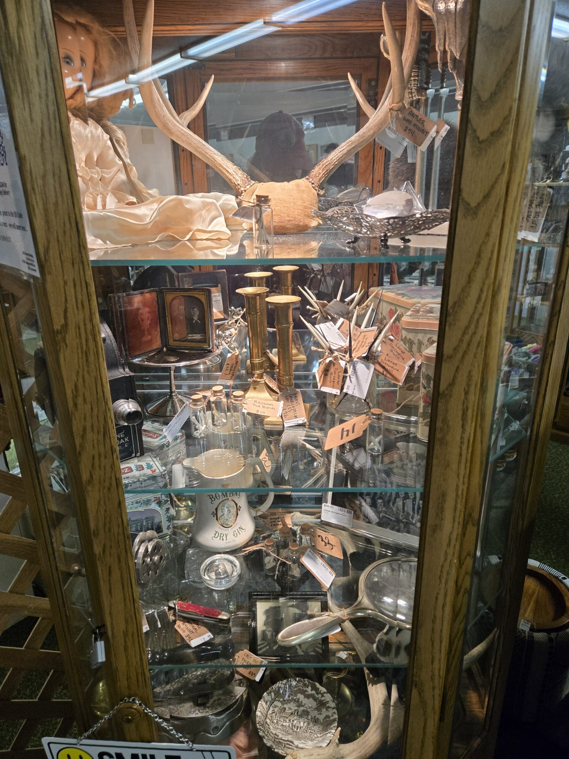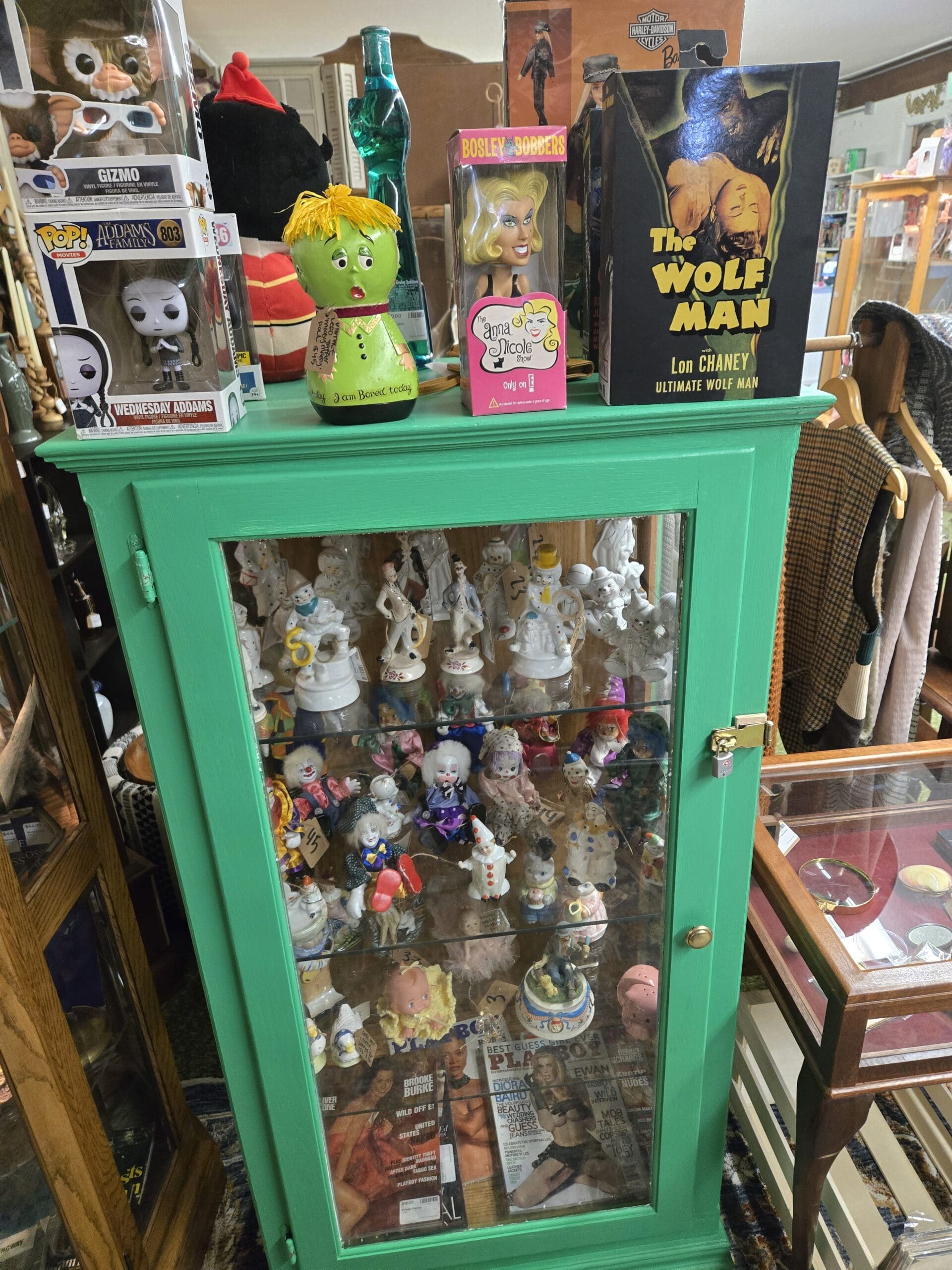 The curiosity factor is off the charts. A tall oak cabinet holds deer antler mounts, porcupine quills, a framed daguerreotype portrait, brass candlesticks, a Bombay Dry Gin pub pitcher, pocket knives, apothecary bottles, silver vanity pieces, and an Ernest Hemingway paperback. Vintage photographs and gilded framed prints hang from the lattice walls alongside a mixed-media collage piece and a hand-painted clown on a circular saw blade. A bright green cabinet is packed with porcelain clown figurines, Kewpie-style dolls, and music box figures, topped with Funko Pop! boxes for Wednesday Addams and Gizmo, an Anna Nicole bobblehead, and a NECA Wolf Man Lon Chaney action figure.