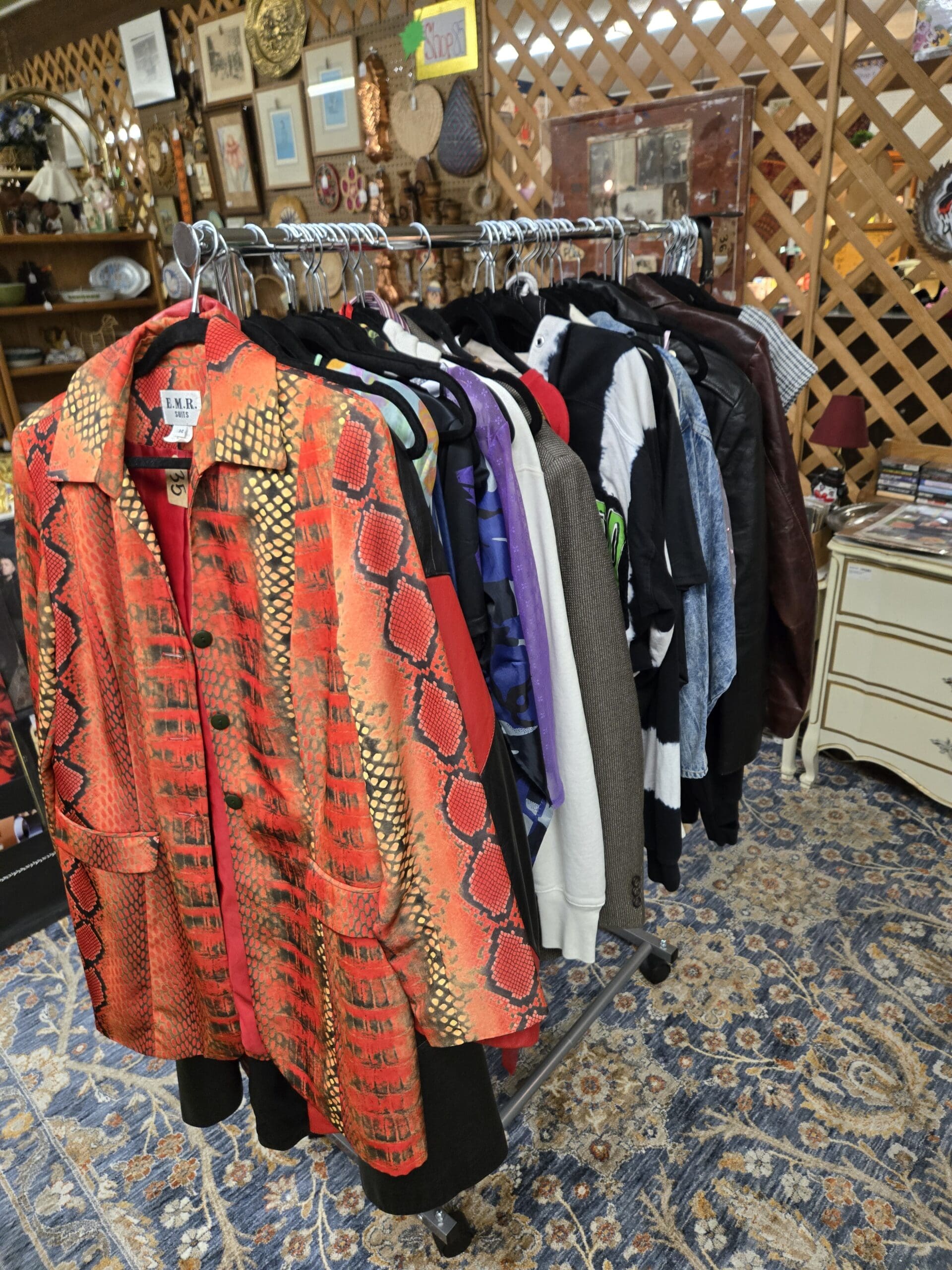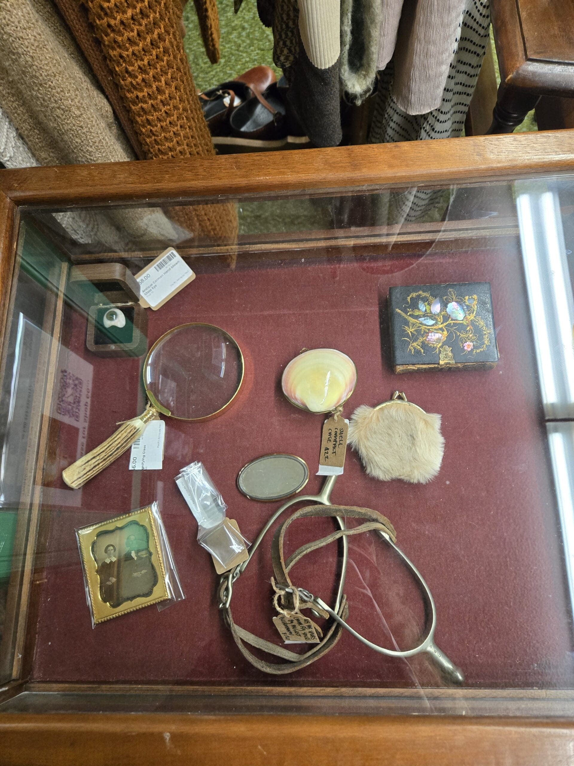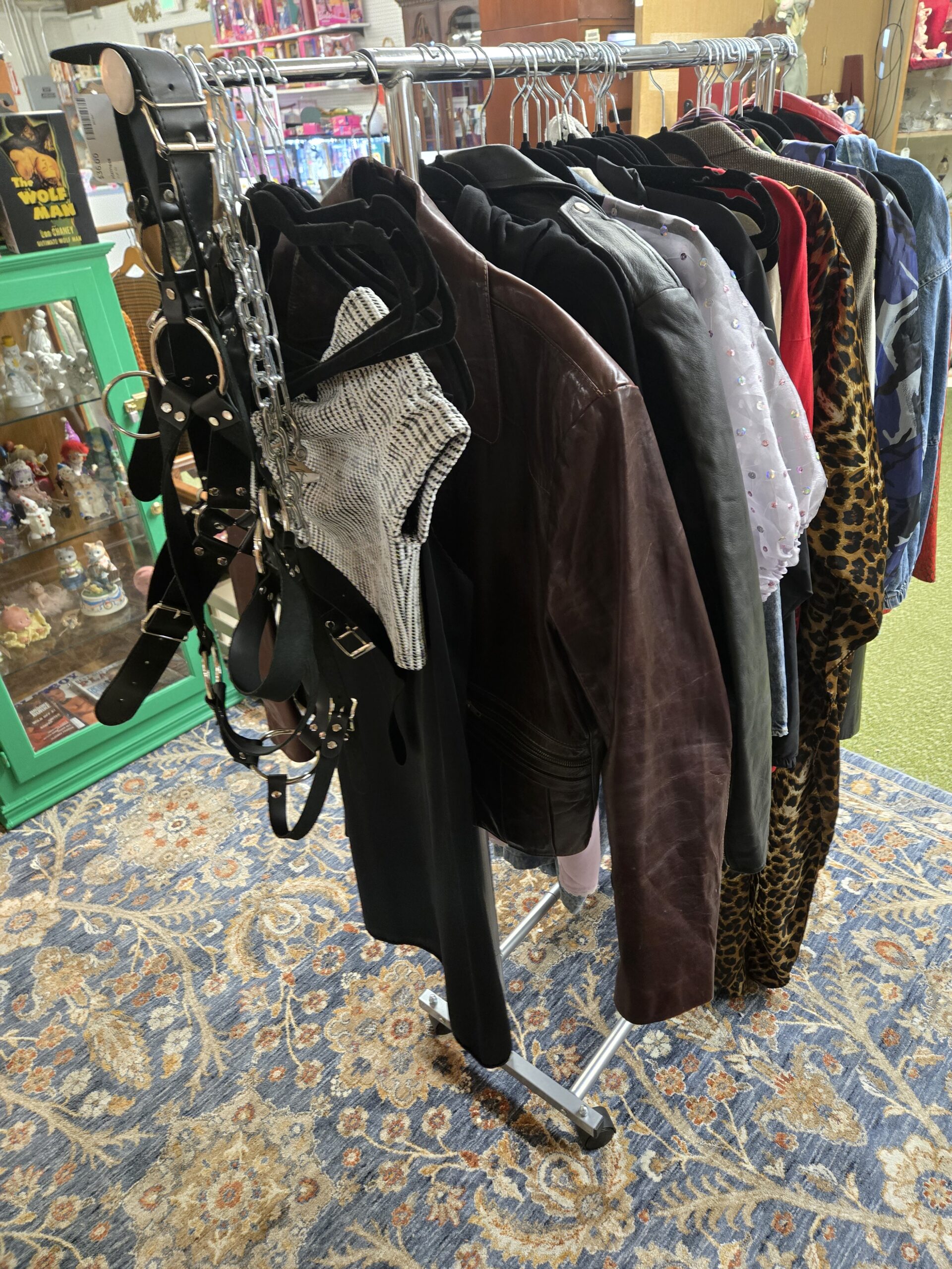 The clothing racks lean edgy and statement-making, with leather jackets in brown and black, a bold orange snakeskin-print blazer, leopard print pieces, a chainmail-style halter top, a black harness belt, cow-print items, and iridescent blouses. A velvet-lined case holds antique treasures including a shell compact, a fur coin purse, an antique glass eye, a brass magnifying glass with a carved bone handle, and a gold-framed daguerreotype. Vintage collage art prints and David Sedaris books on the nightstand confirm it: Shop 66 has serious personality.