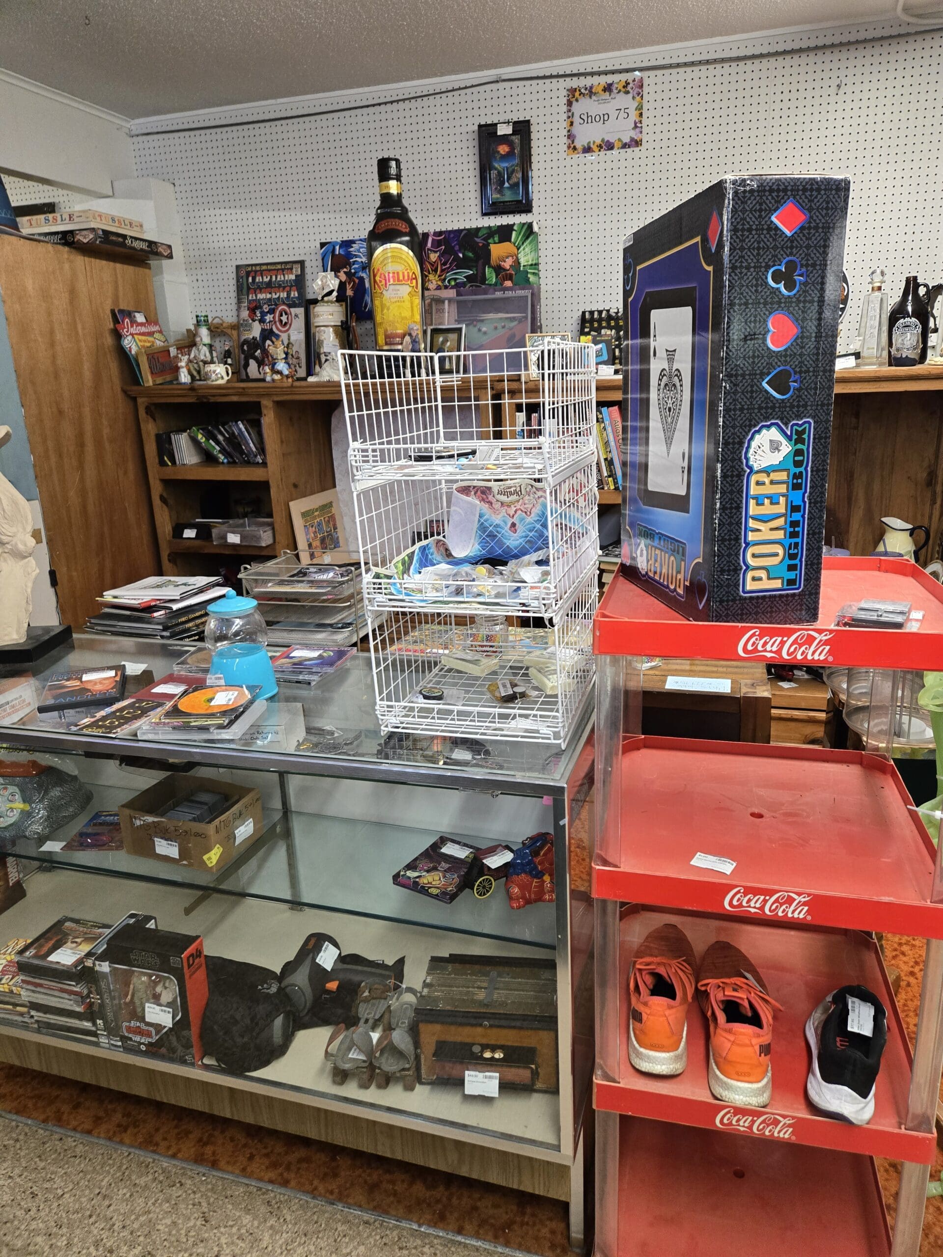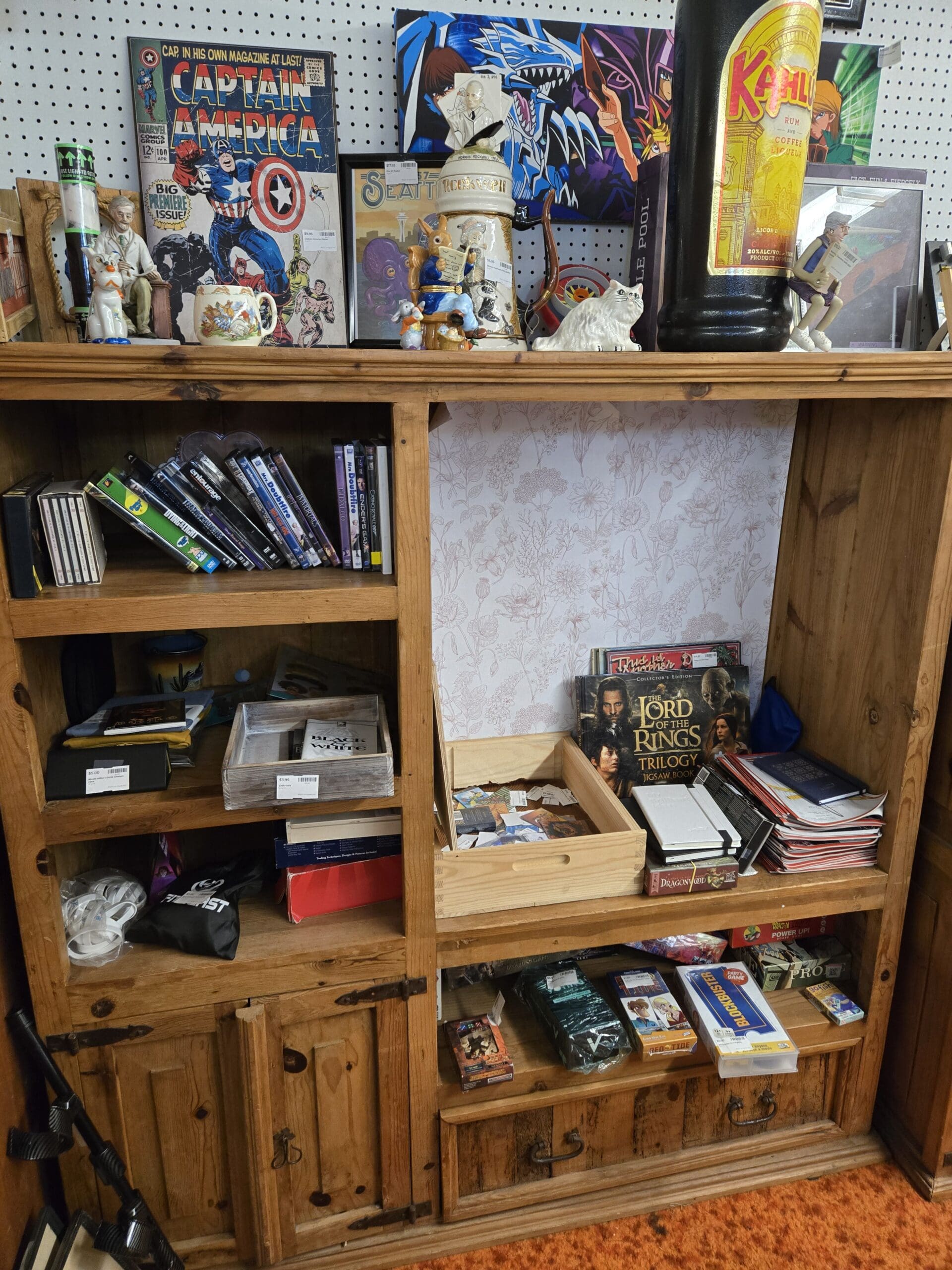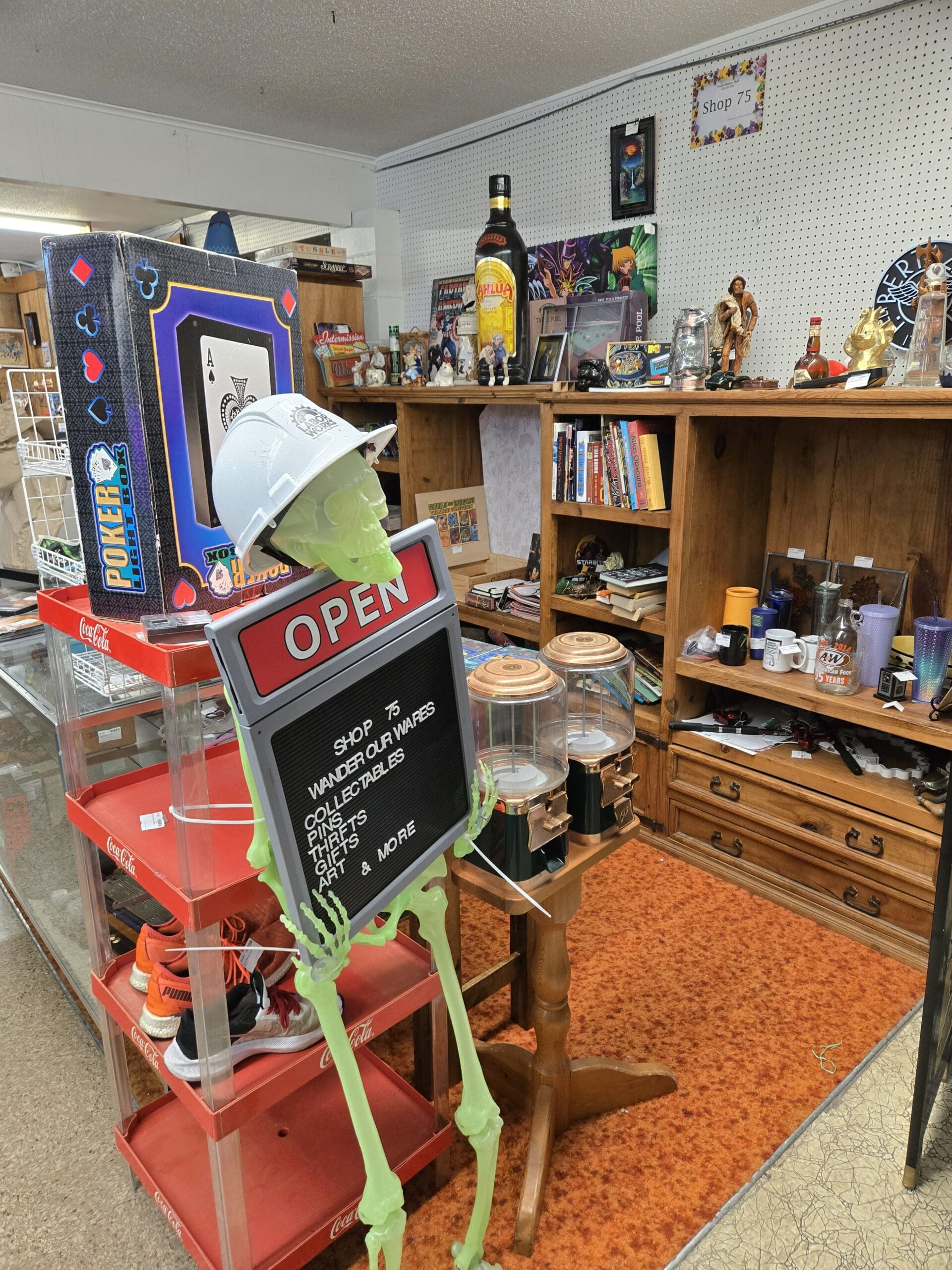 Visit Shop 75, where a glow-in-the-dark green skeleton in a hard hat holds the welcome sign and lets you know right away that this shop doesn't take itself too seriously. A big rustic pine hutch anchors the back wall, topped with a Captain America premiere issue poster, a Yu-Gi-Oh! Blue-Eyes White Dragon print, and a giant Kahlúa bottle repurposed as decor. The shelves below are loaded with DVDs, trading card games, a Lord of the Rings Trilogy jigsaw book, Blockbuster-era board games, and stacks of collectible card packs waiting to be dug through.