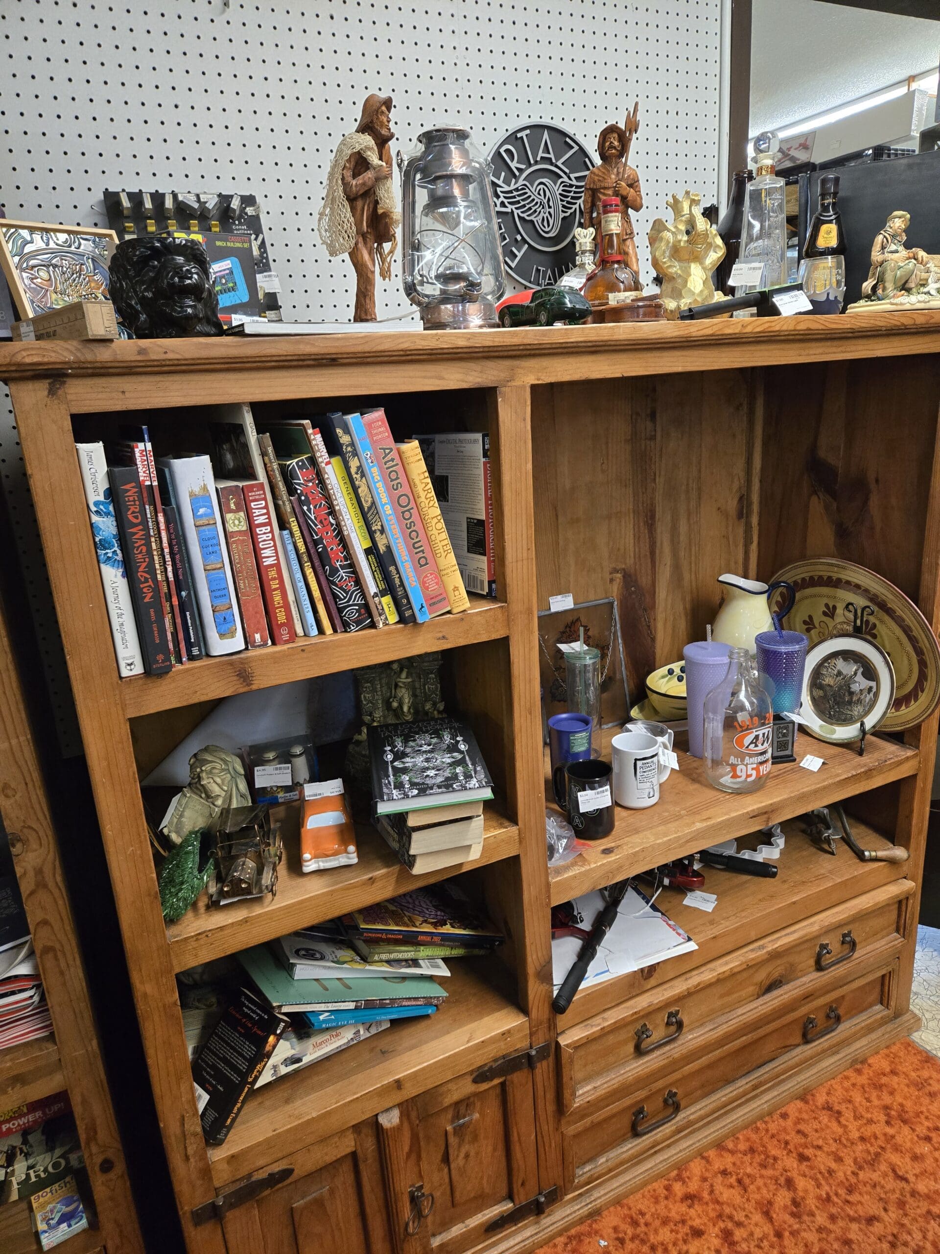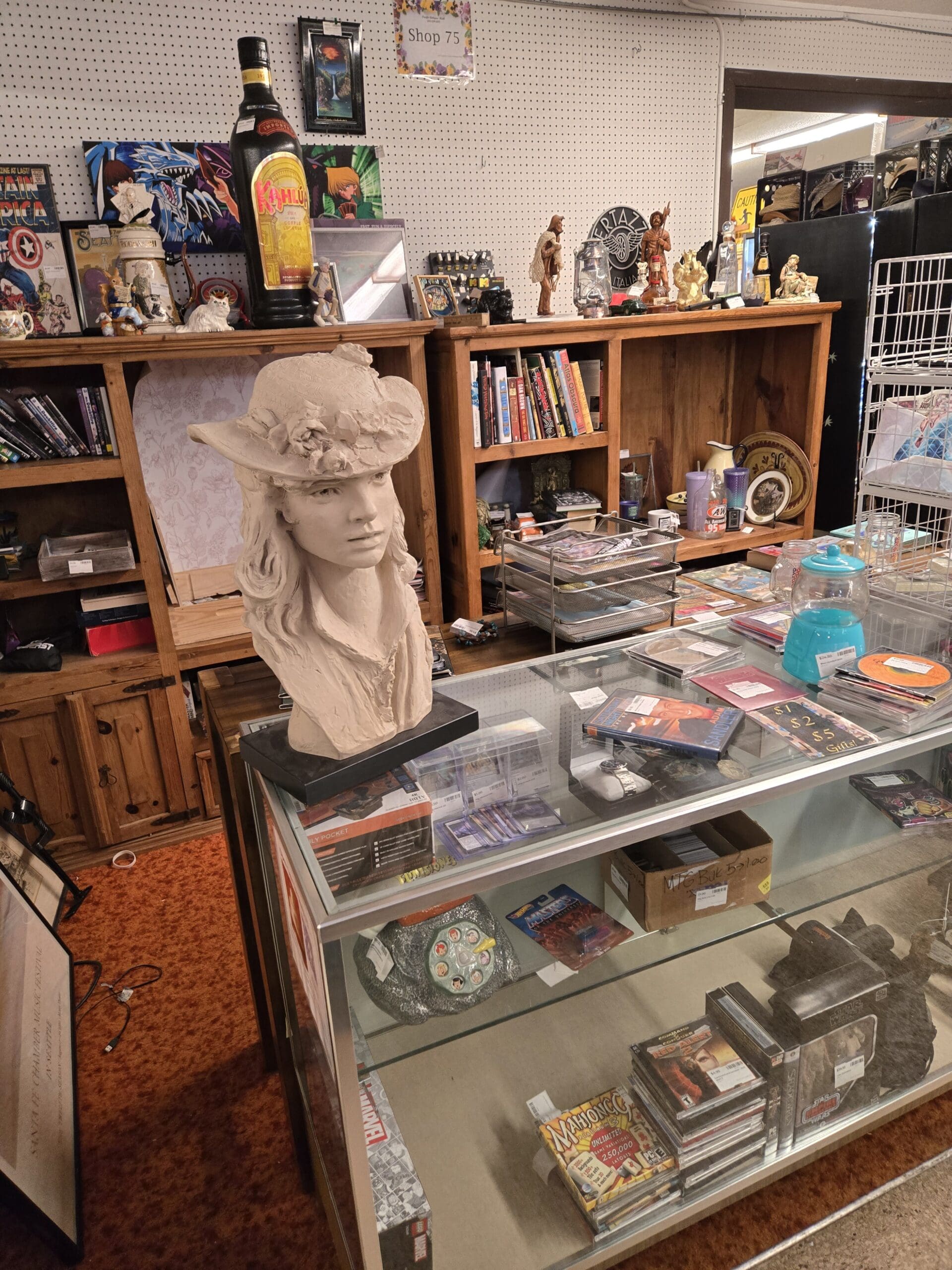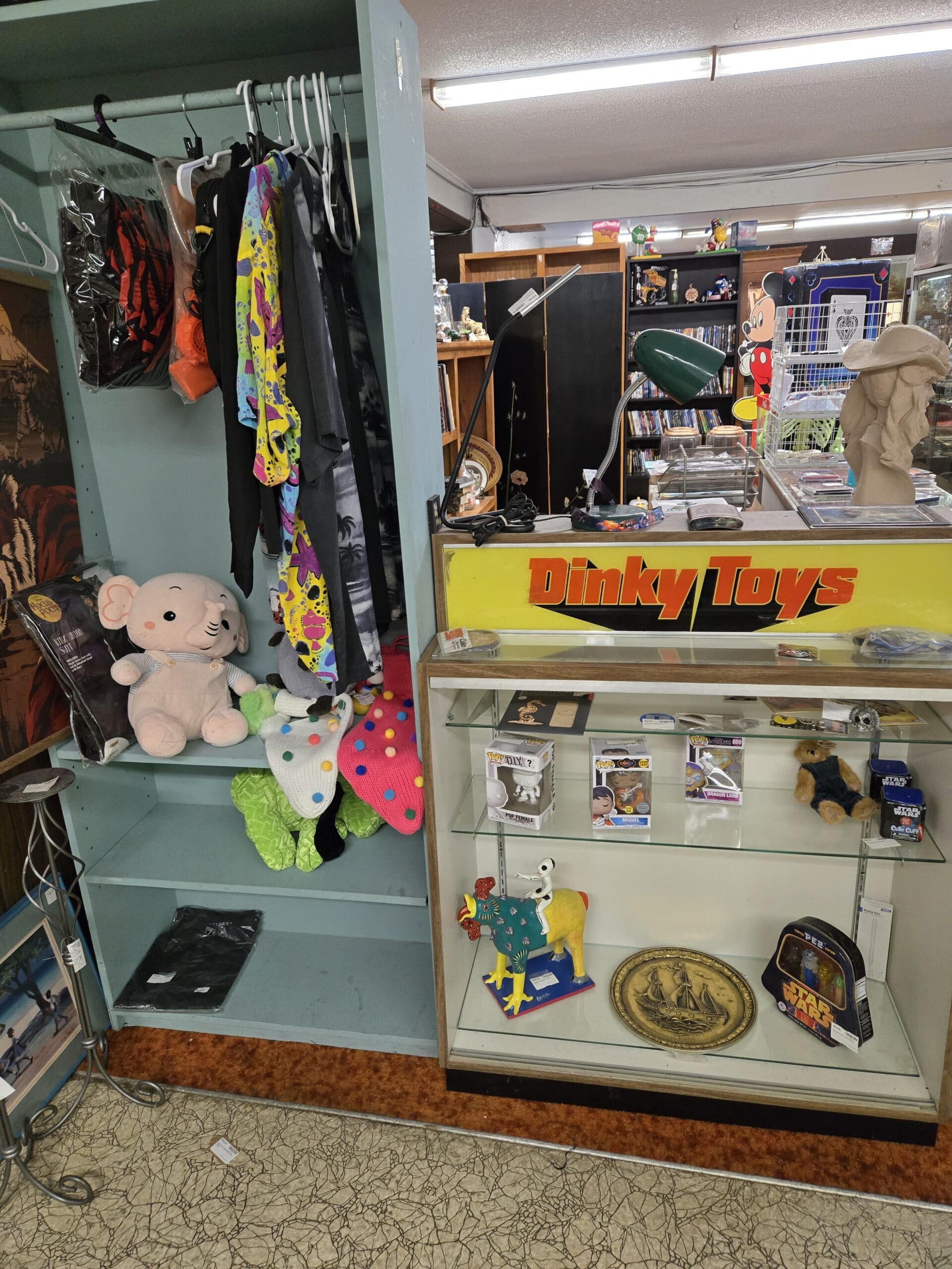 Books fill every available nook, with titles ranging from Dan Brown's The Da Vinci Code to Atlas Obscura, Weird Washington, and Harry Potter volumes. Carved wooden figures, an oil lantern, an A&W 95th anniversary mug, and a striking white clay bust of a woman in a floral hat add unexpected touches of art between the geekery. A closet rack holds colorful neckties and costumes, while a plush elephant and stuffed animals keep watch nearby. A vintage gumball machine stands guard by the entrance, and a Seattle Chamber Music poster hints at the eclectic taste behind it all. Shop 75 is the kind of place where you never leave empty-handed.